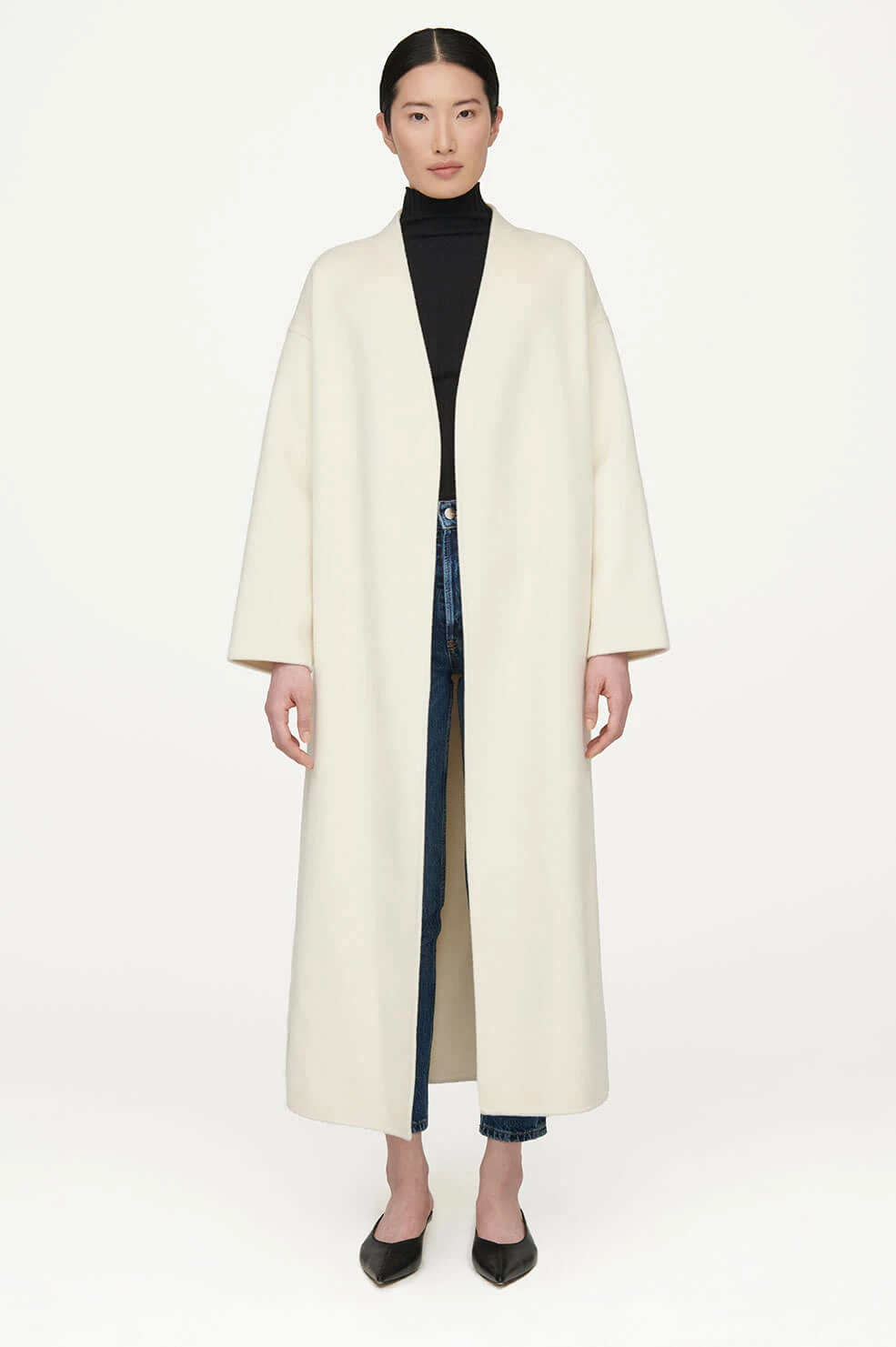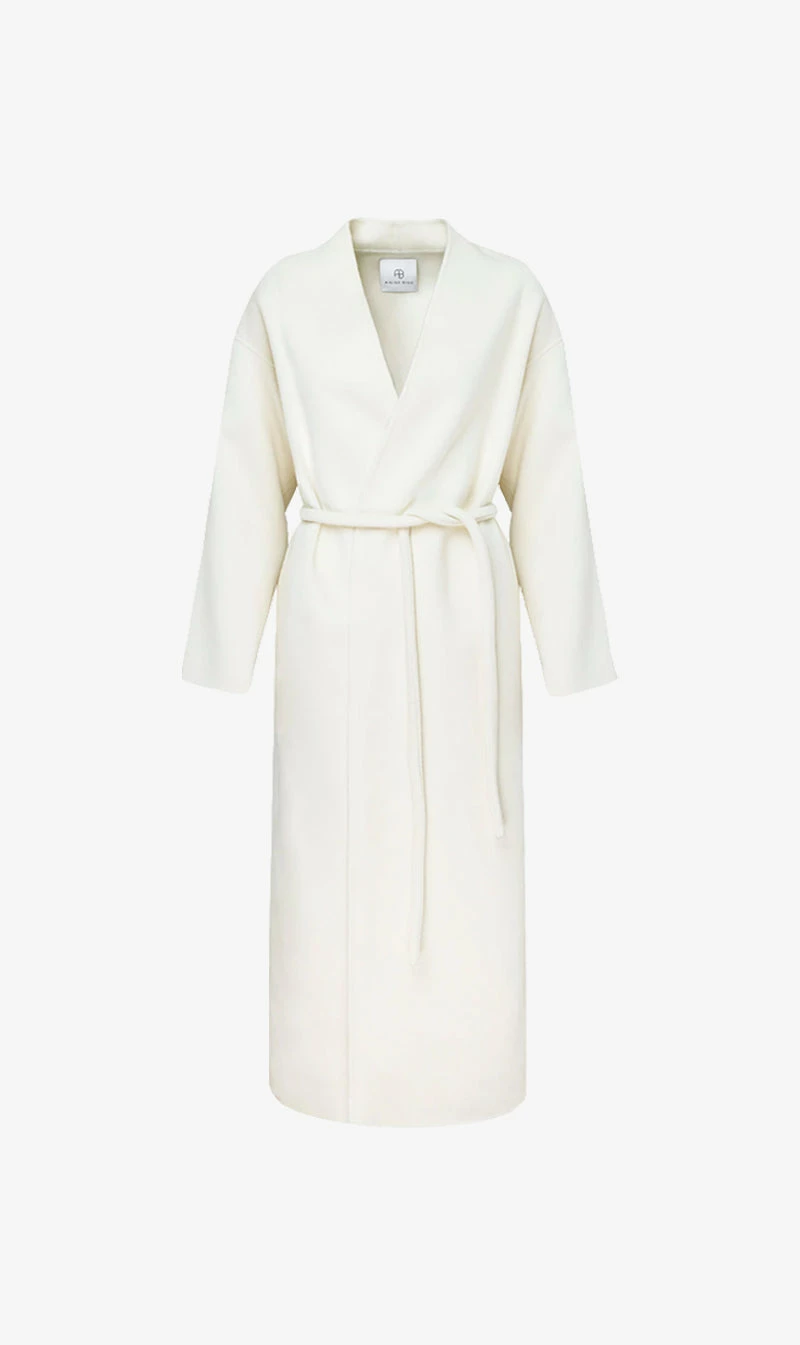 The Anine Bing Hunter Coats long, streamlined silhouette is finished with a turn-back hem for easy tailoring without compromising its intended fit and fabric quality. It’s a collarless, full-length style that is perfectly clean and simple, finished with flat on-seam pockets and an understated self-tie belt at the waist. The Hunter Coat is crafted in the same luxurious wool-cashmere blend as the best-selling Dylan Coat from the Classics Collection, but in soft, muted ivory.