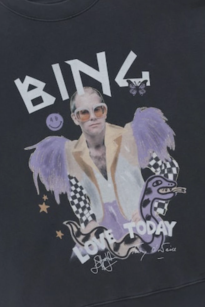 In collaboration with Terry O’Neill and @IScreamColour, Anine Bing deliveres this limited edition Lili Tee features a digitally-printed image of Elton John accented by quirky illustrations and pops of color. The best-selling Lili Tee is crafted from lightweight jersey with worn-in, vintage character in washed black.