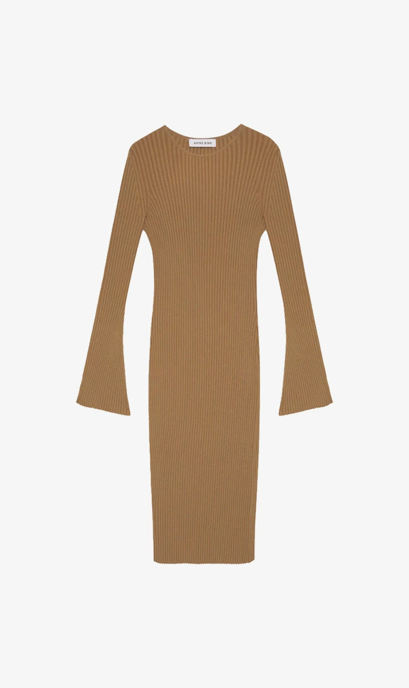 The Anine bing Sias Dress in Camel. A rib knit midi dress featuring wide sleeves.