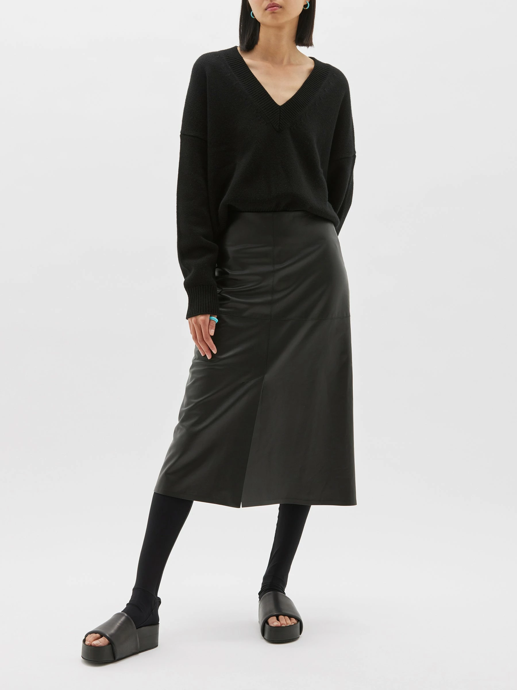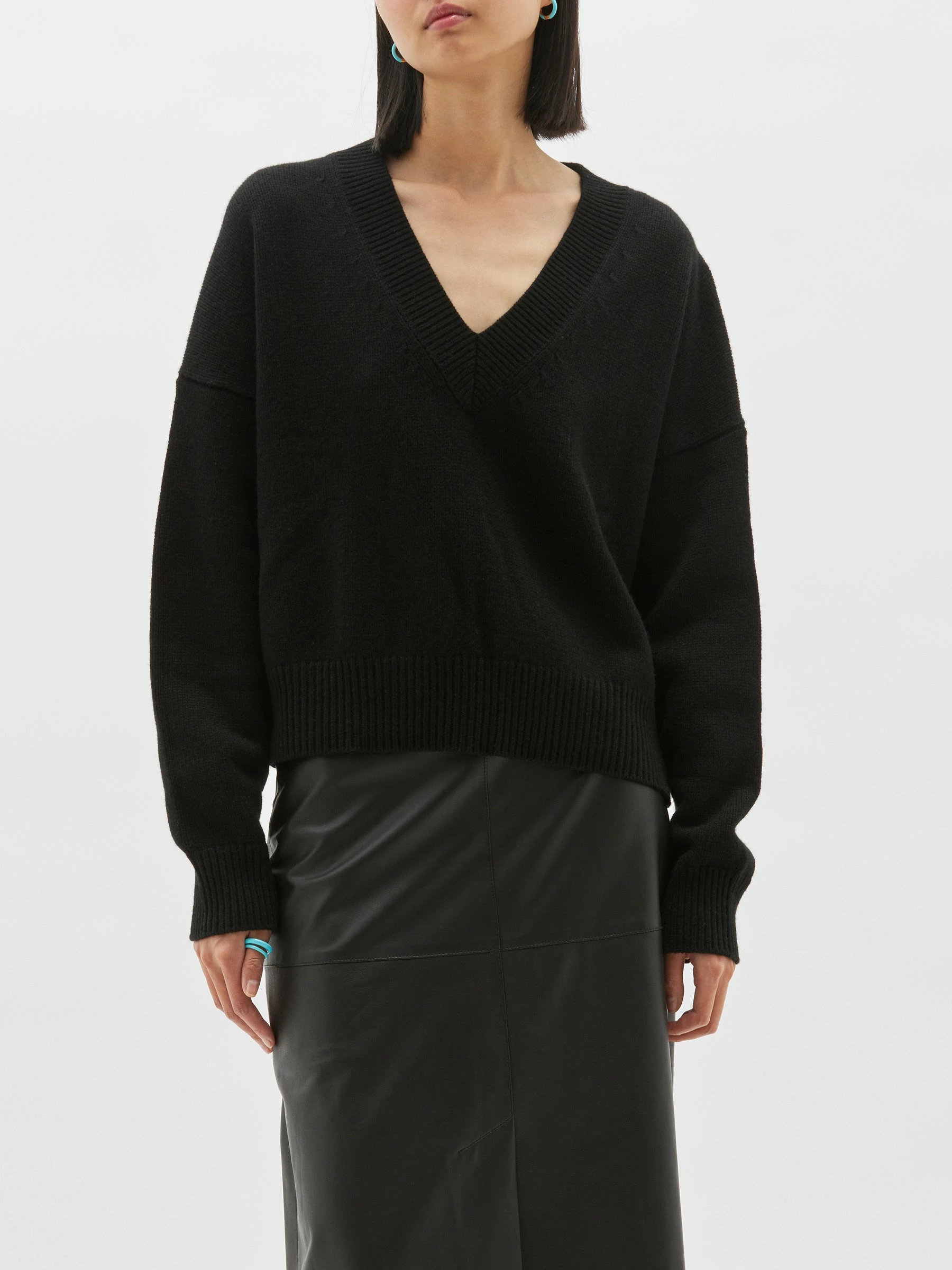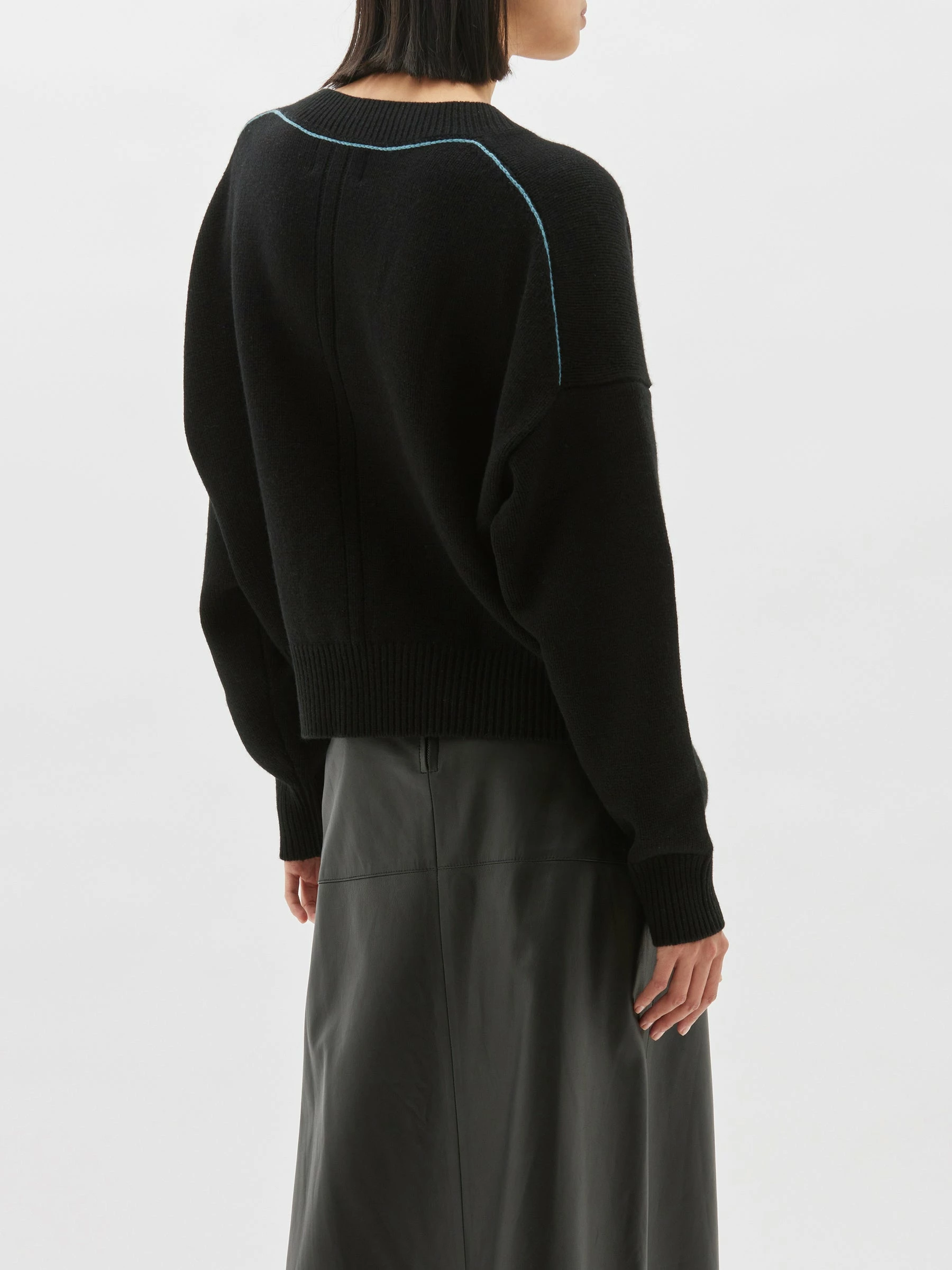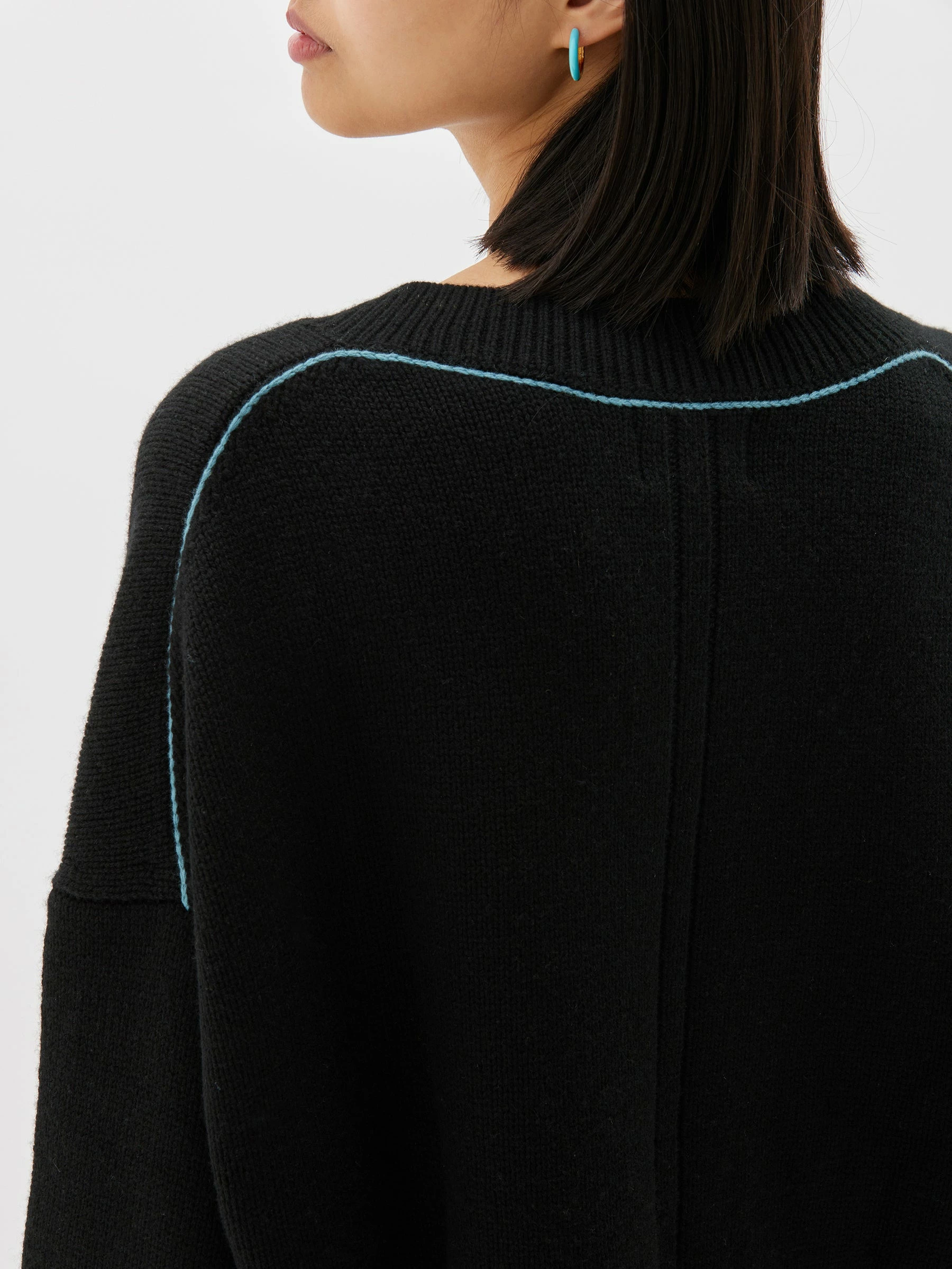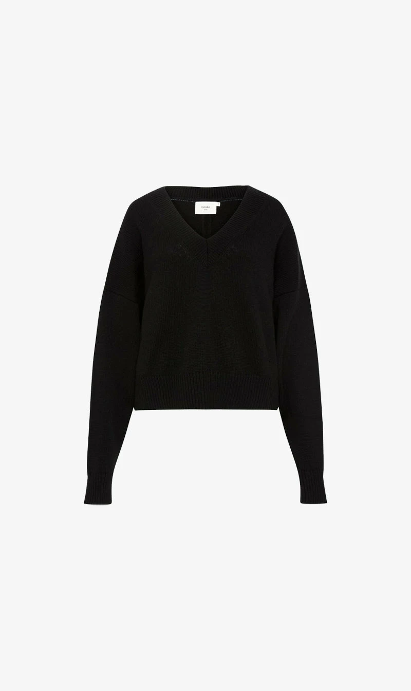 The Bassike Boxy Weekend Knit in Black/Teal Blue. A relaxed fit v neck jumper in merino wool and ethically sourced cashmere blend. with contrast teal blue stitching on shoulder seam.