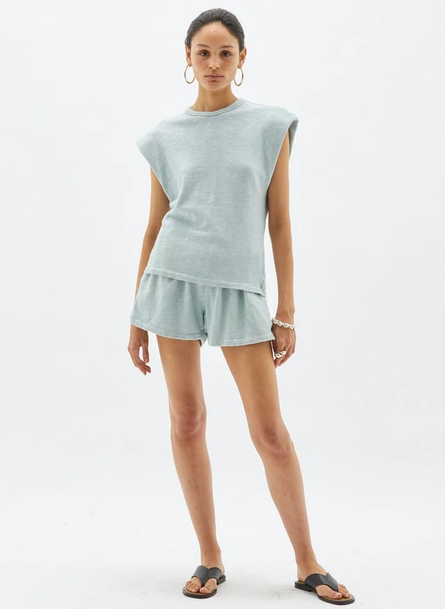 The Bassike Wider Shoulder Heritage Slub Tank in Pistachio. A wide shoulder tank in textured cotton slub rib.