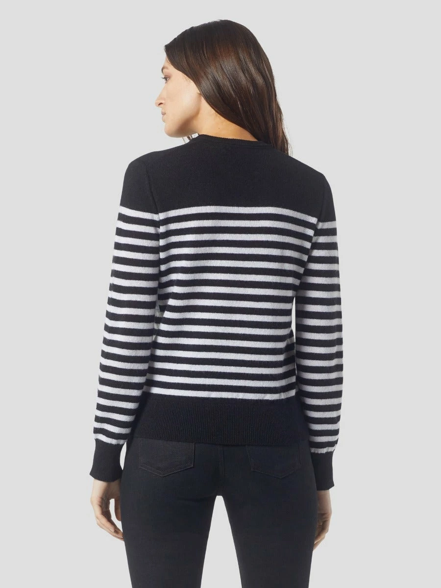 The Equipment Sanni Striped Crew in True Black/Nature White. A relaxed cut, crew neckline, and ribbed detailing in soft cashmere.