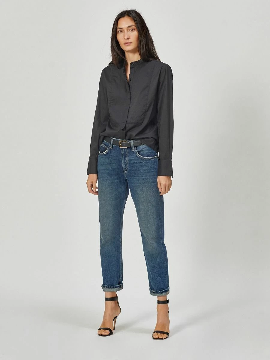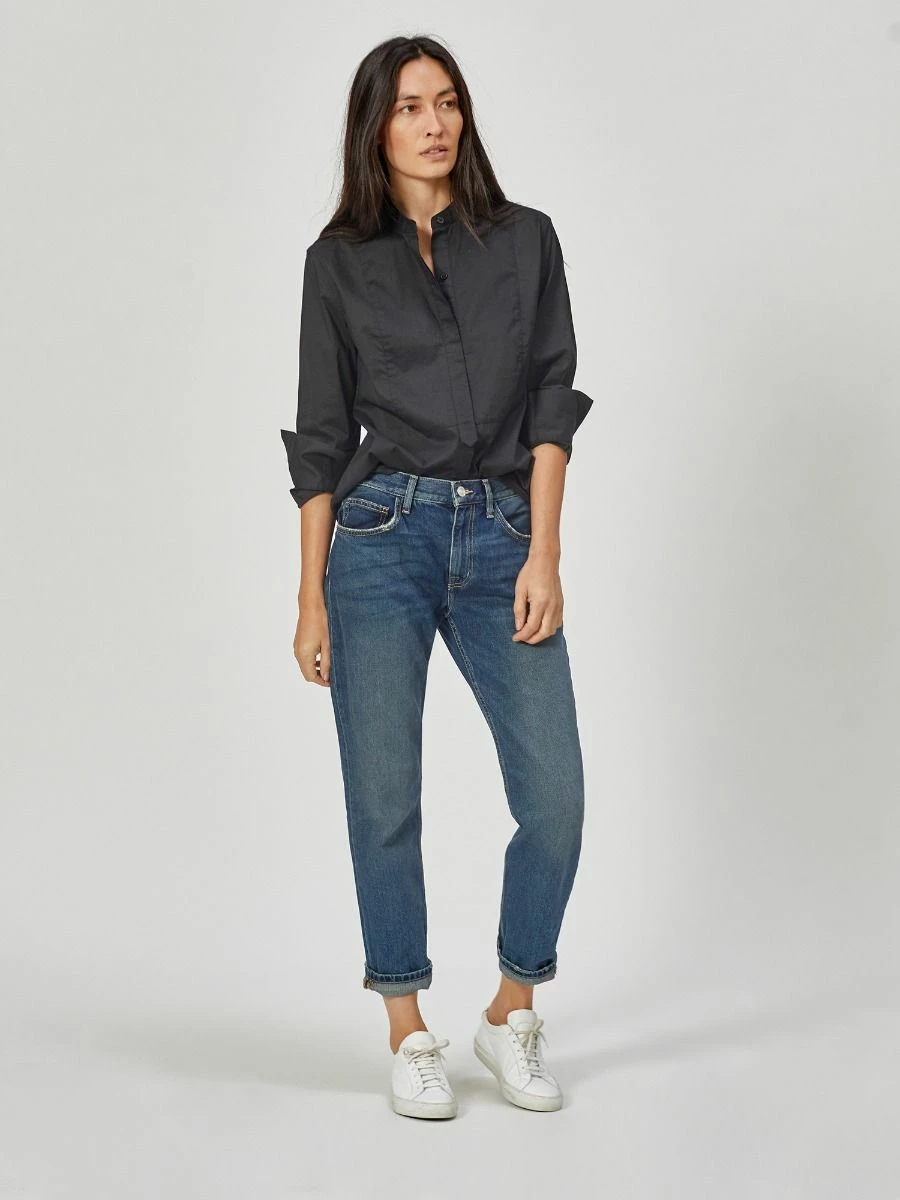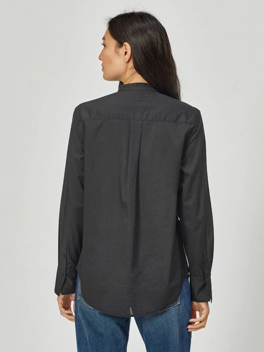 The Tomassia Cotton Shirt in True Black from Equipment is crafted from crisp cotton this classic popover features bib detailing, a button down front, and a collarless design.