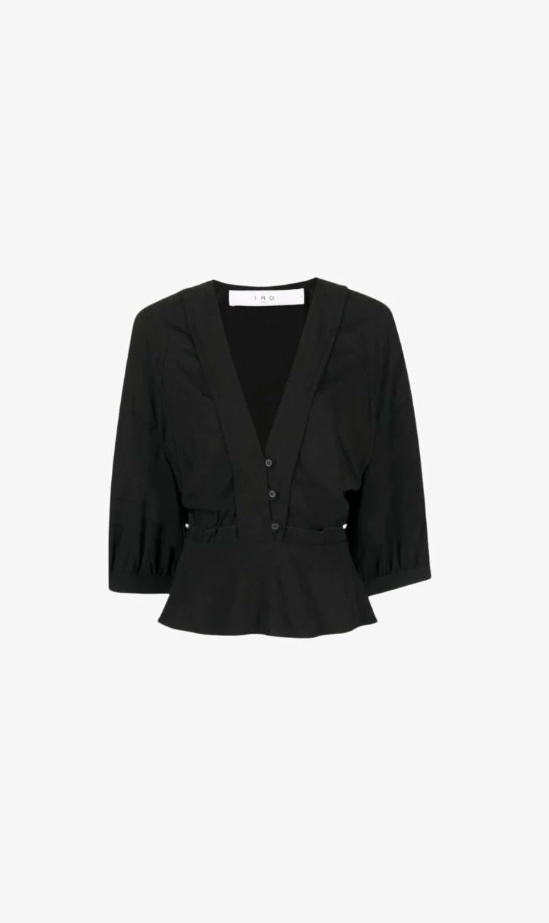 The Shira Top by IRO features a v-neck with button closure an sinched in waist.