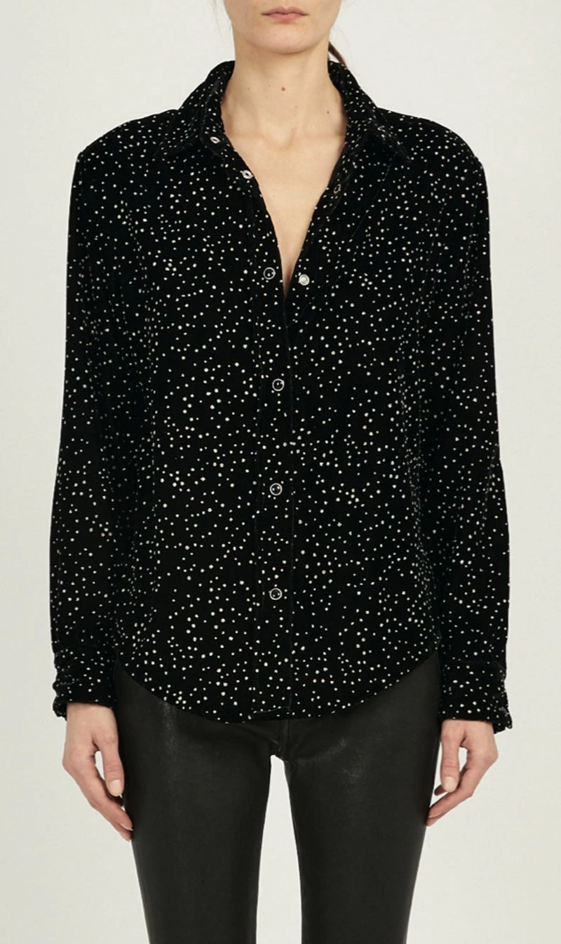 As starry as the night sky, the IRO Treina shirt lands just in time for party season. This black velvet button up shirt features dome closures with silver sparkle all over. Pair with blue denim or black pants.Â
