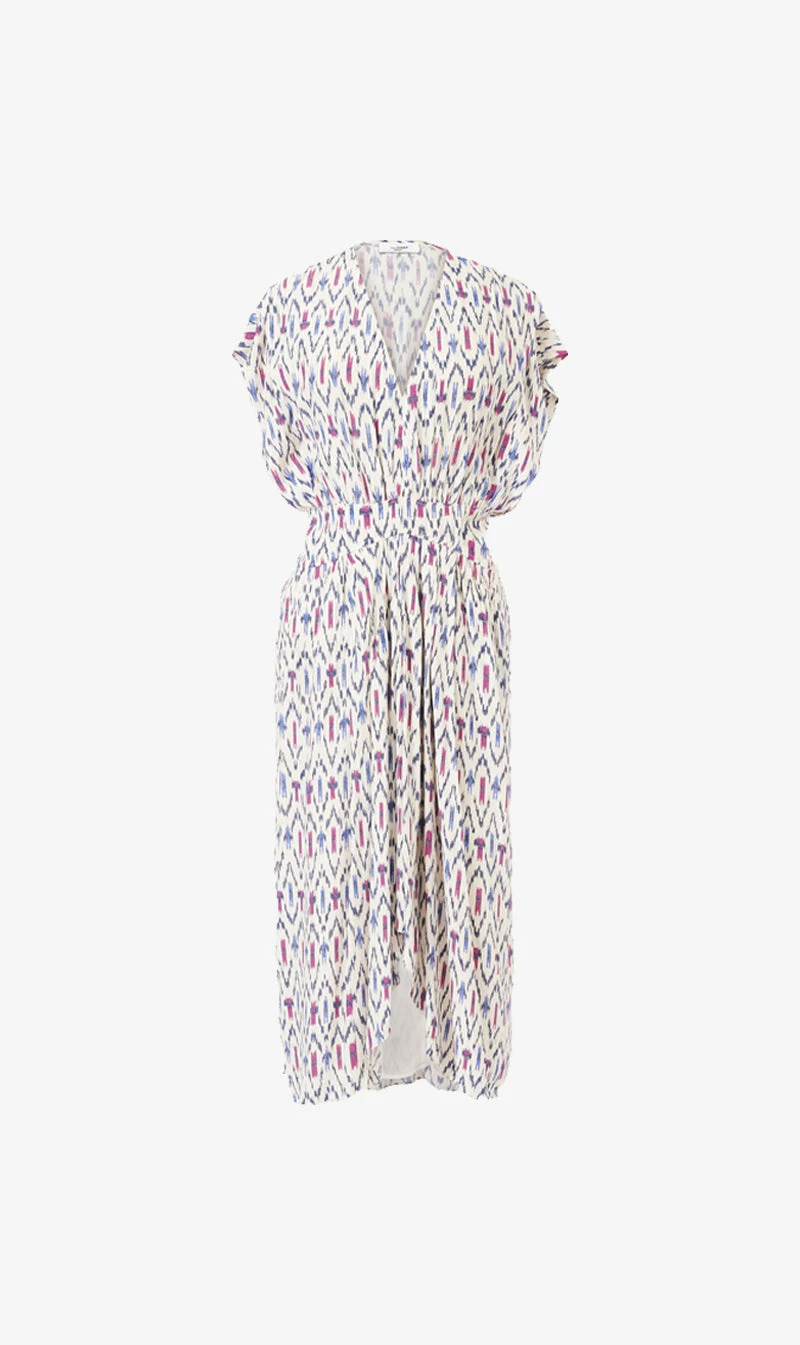 The Isabel Marant Almeya Dress in Ecru. A Long viscose dress with short sleeves featuring a V neck and Zip fastening.