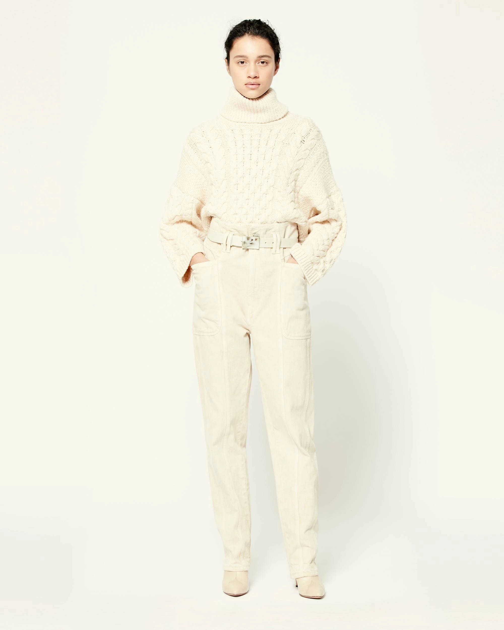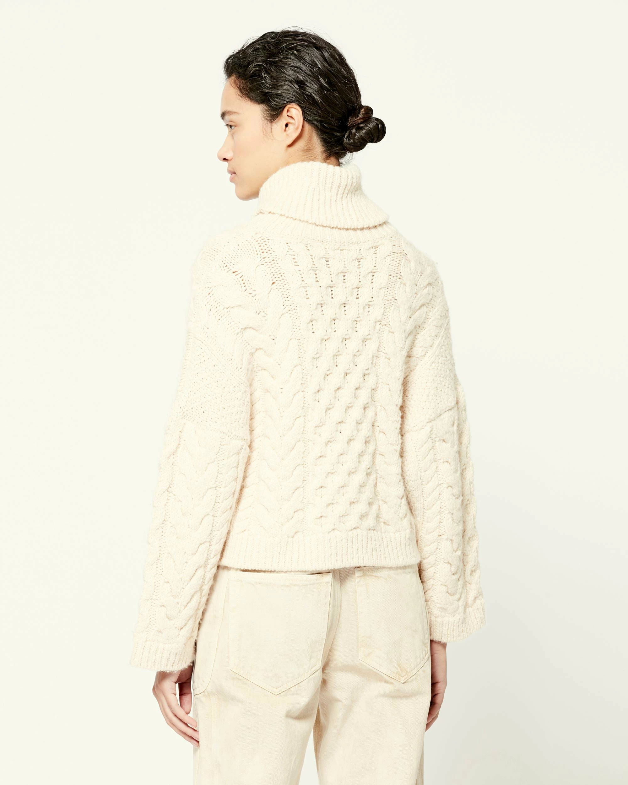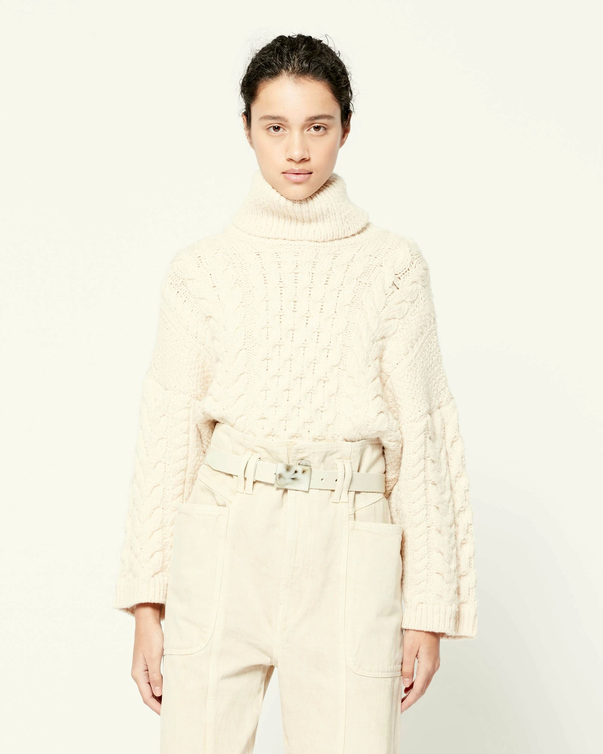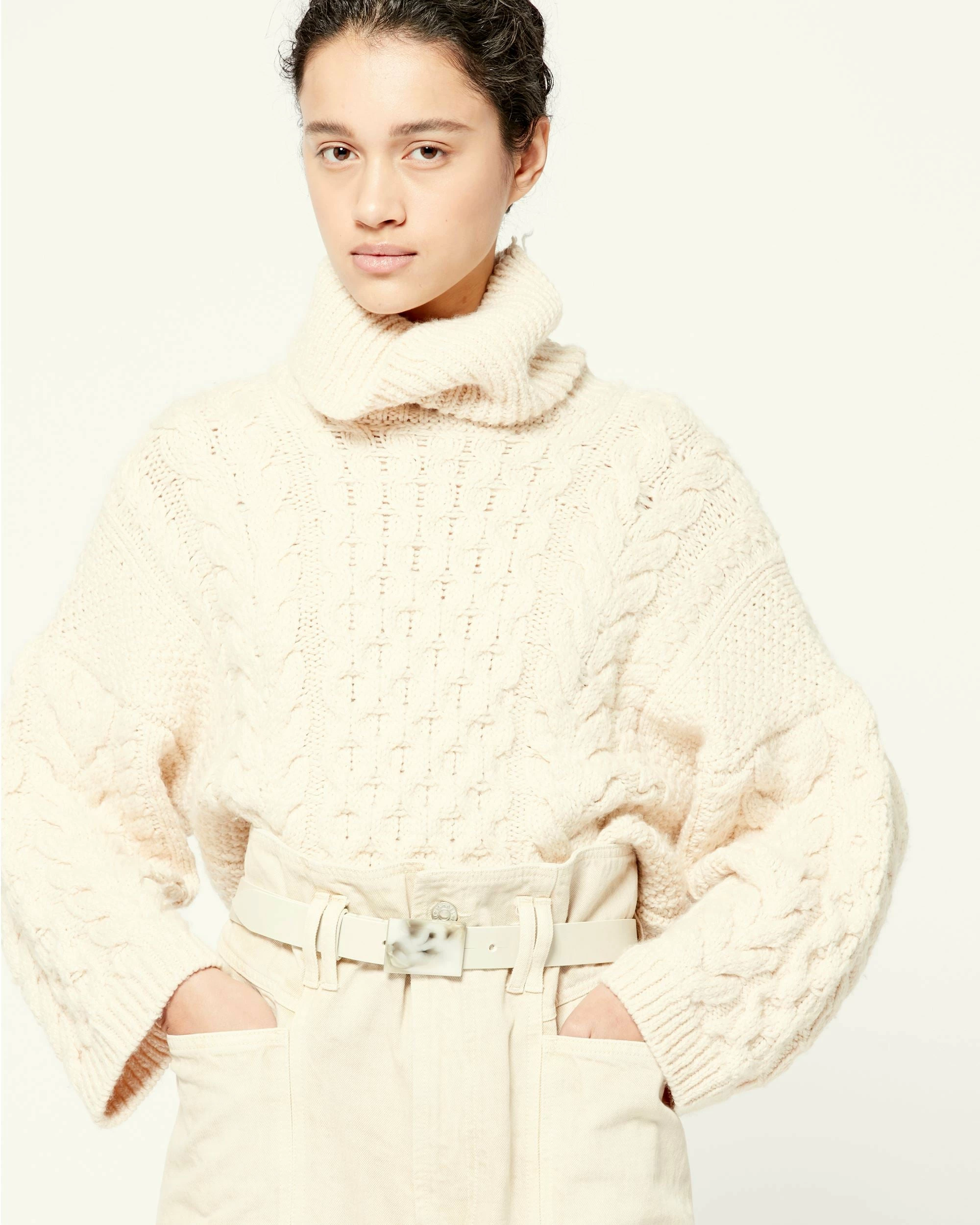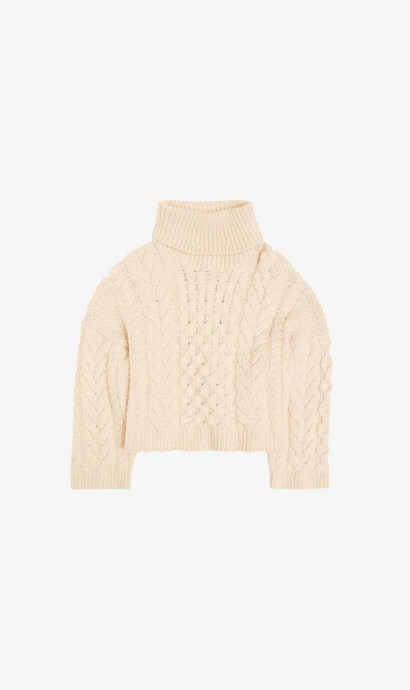 The Isabel Marant Ingrid Pullover in Ecru. A turtleneck cable-knit wool-blend sweater with long sleeves. Finishing at hip length.