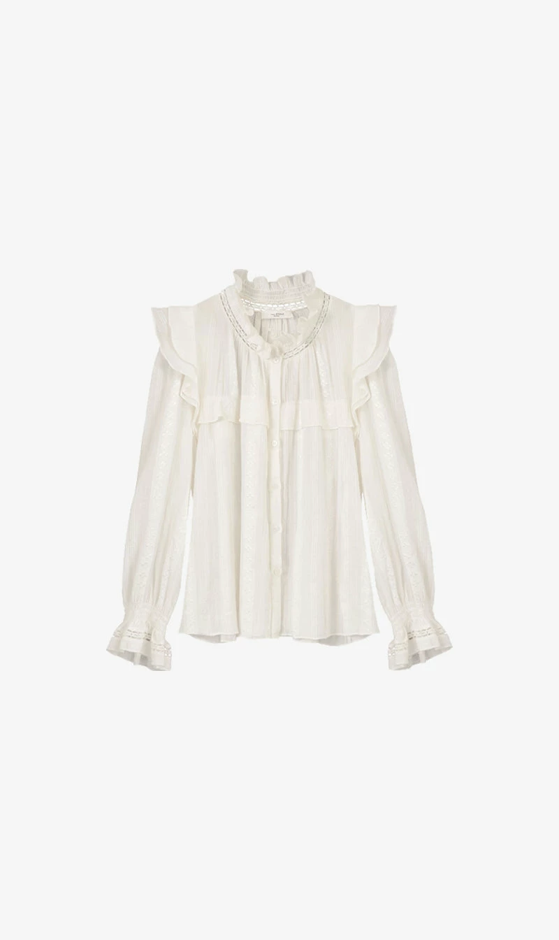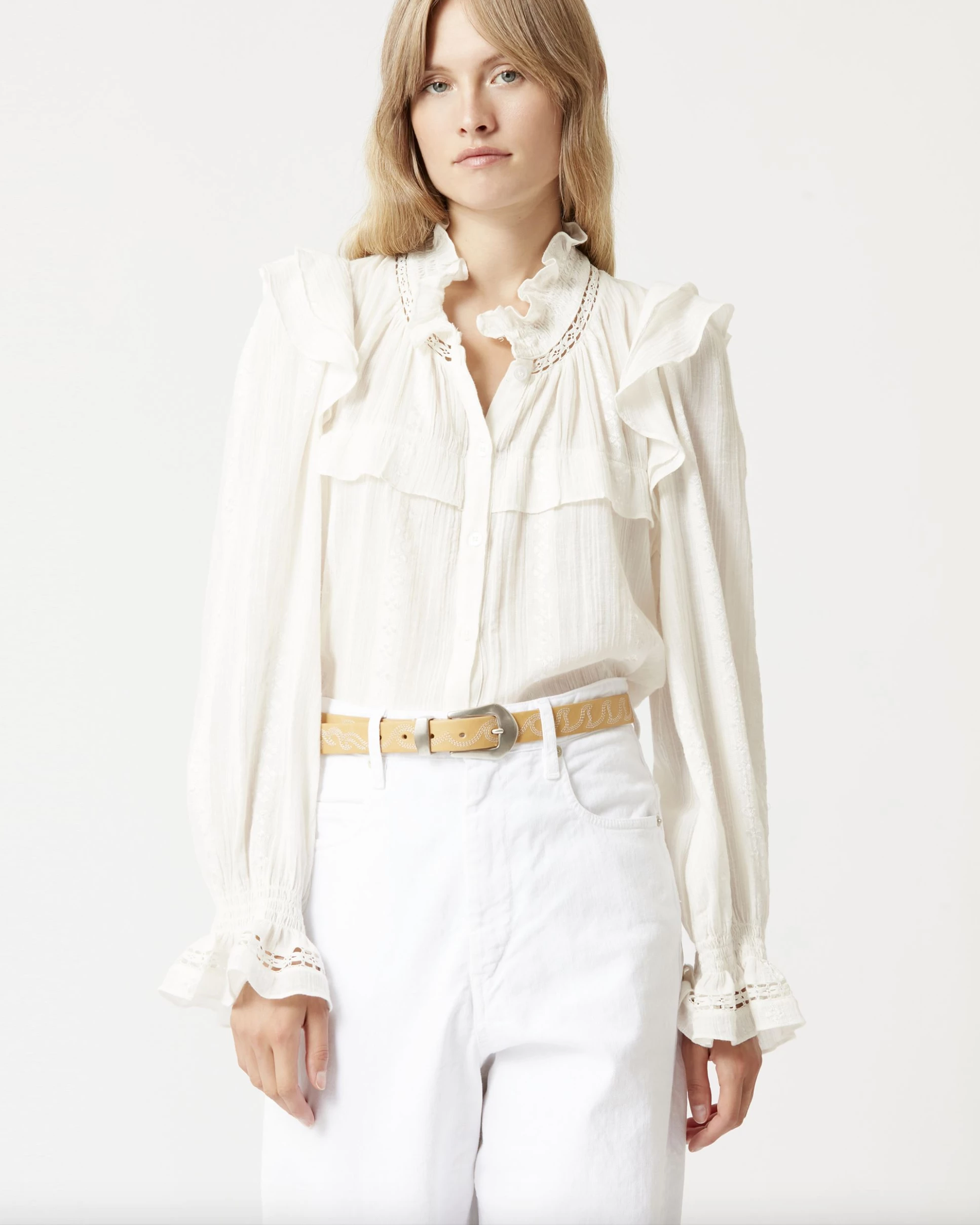 The Isabel Marant Jatedy Top in White. A premium Cotton top with long sleeves featuring a ruffled neckline