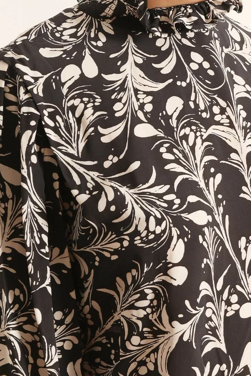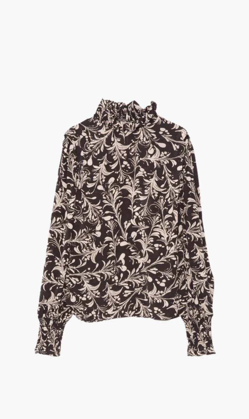 The Isabel Marant Yoshi Top in Black/Ecru is a long sleeve printed blouse with smocked high neck and smocked cuffs.