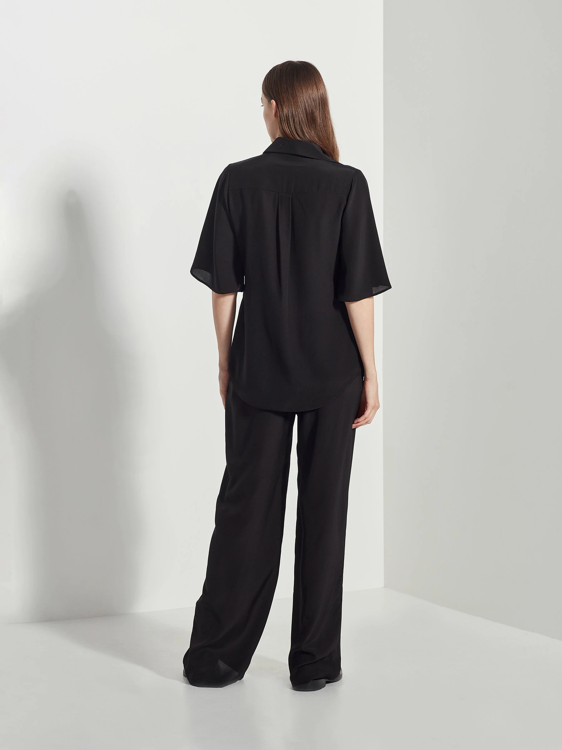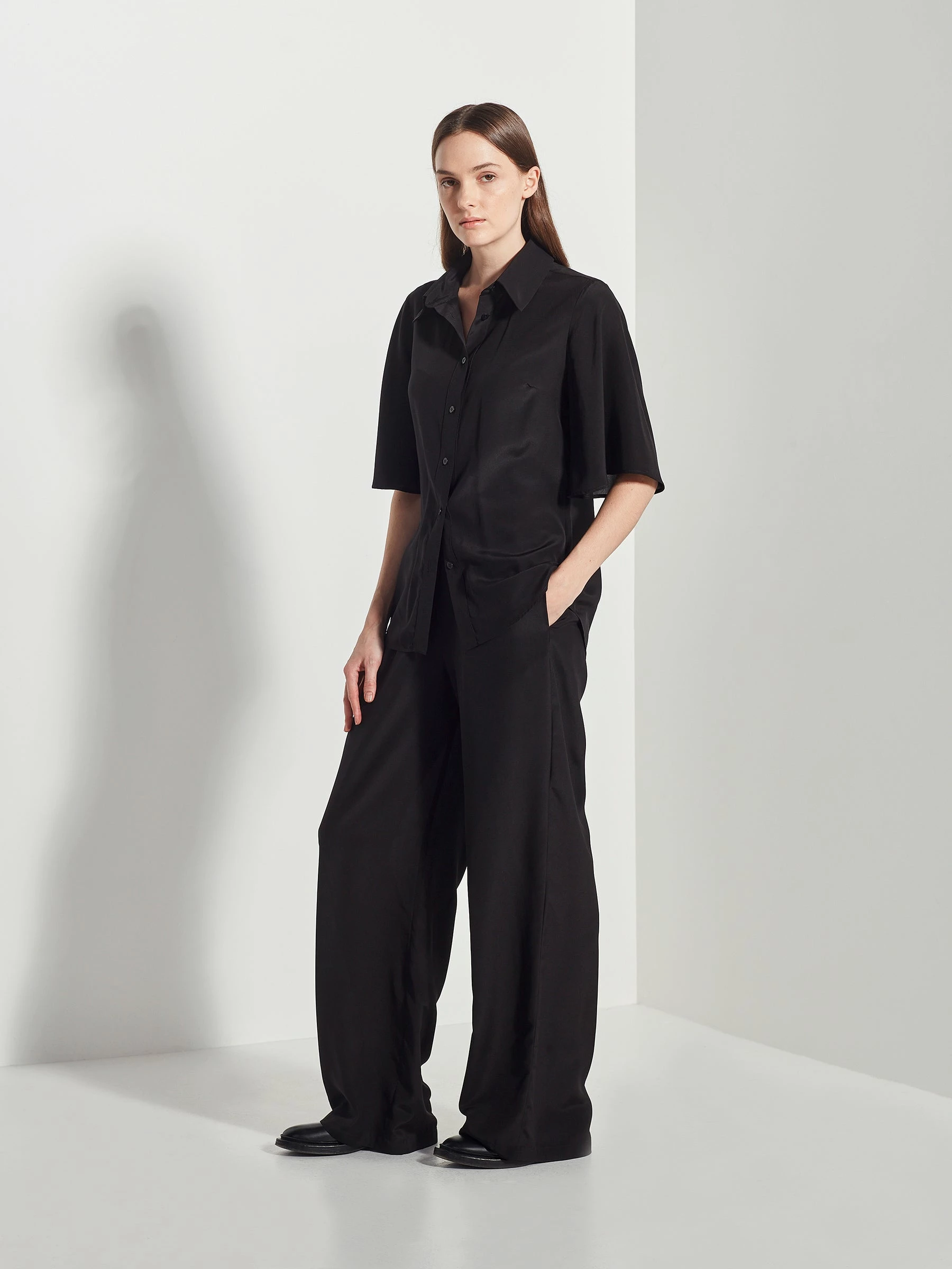 The Juliette Hogan Jolie Shirt in Black is a timeless classic that instantly elevated any look. Crafted with 100% Silk, it brings understated elegance to any look. Featuring a shirt collar and flared raglan sleeves, this top is designed to work perfectly with any outfit.