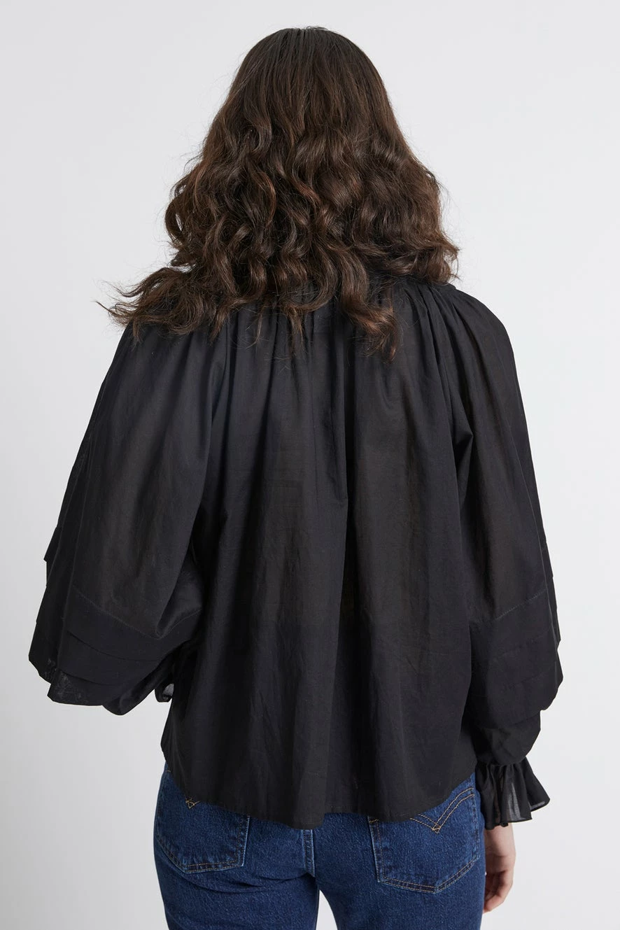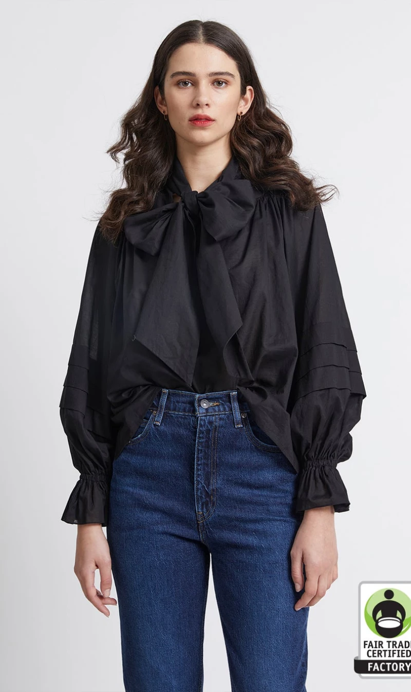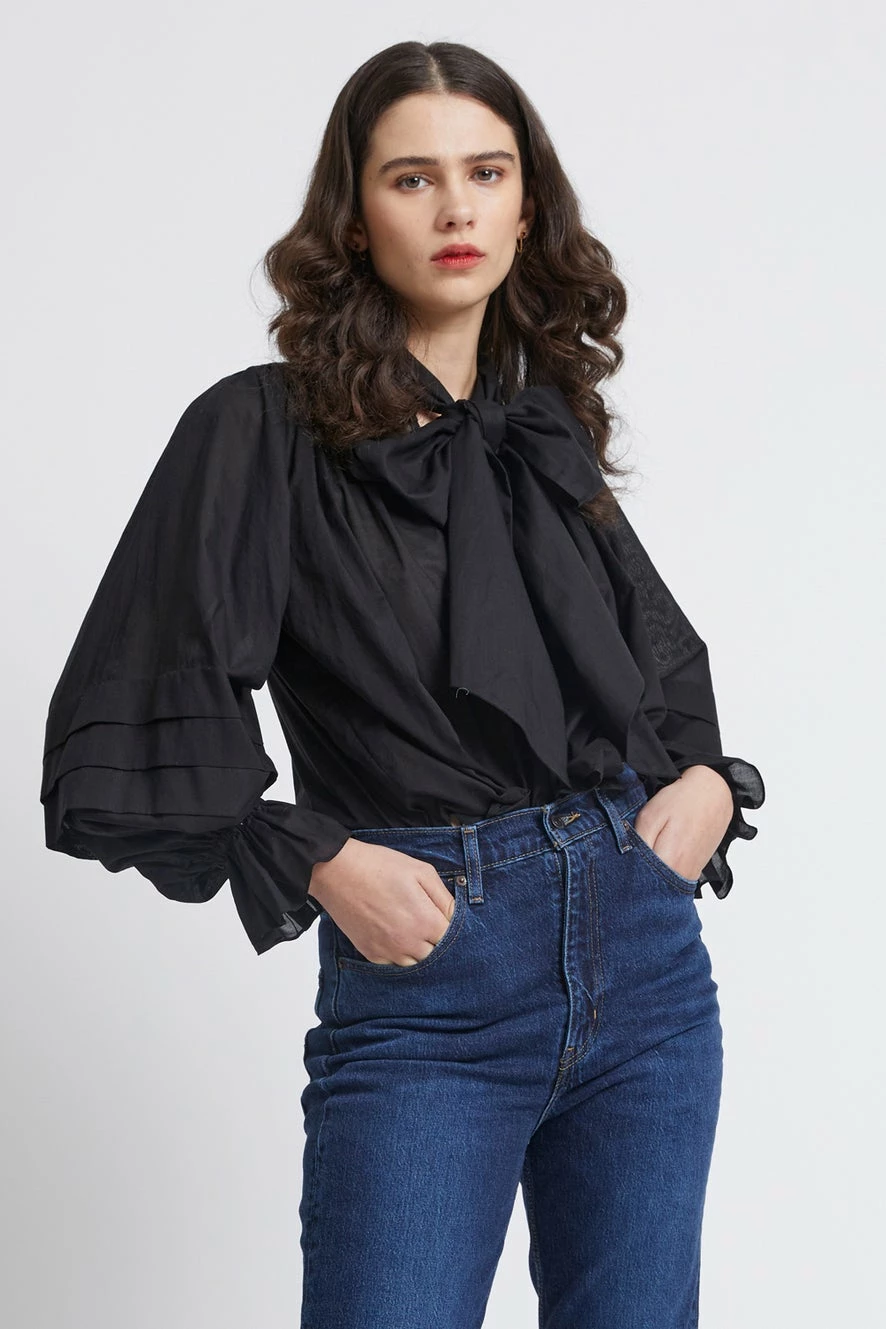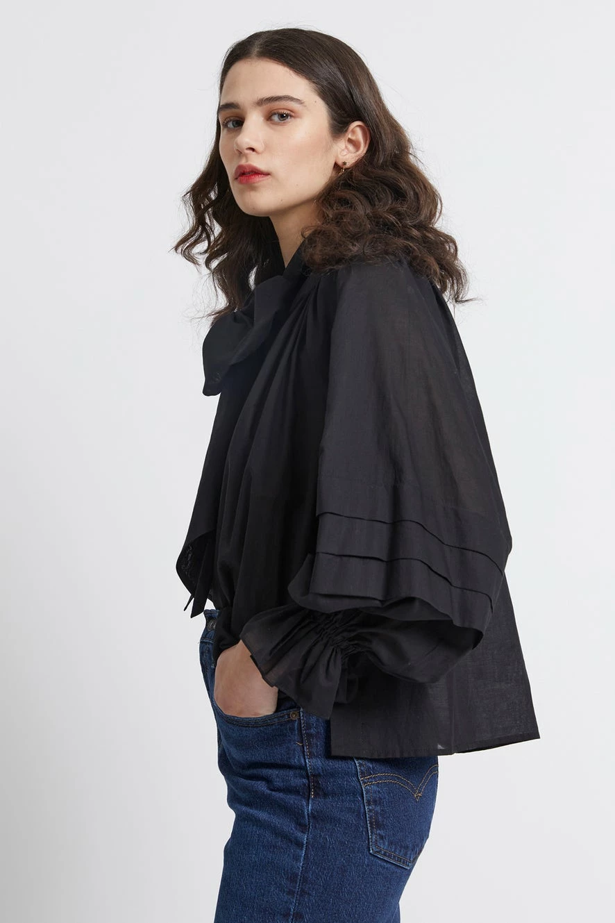 The Mouseion Top is a beloved Karen Walker style that has a romantic feel thanks to its statement sleeves and exaggerated pussycat bow. Crafted in crisp organic cotton, it has a relaxed boxy silhouette that looks great worn loose or tucked in. The billowing long sleeves feature pintuck detailing and exaggerated fluted cuffs while the poetic mood is completed by a generous bow, tying neatly at the collar.