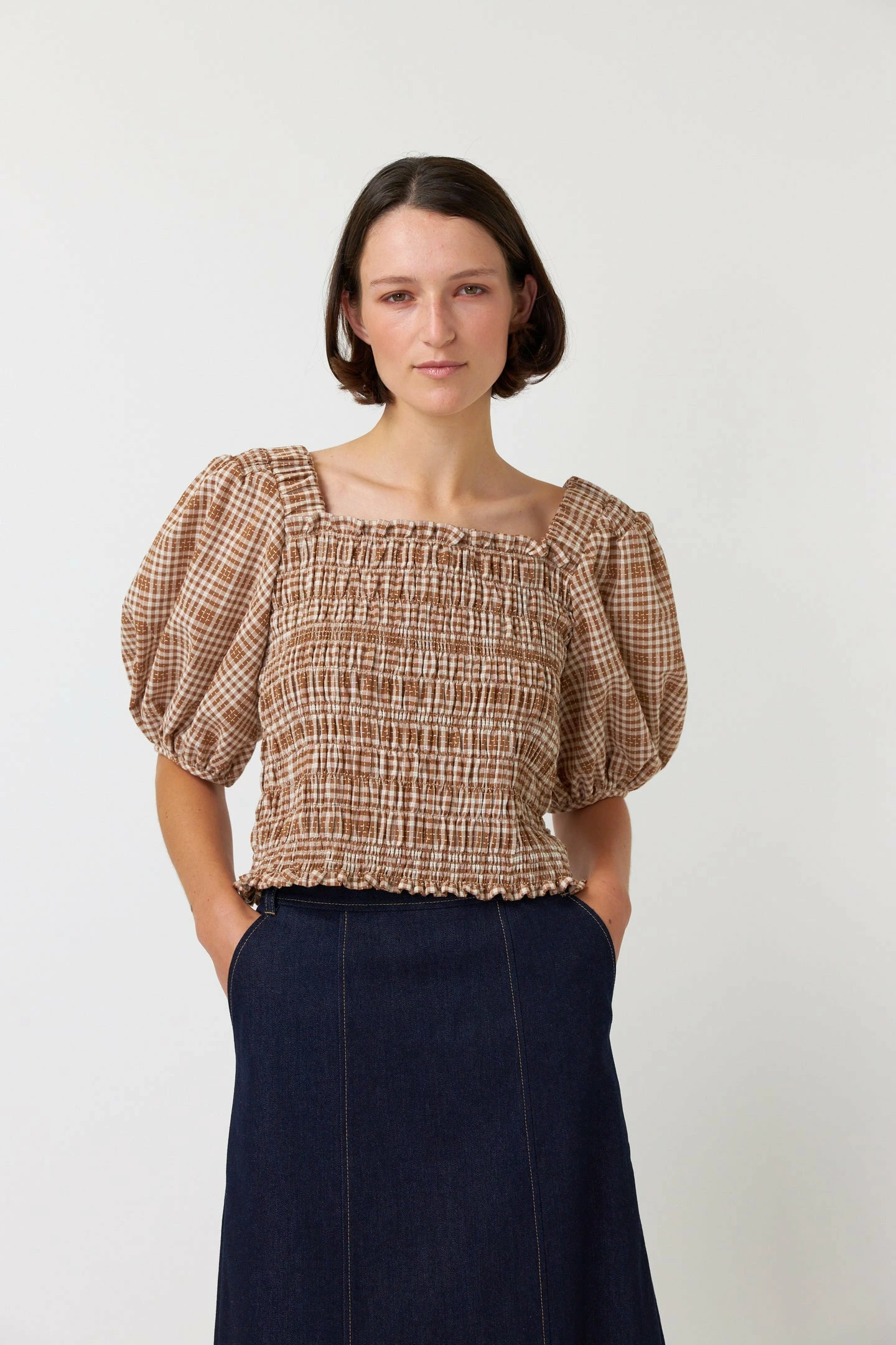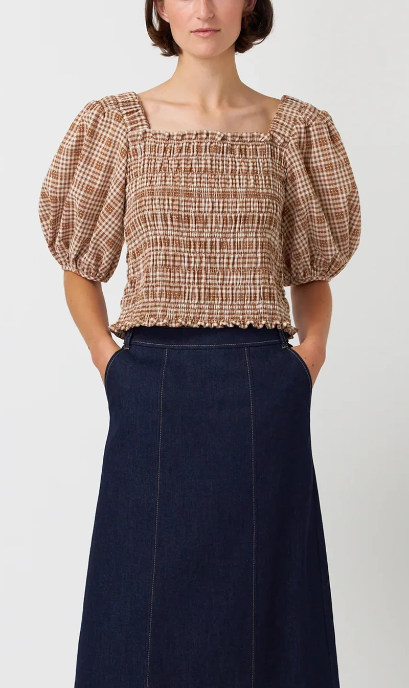 The Kate Sylvester Ginham Shirred Top in Caramel is a versatile addition to your wardrobe. Featuring a shirred bodice, a square neckline, and puff sleeves gathering into a bound cuff. Slightly cropped in length, it sits on the high hip. Pair it with tailored pants for the nine-to-five, then change into a denim skirt for an off-duty look.