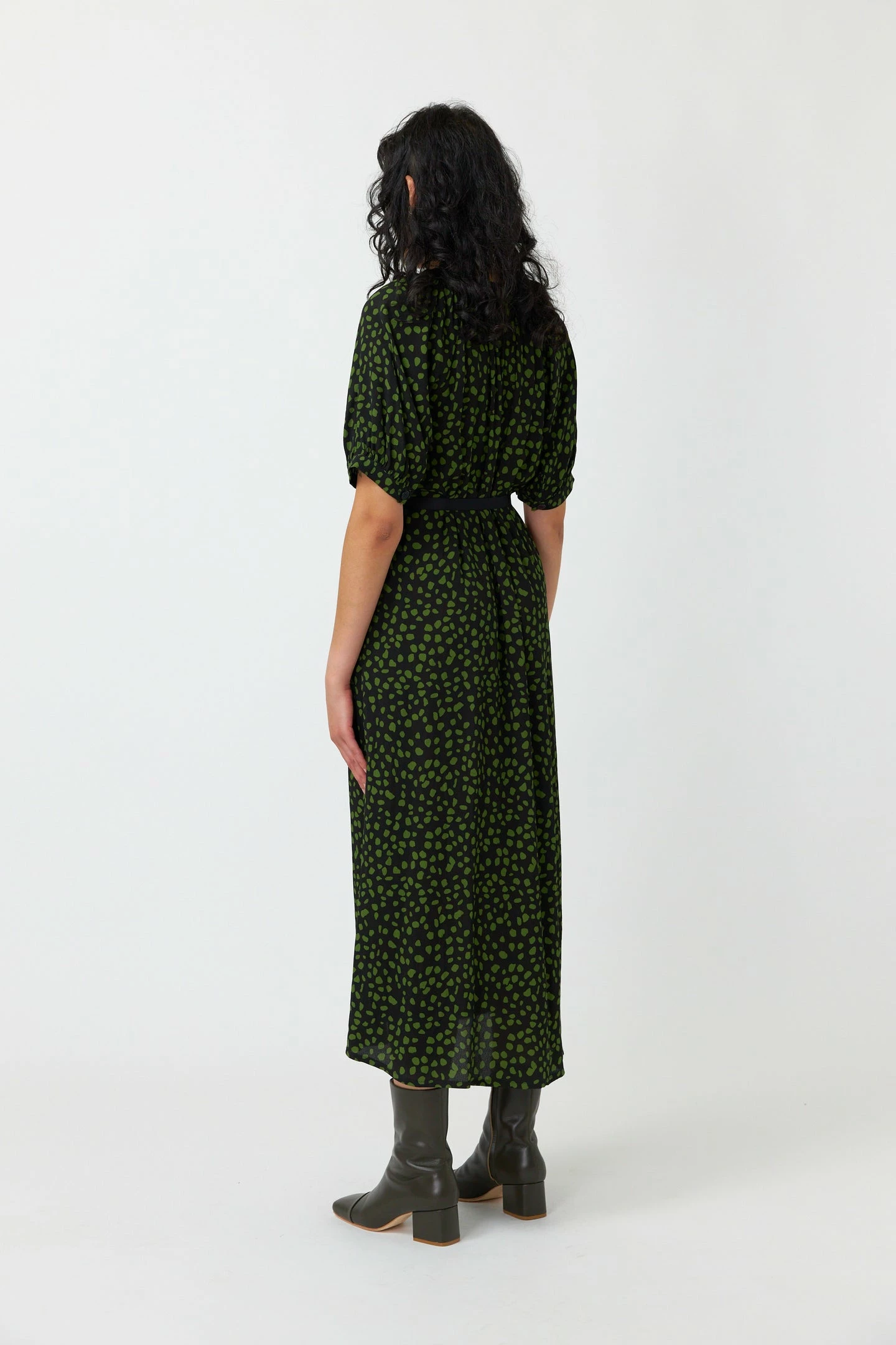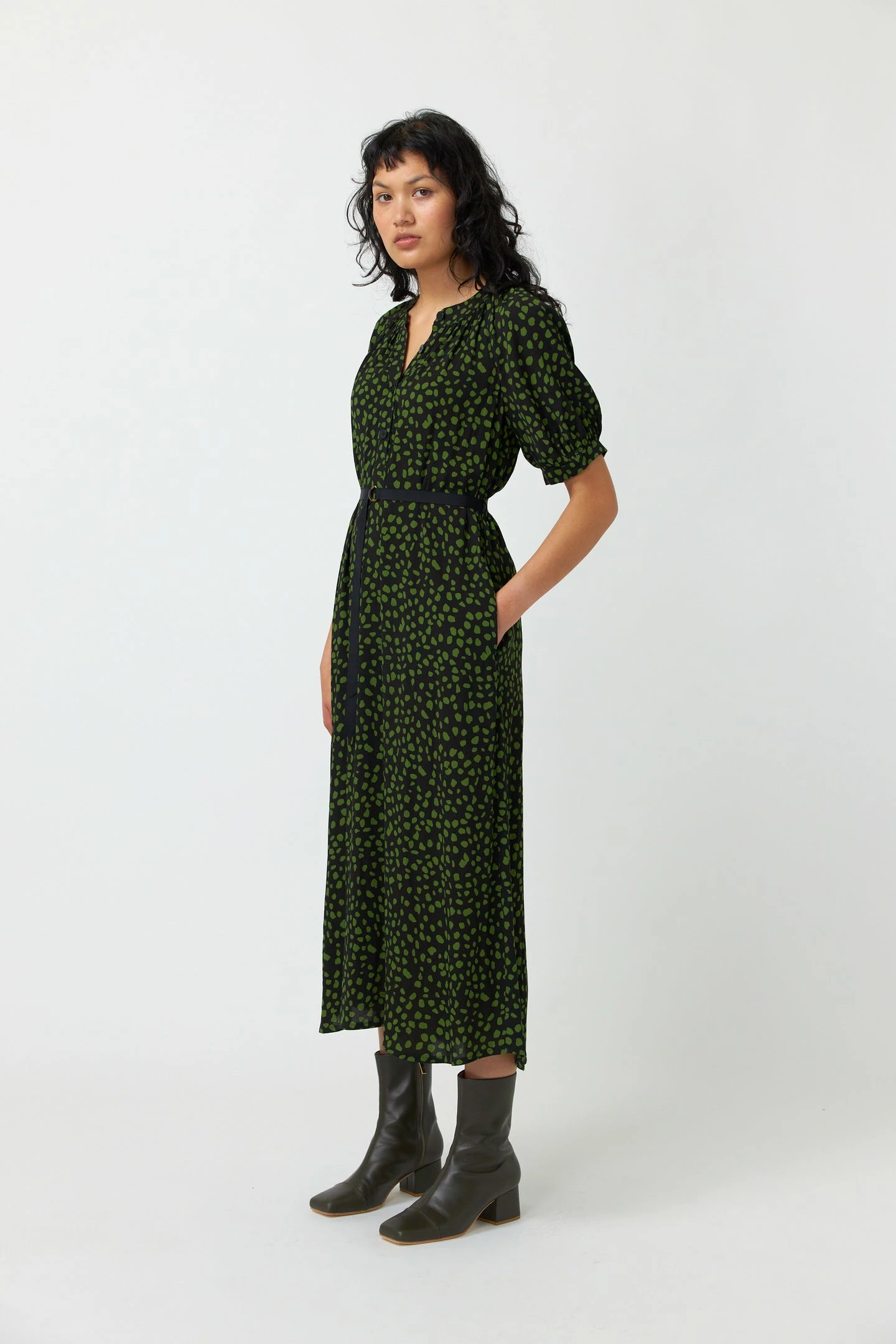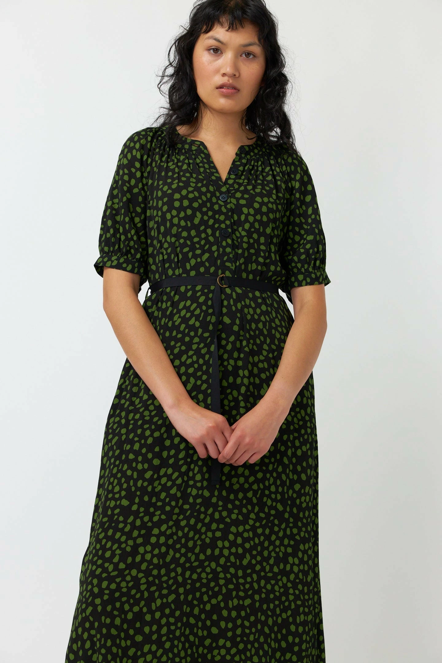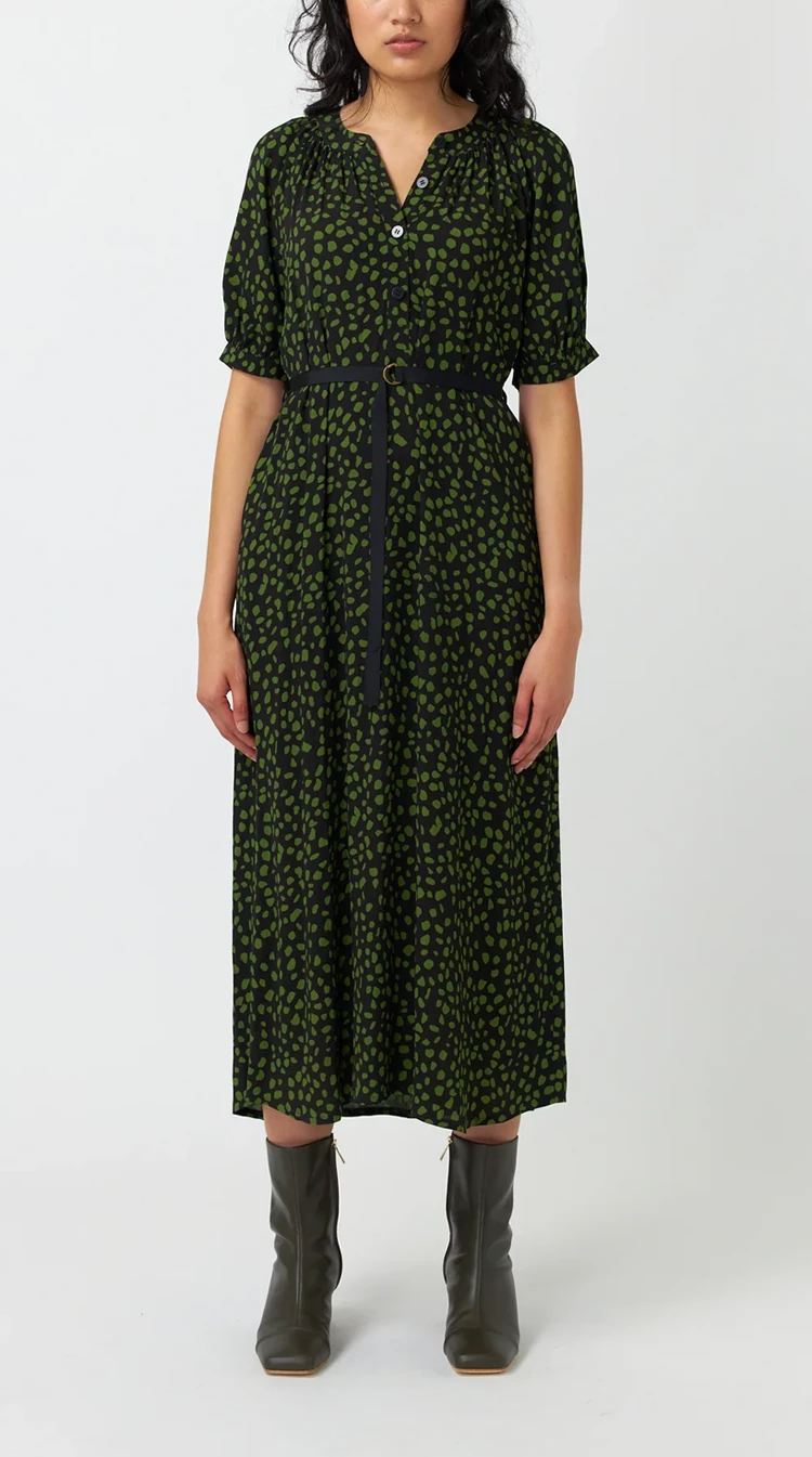 The Kate Sylvester Pebbles Dress in Black is key to effortless styling. Featuring a gathered detail at the neckline and cuffs, with a front button placket opening and an adjustable belt. Pair with your favourite boots and clutch.Â