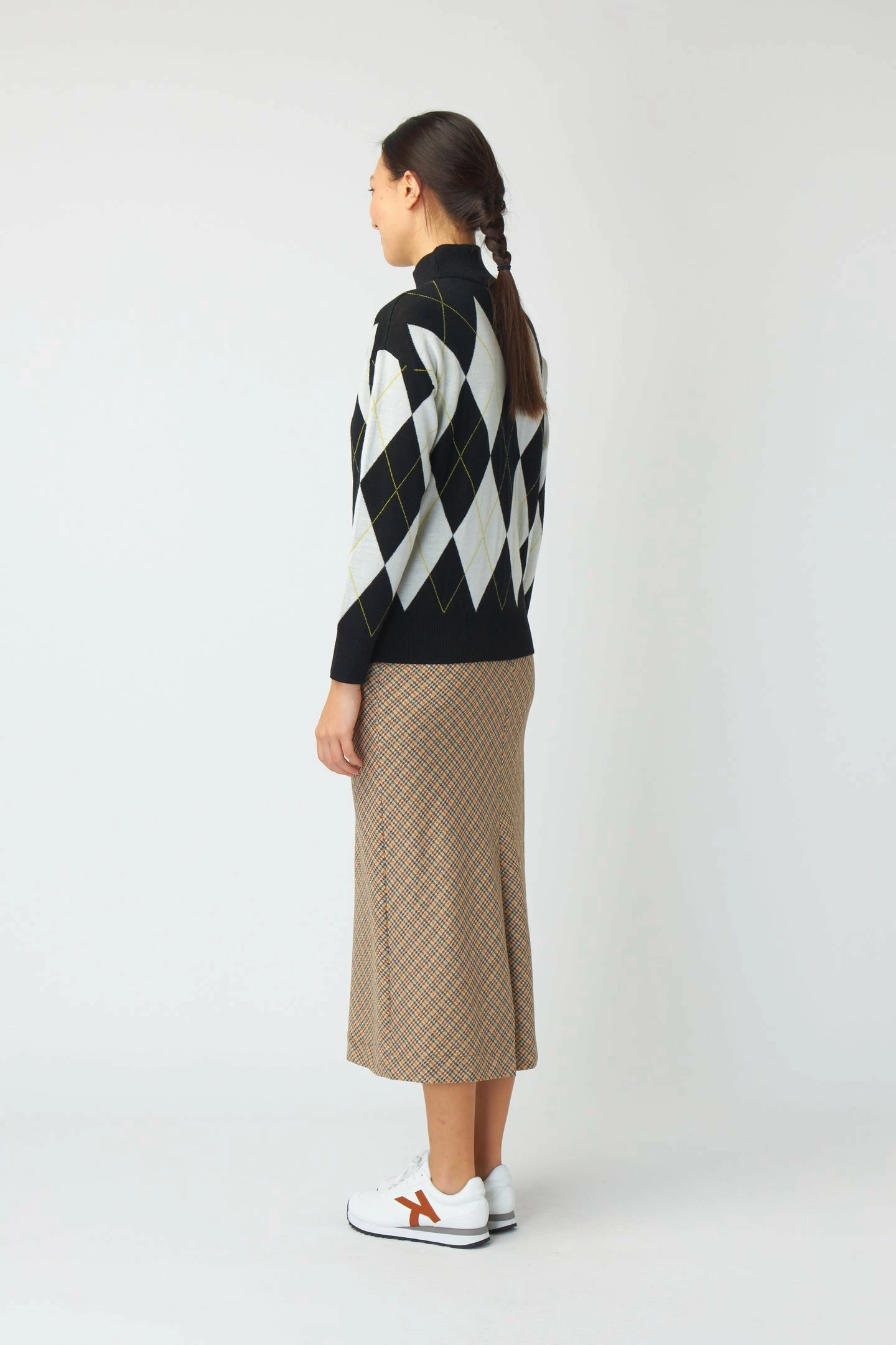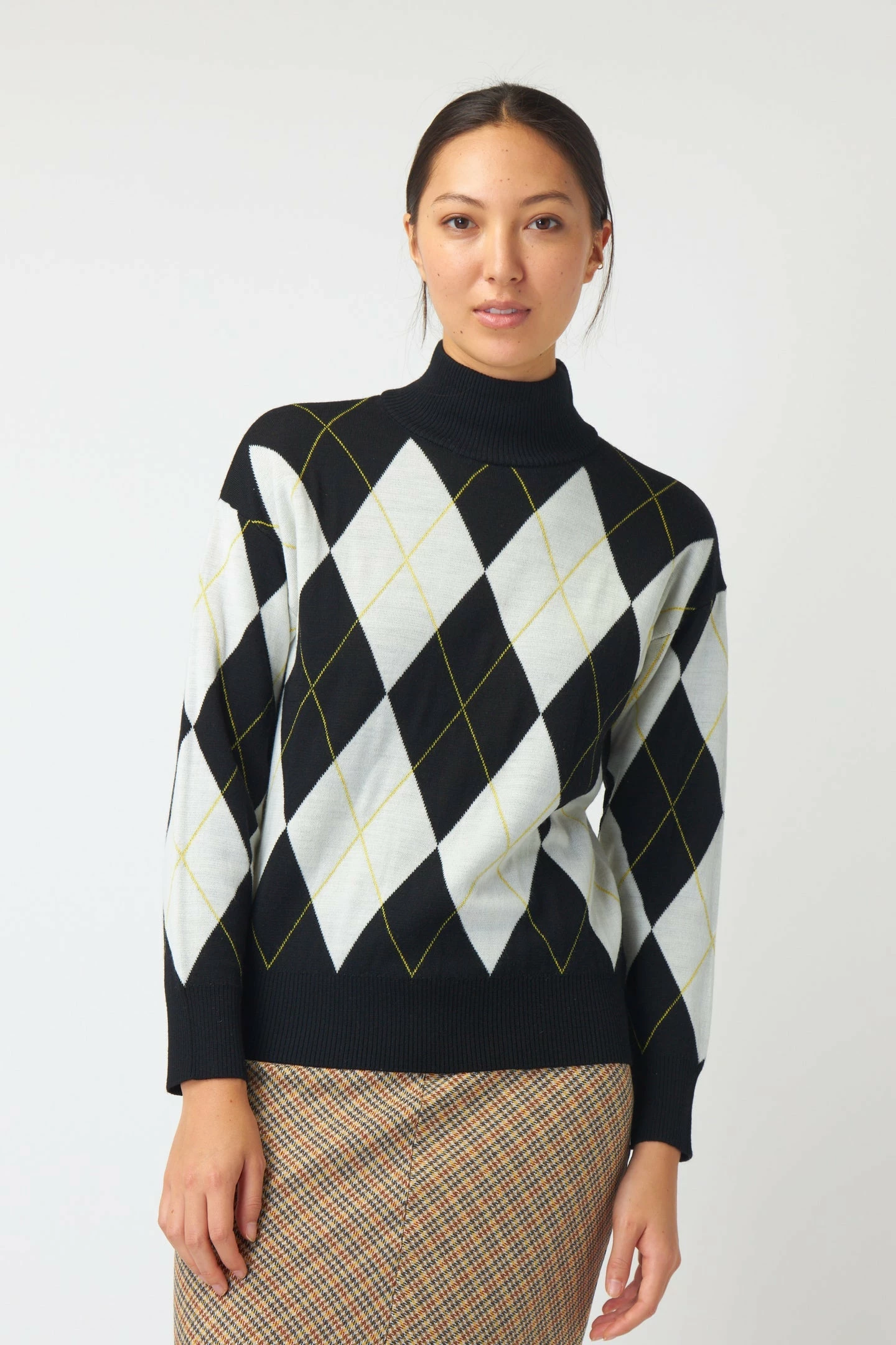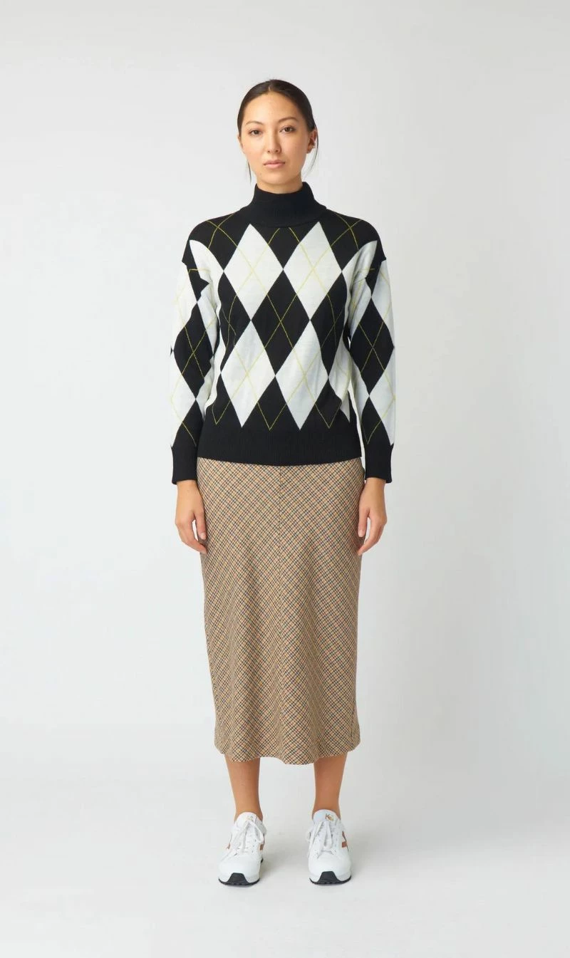 The Peyton Jumper by Kate Sylvester is a warm winter layer featuring a large argyle pattern, high rib neck and long sleeve.