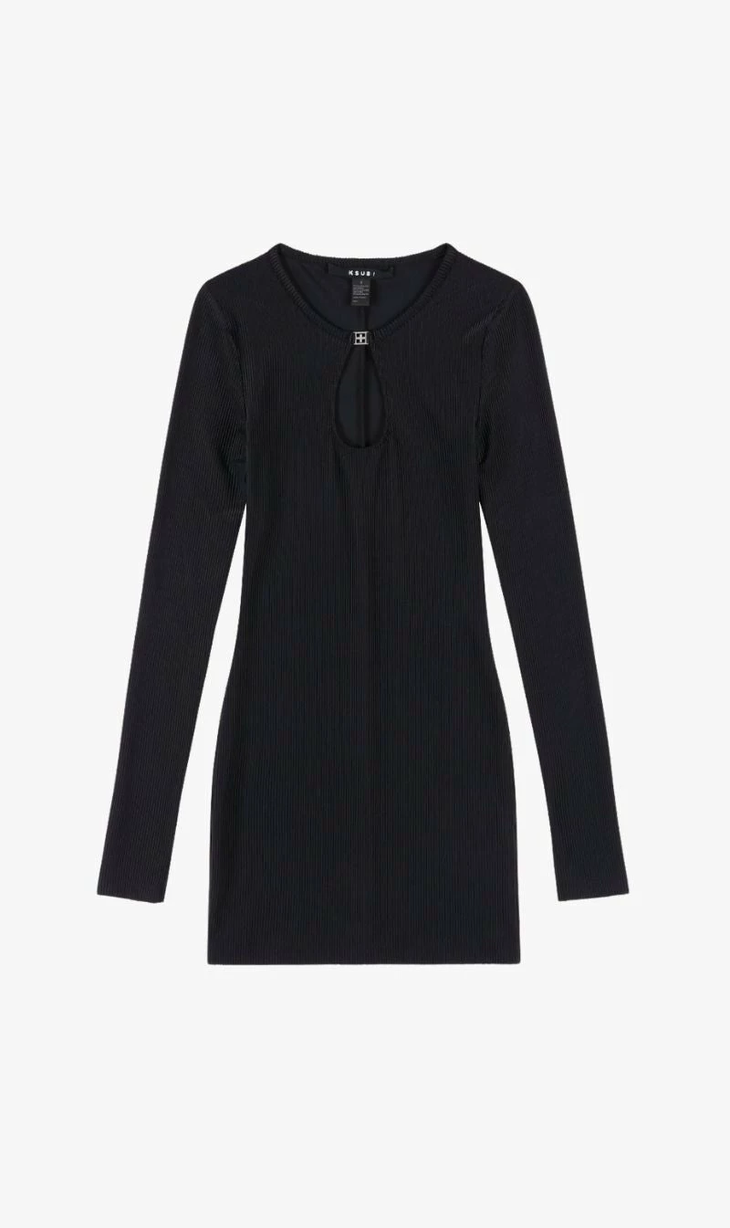 The Ksubi Charmed Keyhole Dress Black is a fitted, mini dress featuring a metal Ksubi t-box charm and keyhole cutout at the front and Ksubi t-box branding. This style is made from a premium slinky rib in a black colourway and designed with a crew neck, long sleeves, and thumb hole cutouts.