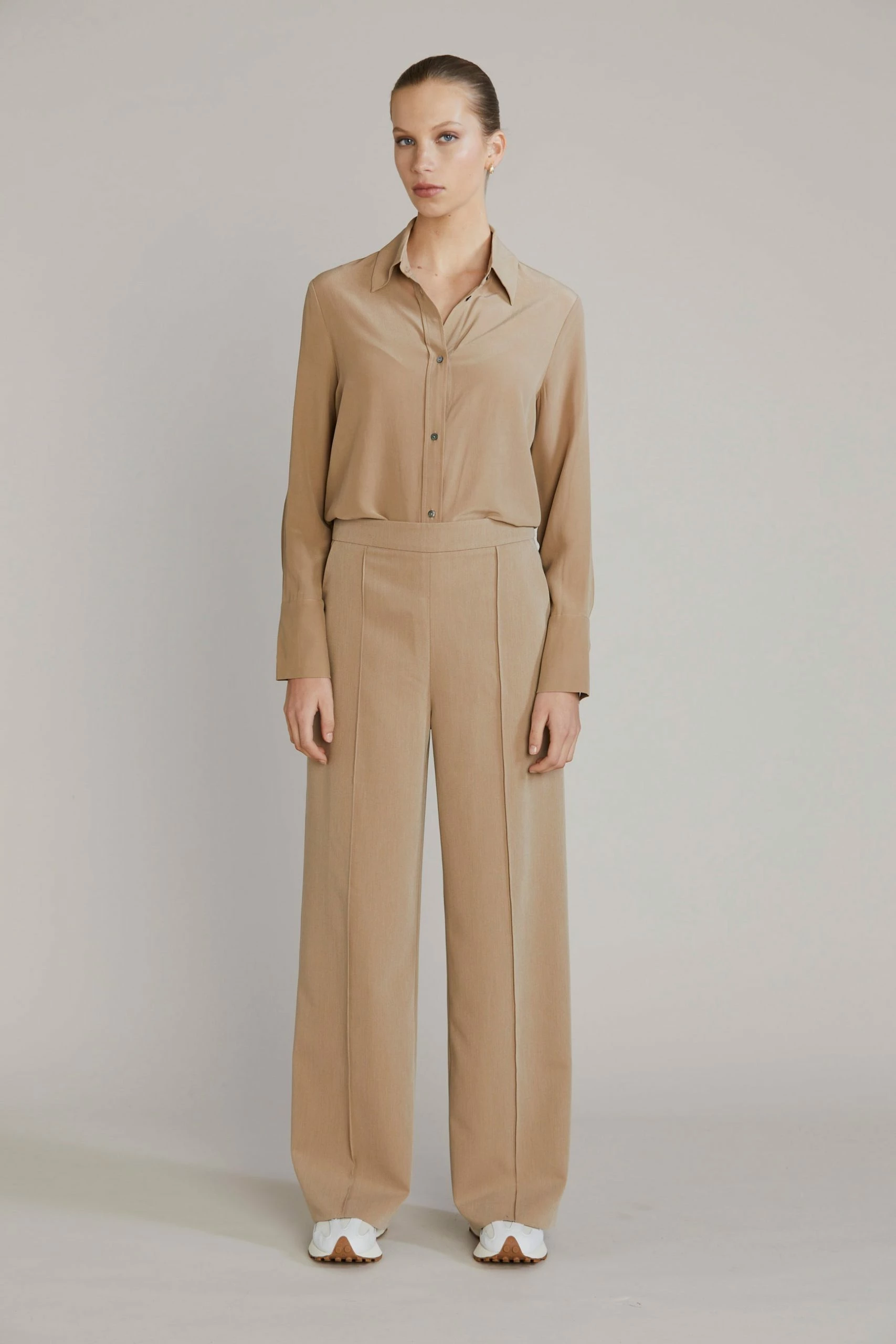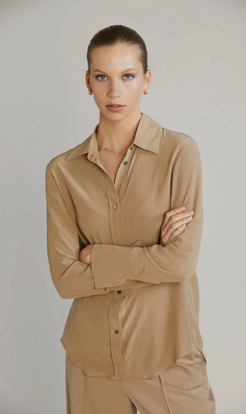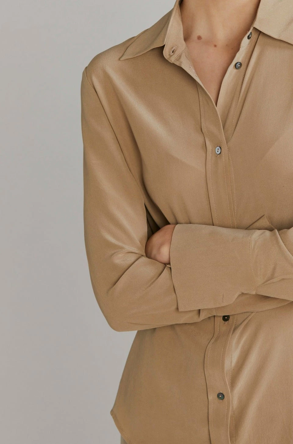 The Laing Mia Silk Shirt in Biscuit. Classic silk in classic black. Cut from sand-washed silk crepe-de-chine, this classic style is designed to sit off the body for a more relaxed fit. Cuffs are exaggerated and finished with a single button. Shell buttons down the front placket complete the polished look.