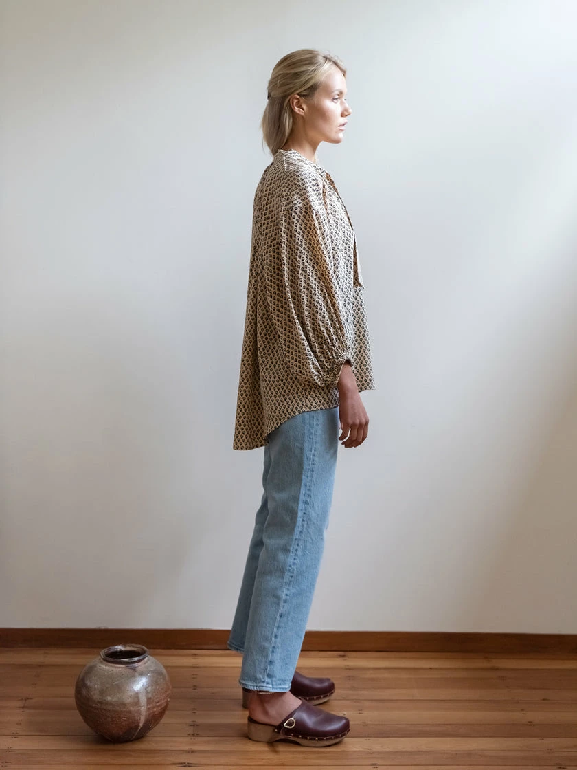 The Mahsa Don’t Tie Me Down Blouse in Paloma Print. The indispensable Don’t Tie Me Down Blouse is back in a diverse palette of trans-seasonal fabrics, with Agoya shell buttons to add a subtle shimmer. This iteration of the Everyday Blouse retains the simple ease of the original with the addition of a neck tie that can be bowed, tied or worn free. Featuring a relaxed three-quarter sleeve and classic shirt tail.