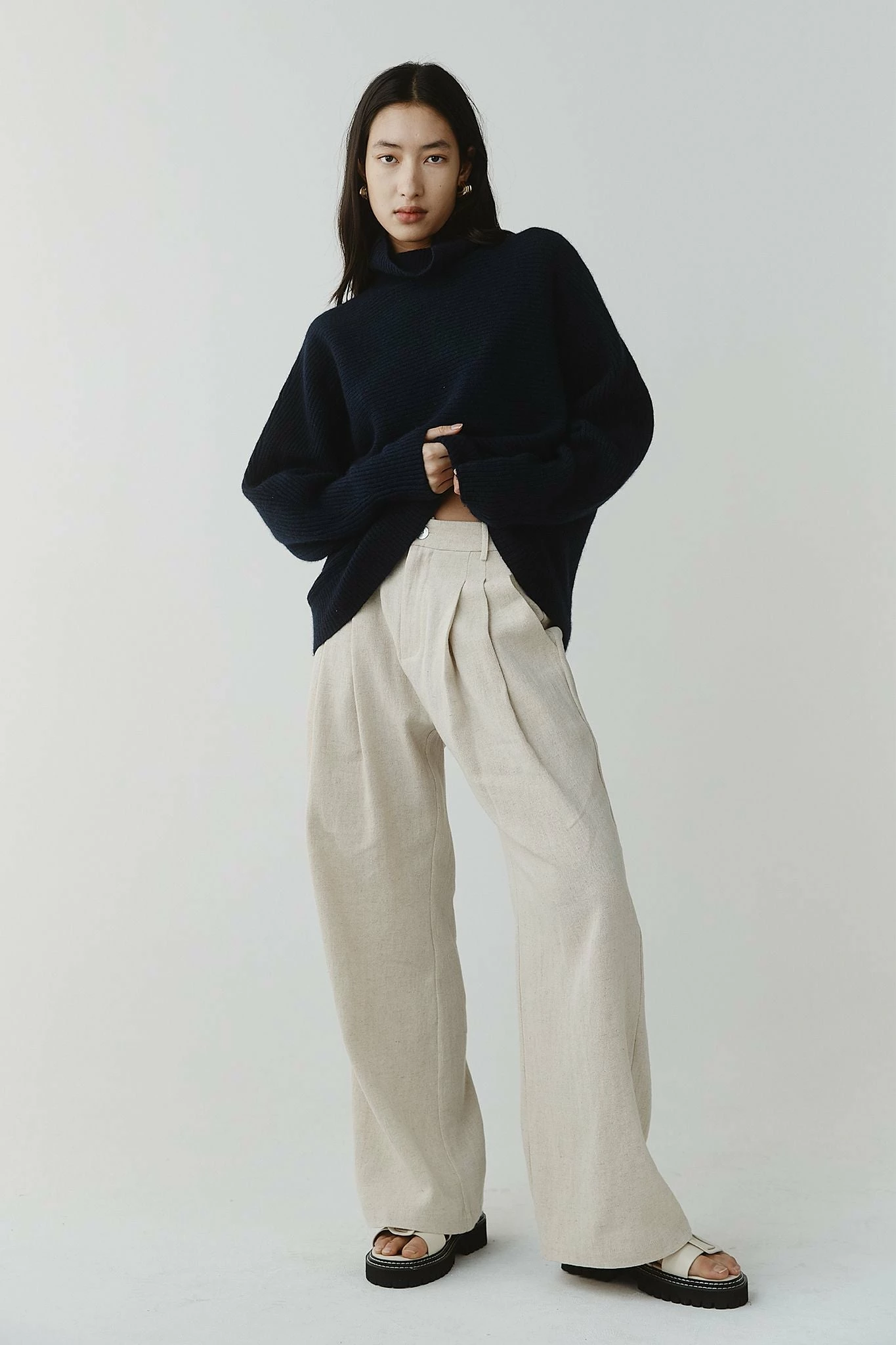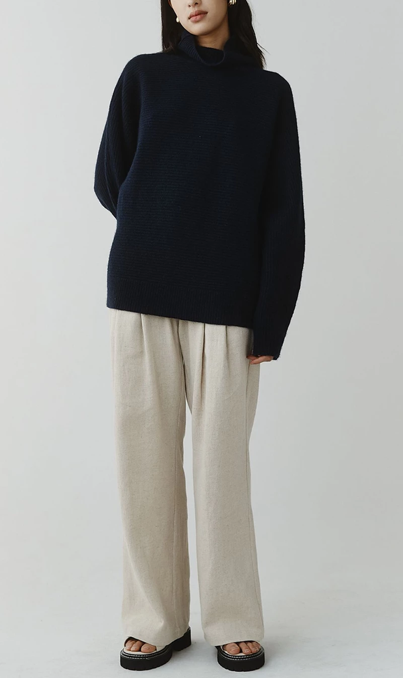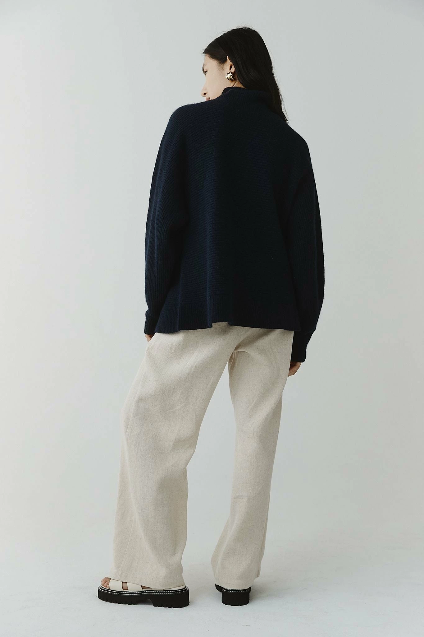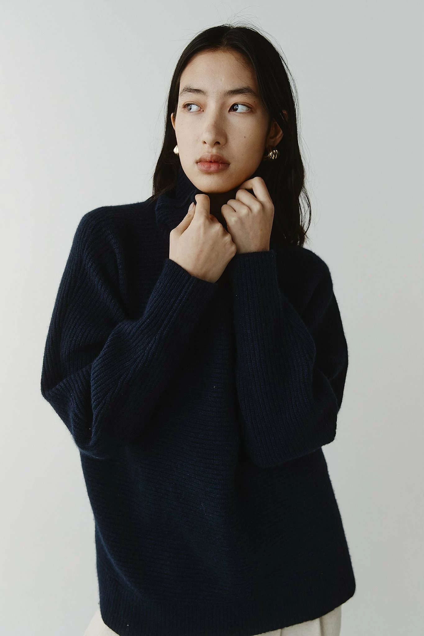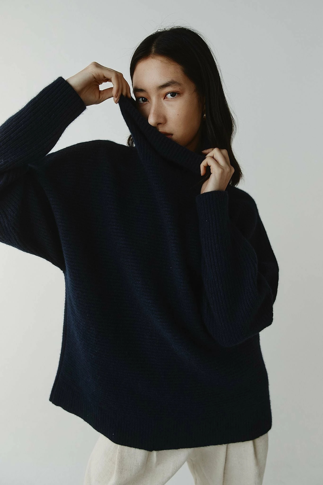 The Marle Dali Jumper in Blueberry is knitted in a beautifully soft wool/cashmere yarn. It has a relaxed silhouette with long sleeves and a drop shoulder. This jumper has an exaggerated and relaxed grown-on collar and features a horizontal rib across the body and a vertical rib at the cuffs of the sleeve and neck.