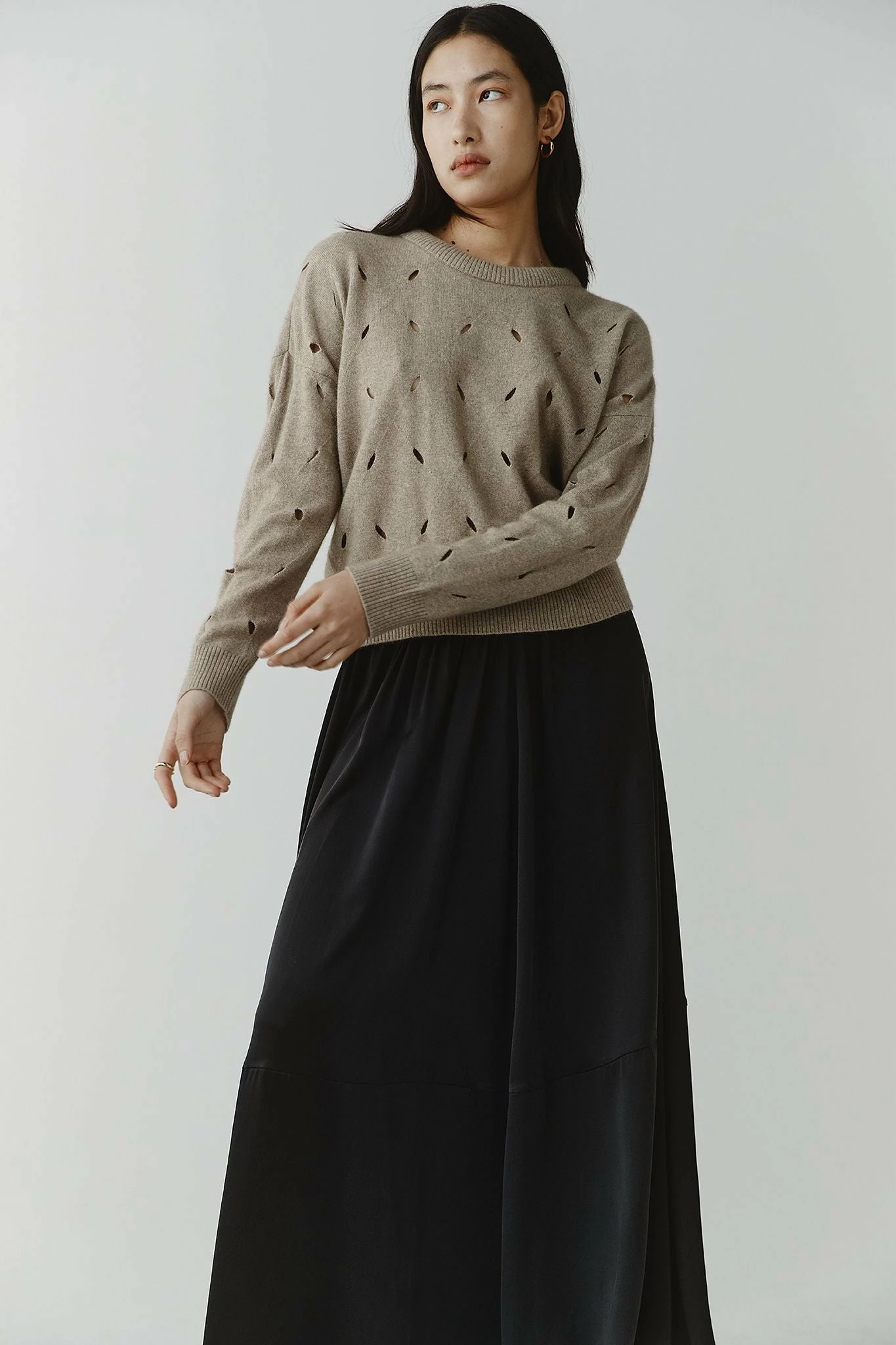 The Marle Etta Jumper in Black is built upon the adored Galla vest and Bon jumper. It is knitted in Marle’s signature Perino yarn, a luxuriously soft, lightweight, and incredibly warm combination of 65% merino, 25% possum and 10% silk. This jumper has a relaxed silhouette, falling at a semi-cropped length. It has a round neckline and long sleeves finished with a delicate leaf motif cut-out detail.
