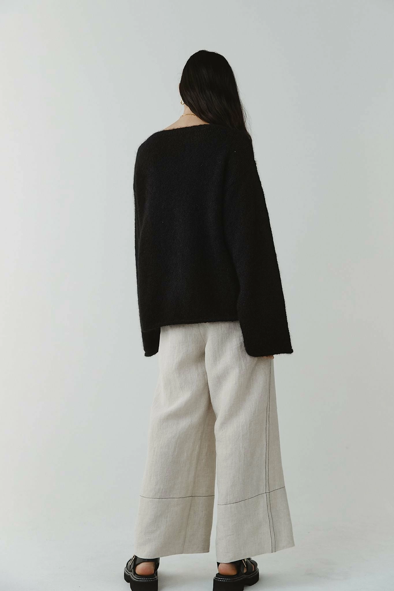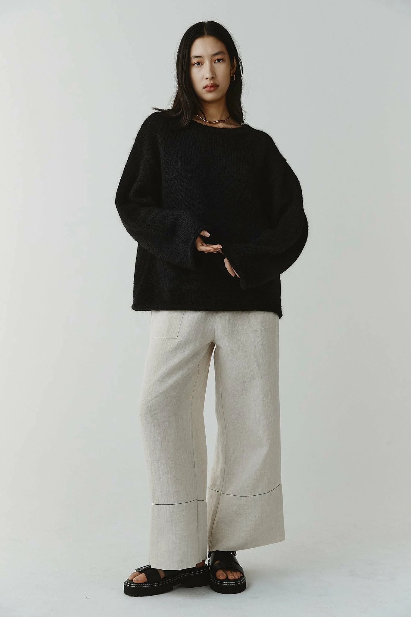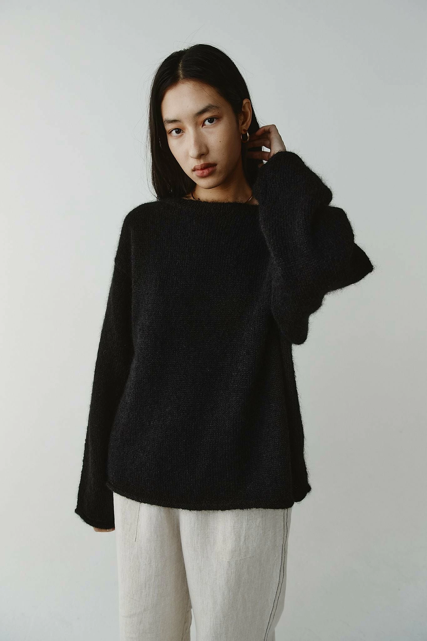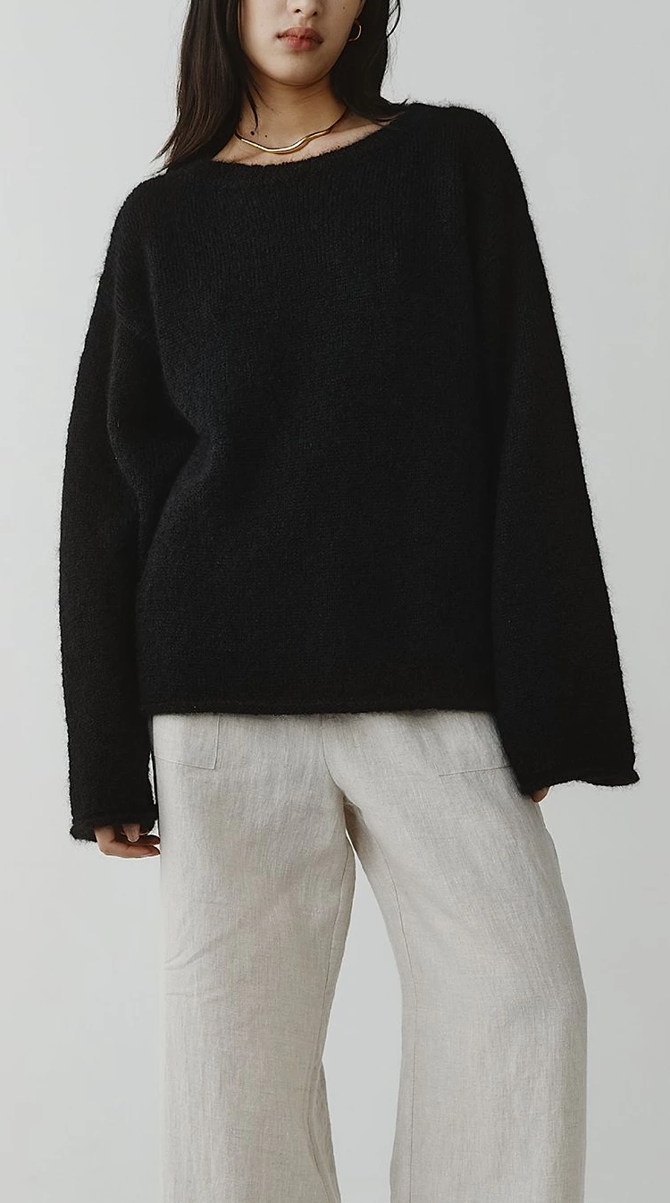 The Marle Maye Jumper in Black is knitted using a mohair/wool yarn. This jumper features an oversized silhouette with a round neckline and long sleeves that gently flare finishing wider at the wrist. The hem of this jumper is left raw which creates a subtle curl.