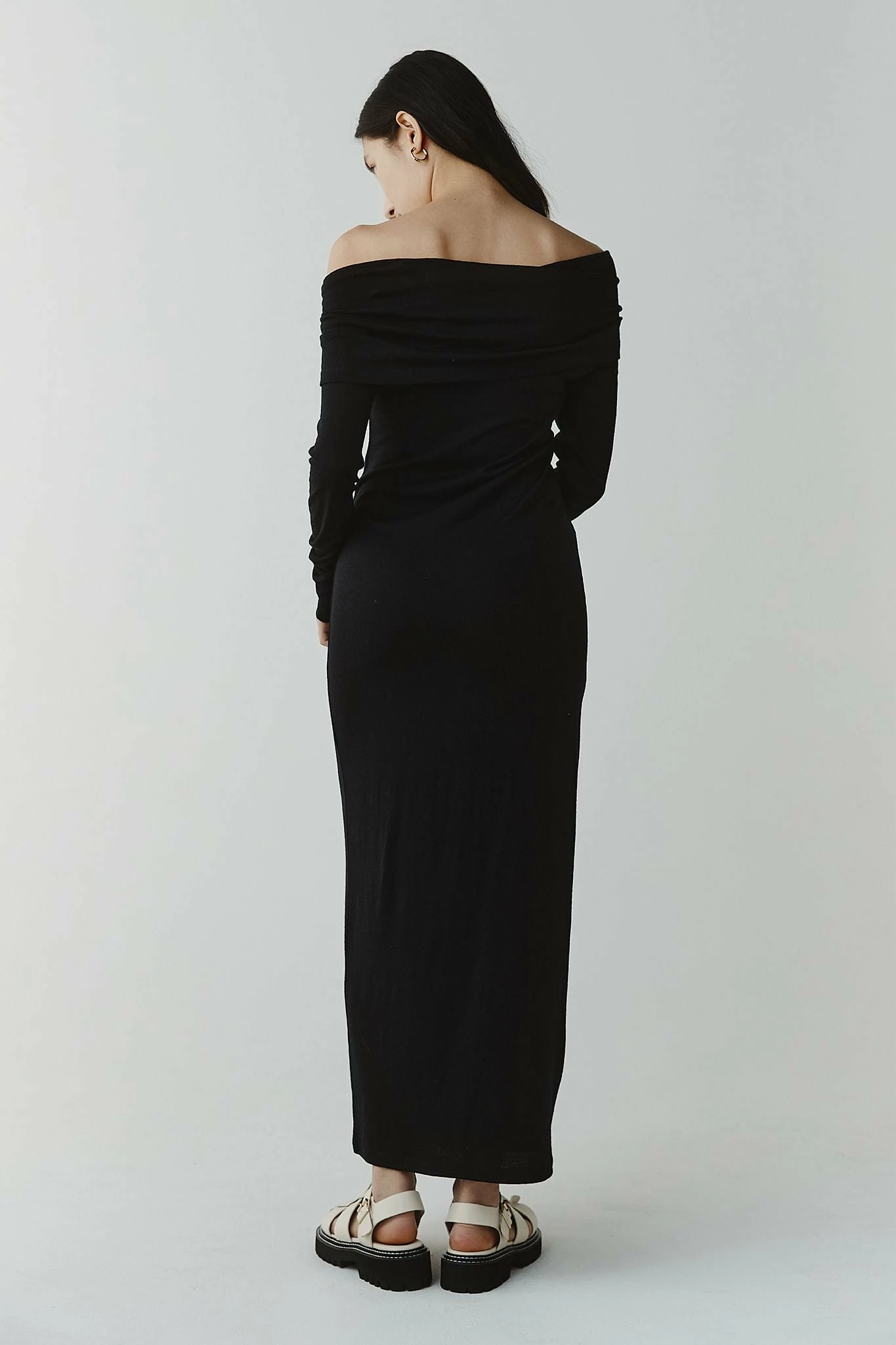 The Marle Riley Dress in Black is designed from the fan favourite, Zellie Top from past seasons. This dress is finely knitted in 100% merino. It has a slim, straight silhouette through the body and long sleeves. The top of this dress features a cross-over detail that wraps around the body and falls off the shoulder creating a feminine silhouette.