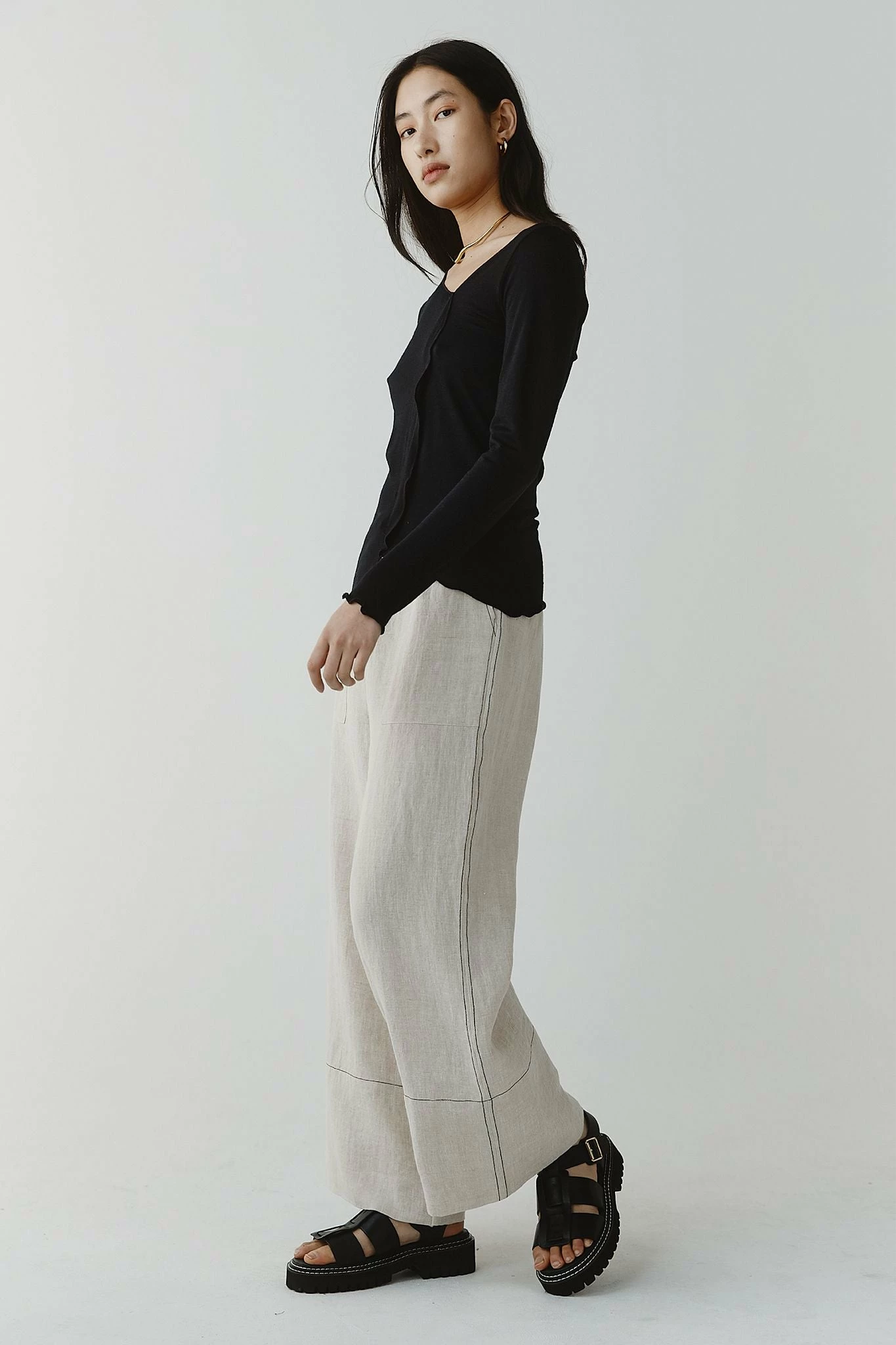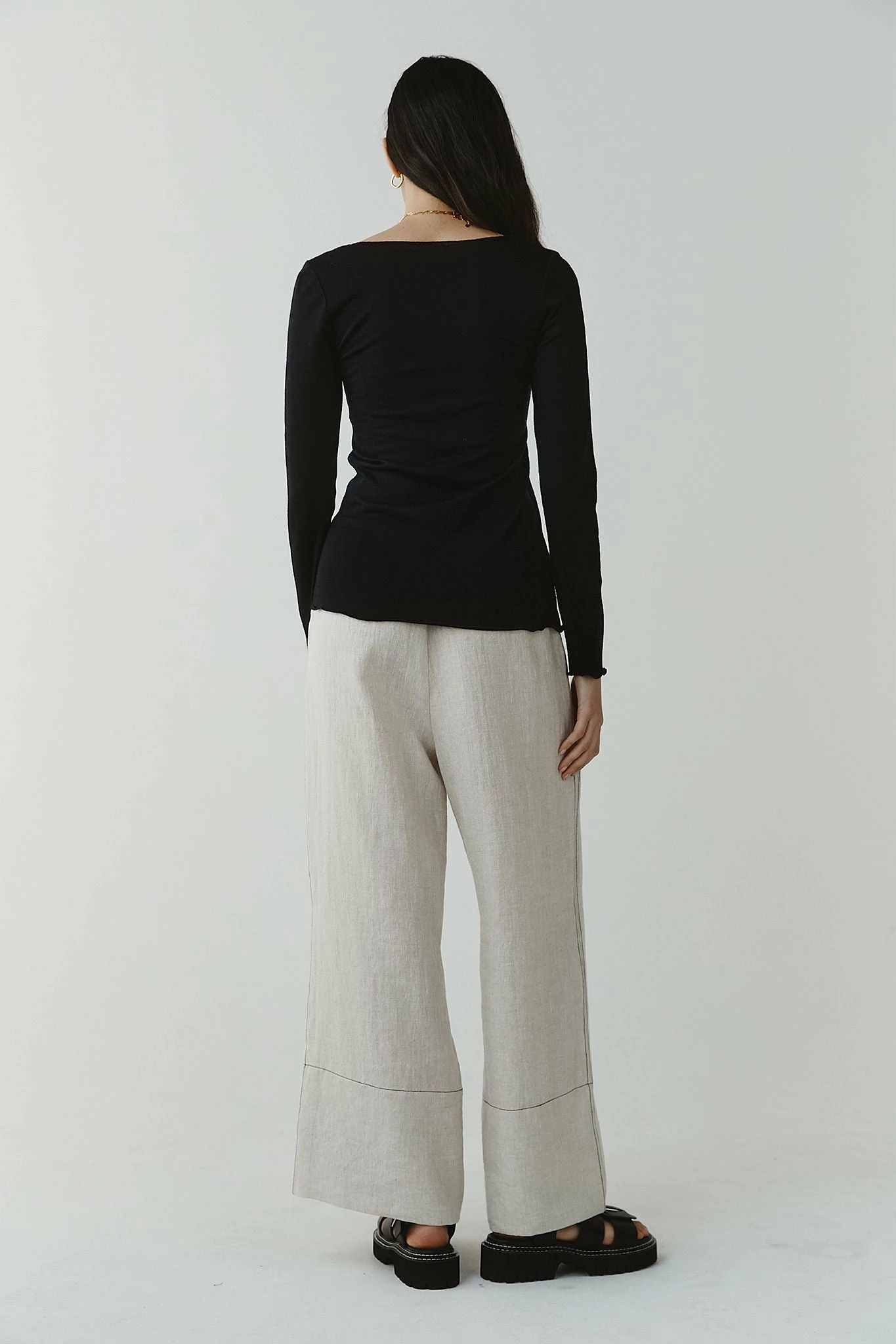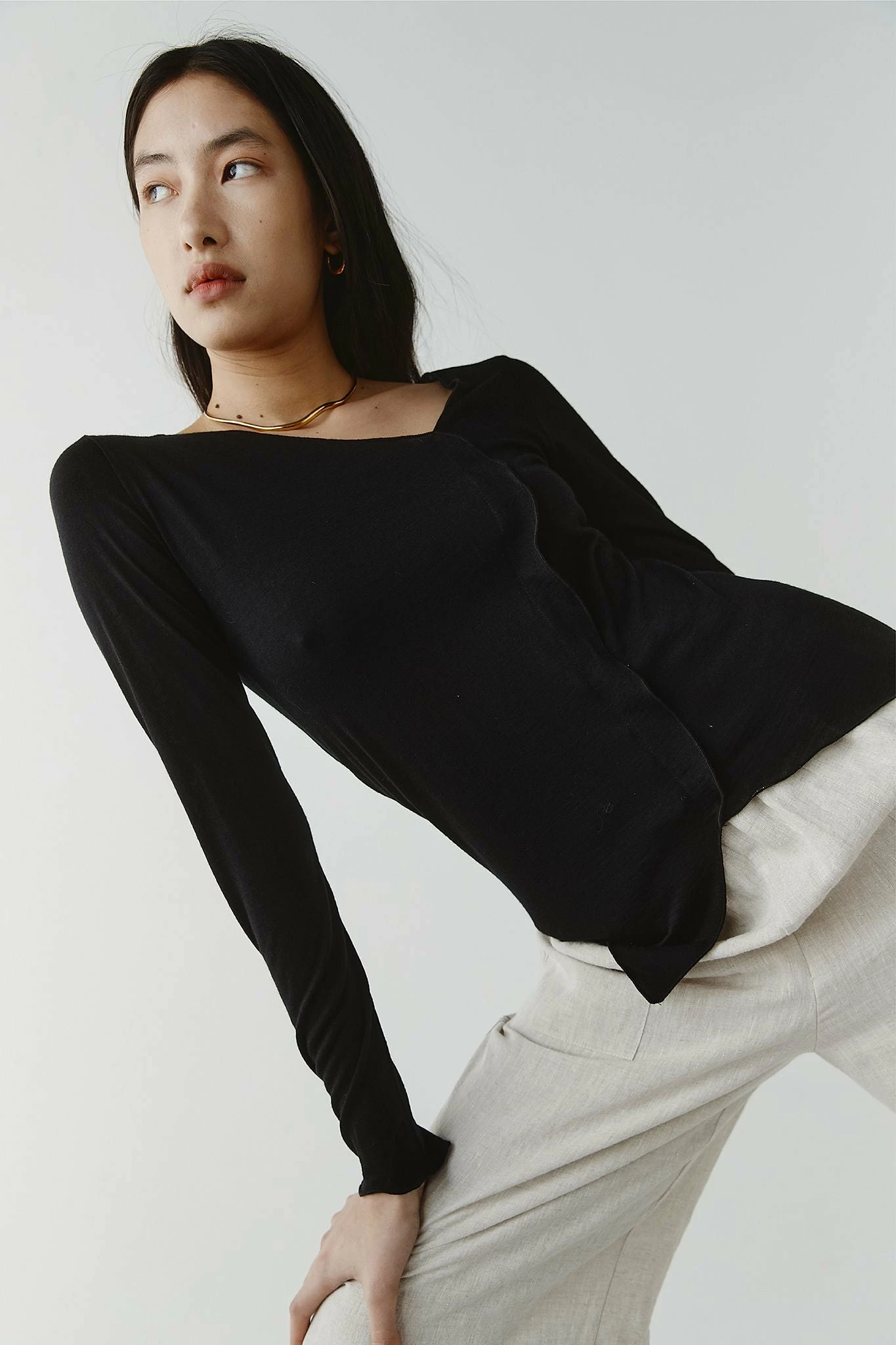 The Marle Sara Top in Black is finely knitted in 100% merino. It has a fitted silhouette with long sleeves and a deep V-neckline with subtle asymmetric detailing. The body of this top has a cross-over detail finished with a slight ruffle down the centre which gives an uneven detail at the hem.