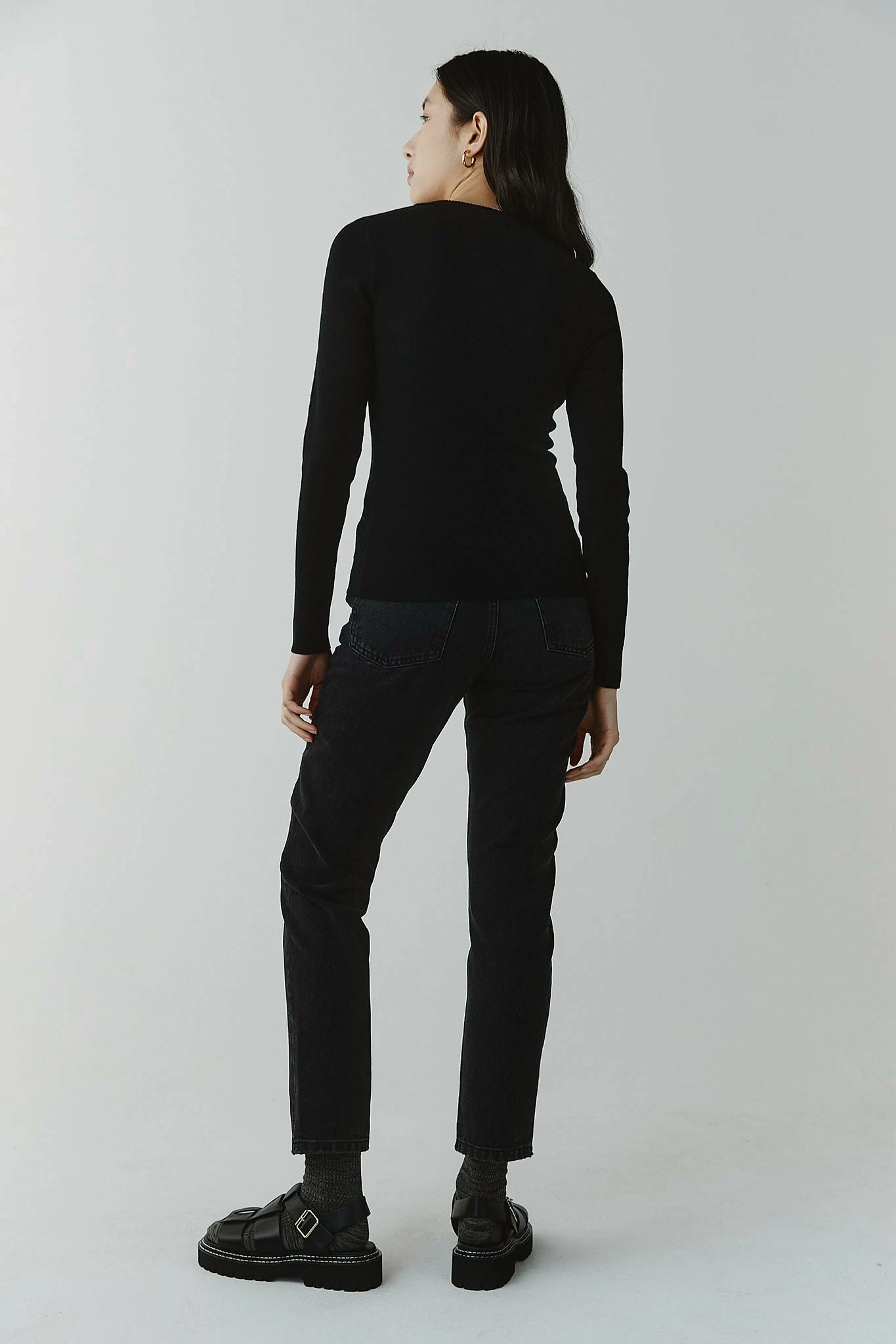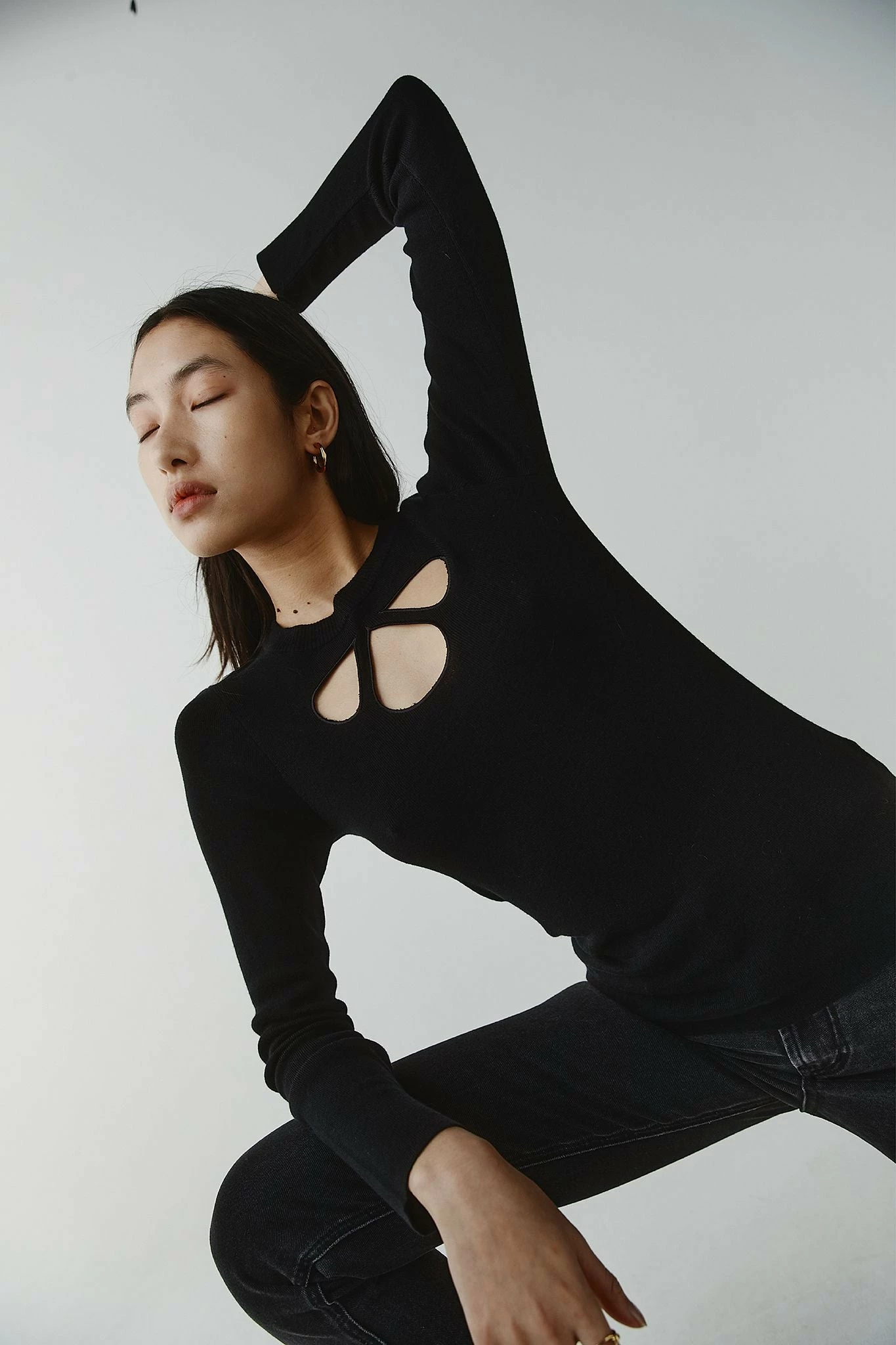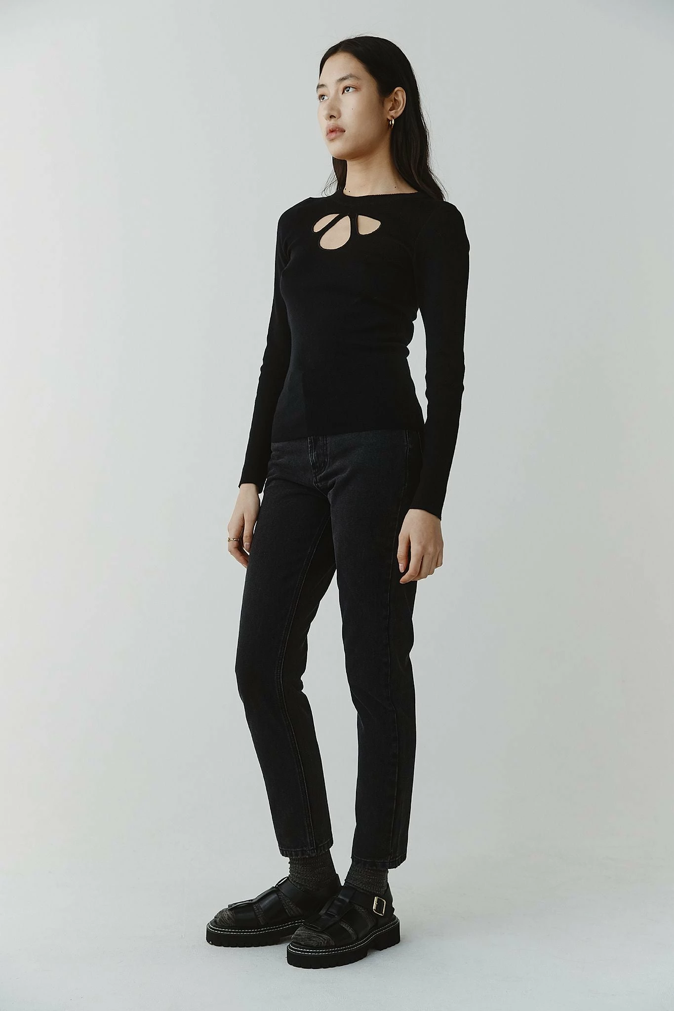 The Marle Zuri Top in Black perfectly elevates your everyday look. Finley knitted in a merino blend, it has a fitted silhouette with long sleeves and a round neckline. Featuring tear-top cut-out detailing to stand out.Ā