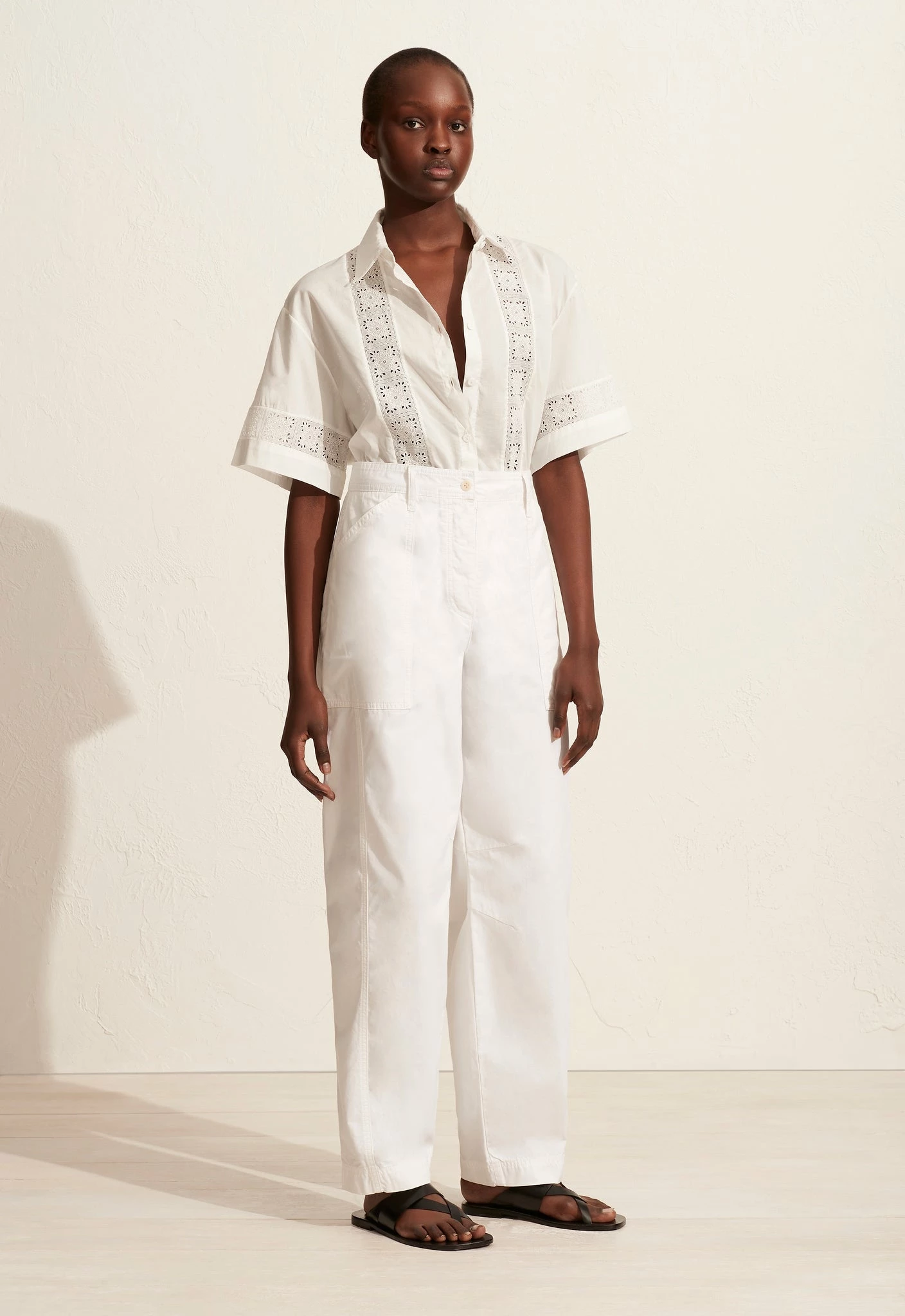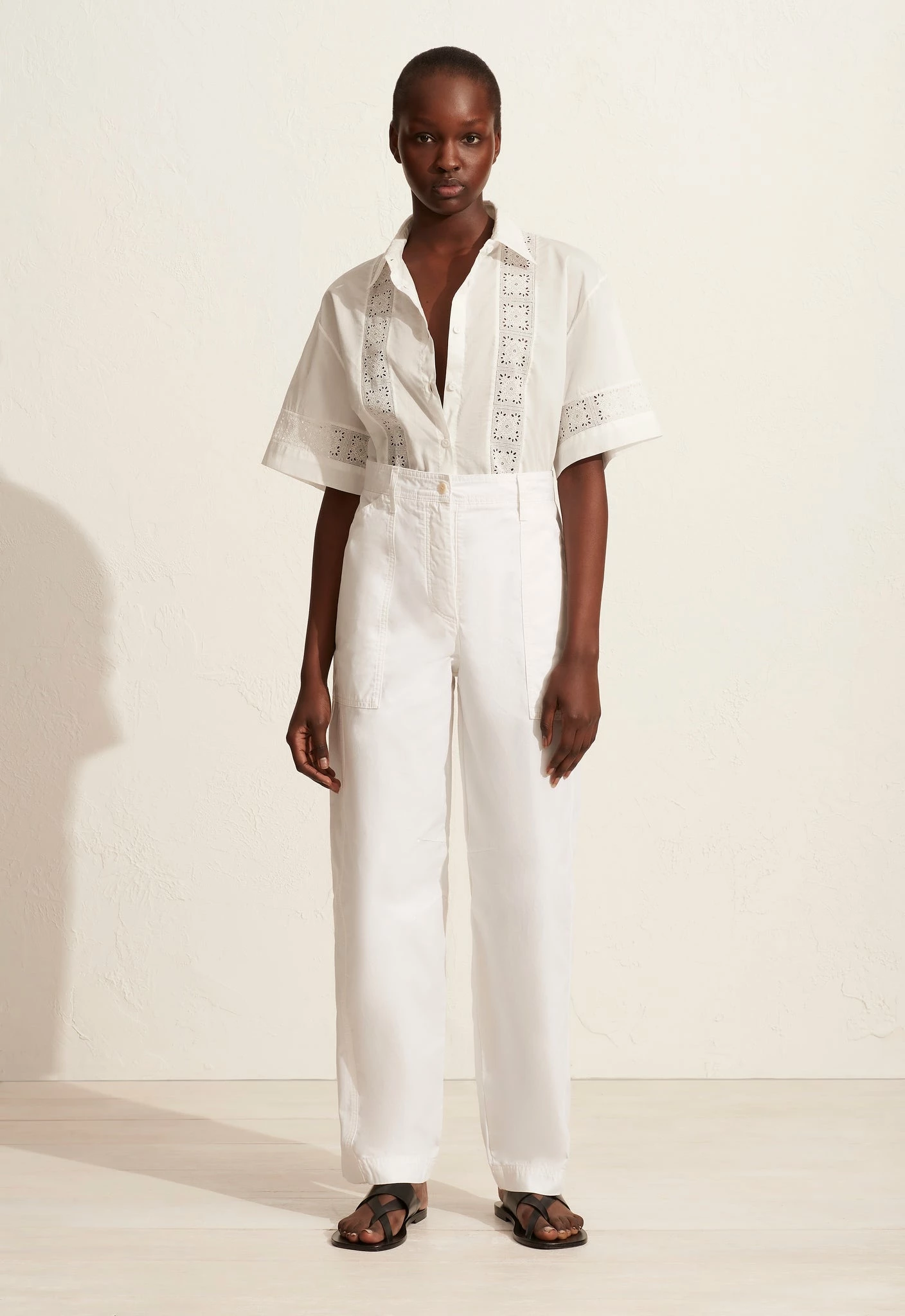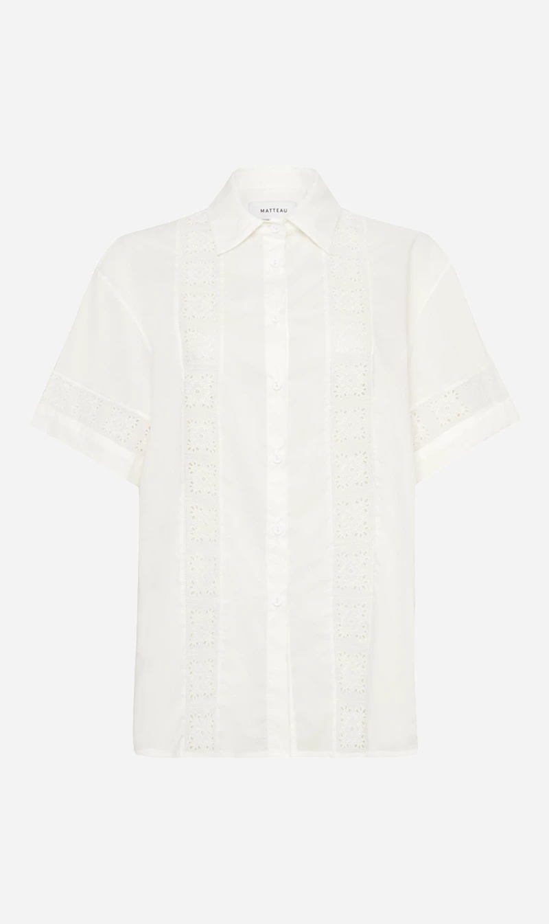 With intricate broderie trim detailing through the front and sleeves, the relaxed Broderie Trim short sleeve shirt by Matteau is an elegant option for warm-weather occasions. Pair with a relaxed fit trouser for a simple, elegant summer look.Â