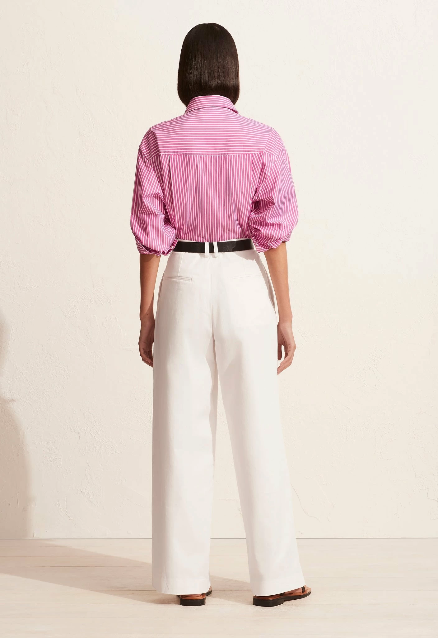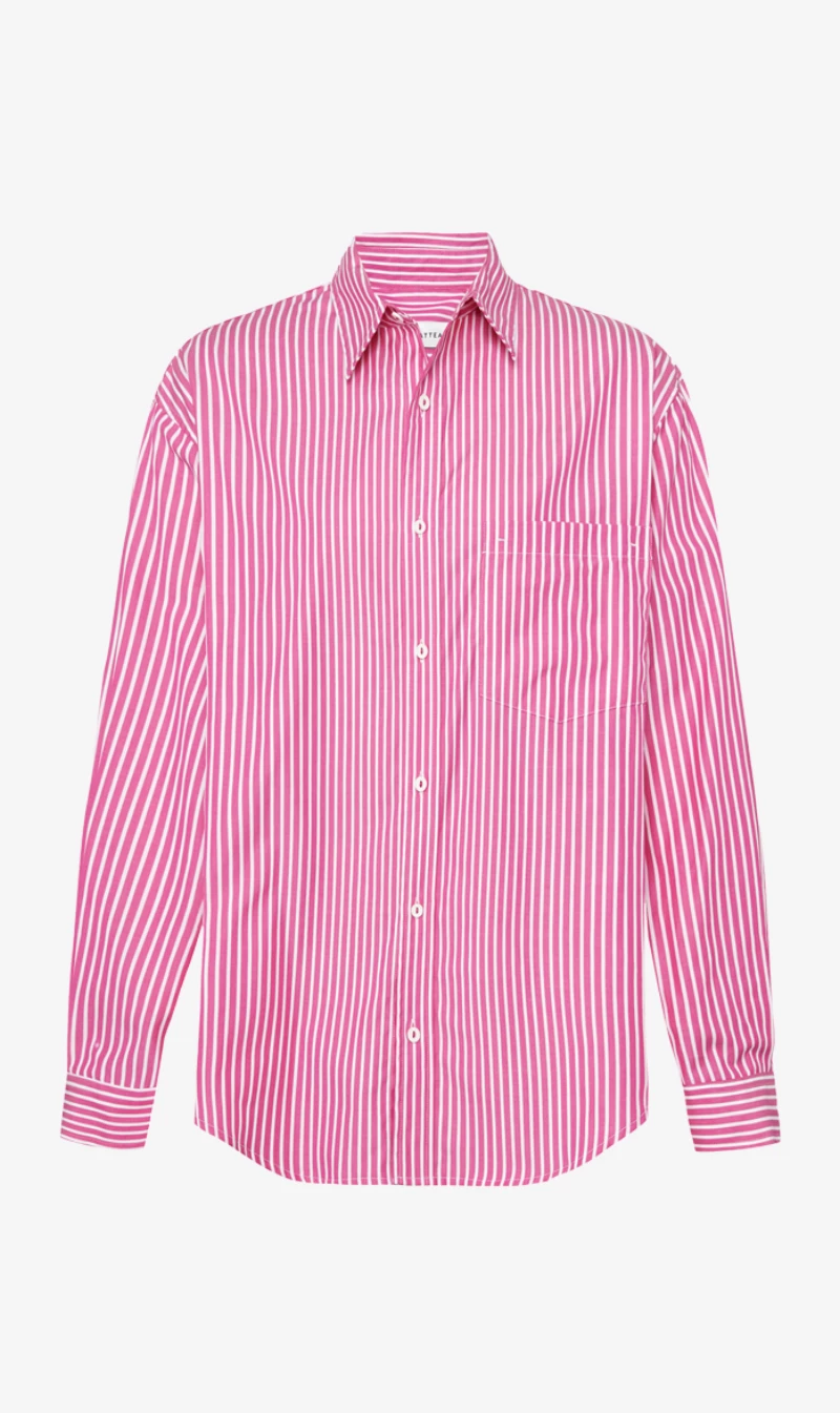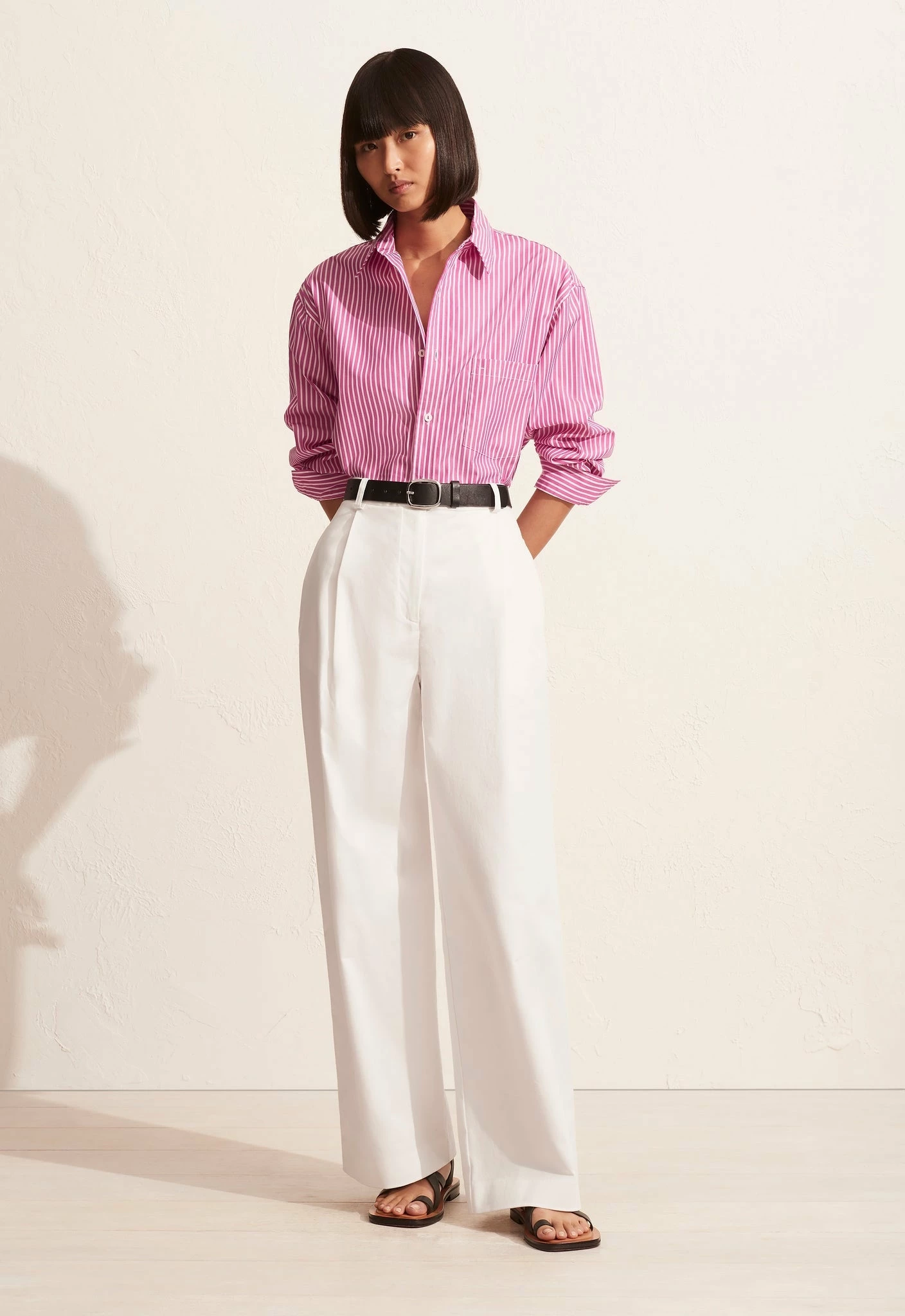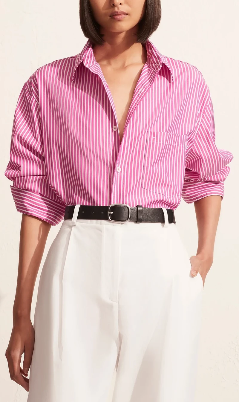 The Matteau Classic Stripe Shirt in Sherbet is a classic menswear-inspired dress shirt with a single front pocket. Bring a pop of pink into your look with the beautiful sherbet colour. Made with organic cotton, this woven stripe shirt offers curved hems at the front and back for sophisticated tailoring. Pair it with white tailored pants for a business look, or unbuttoned over a dress for a casual summertime vibe.Â