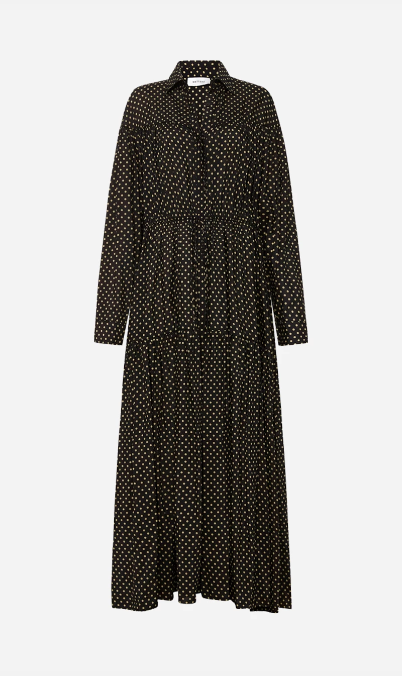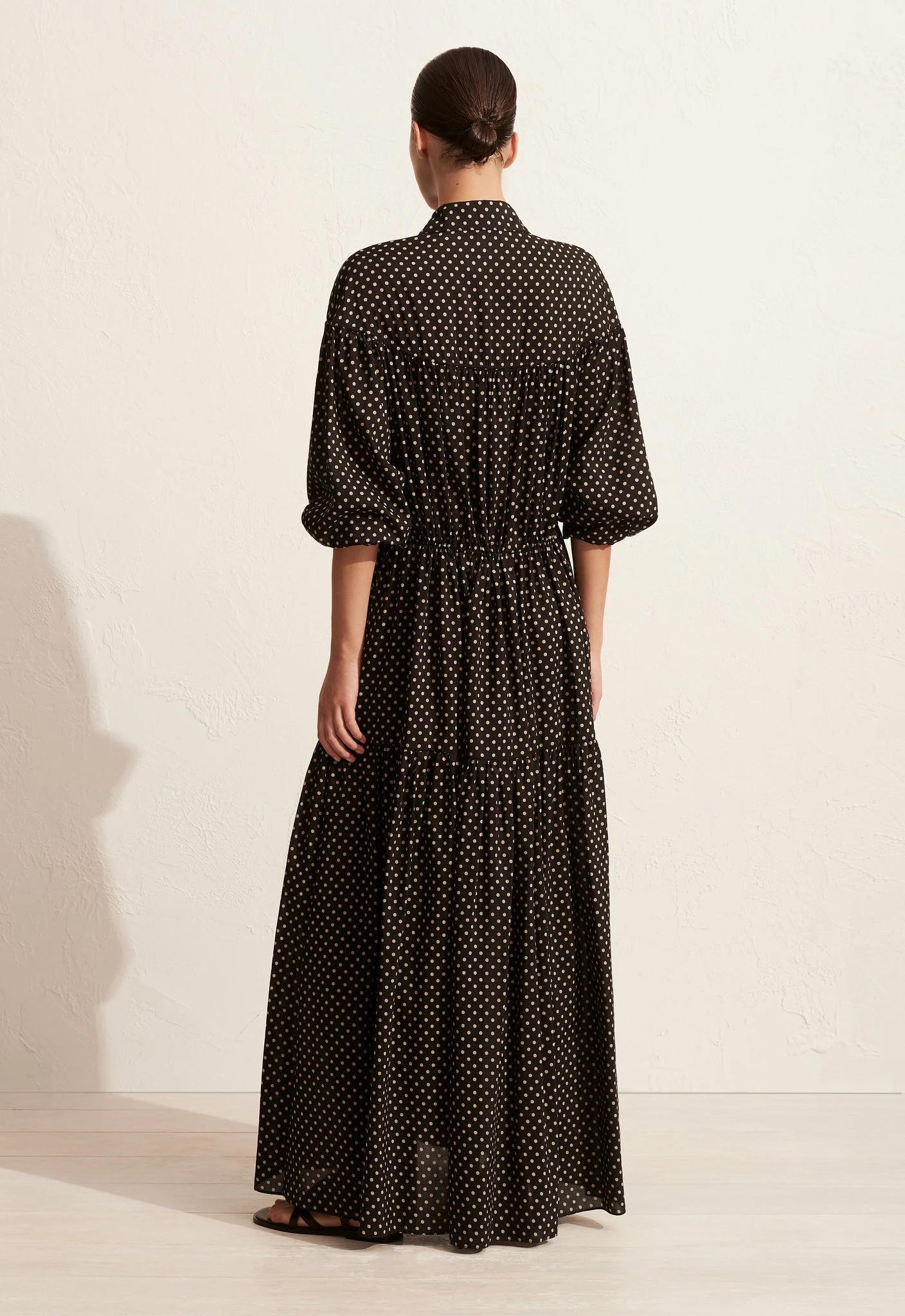 The ultimate in summer elegance, the Tiered Drawcord Dress is a voluminous and soft gathered maxi dress with traditional shirt details. Featuring a shirt-like collar and concealed button placket to hem this dress featured an adjustable drawcord with tie at yoke and waist. A relaxed fit sleeve with a button cuff completes the look alongside practical side pockets.Â