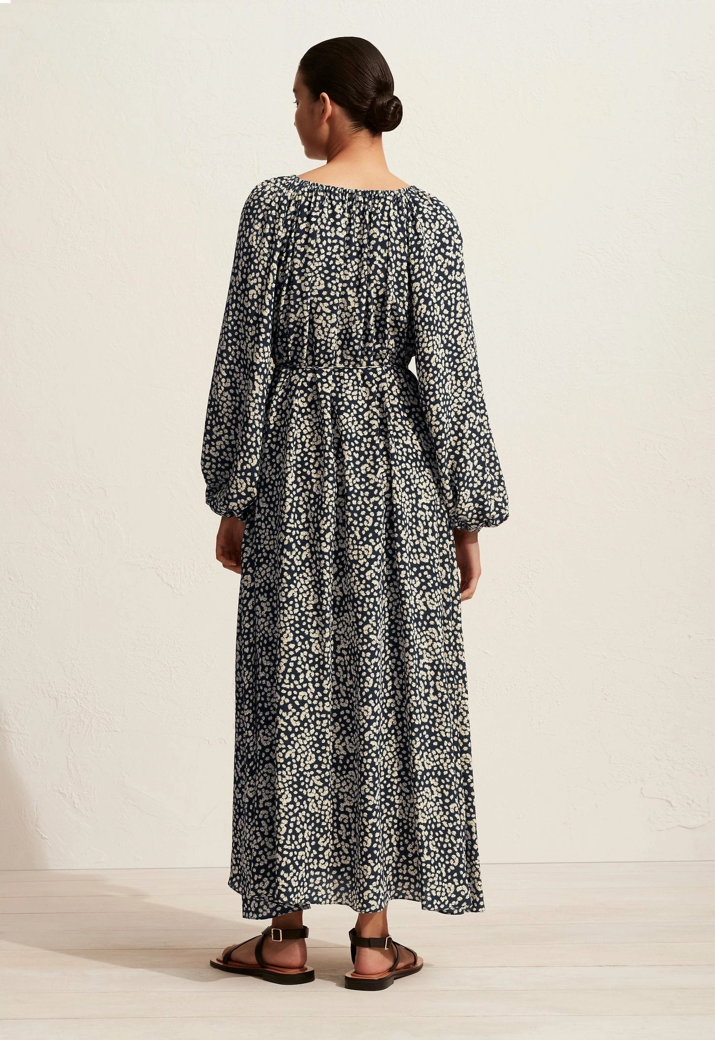 The Matteau Voluminous V Neck Dress in Midnight Daisy. A billowing dress with deep V neckline finished with a front welt detail and keyhole opening with neck tie. Balloon sleeves with elasticated cuffs and side pockets.
