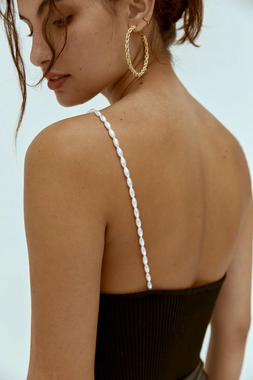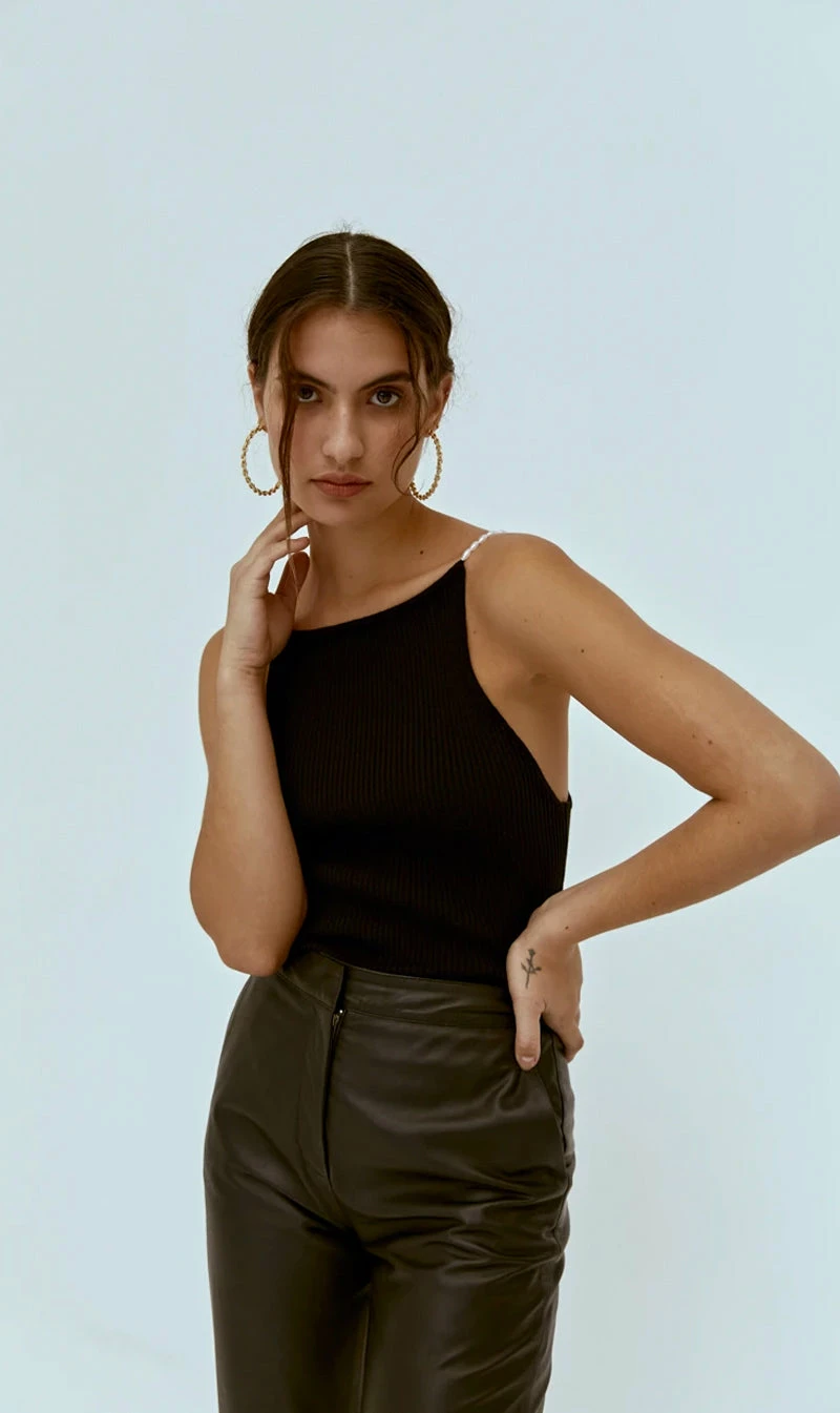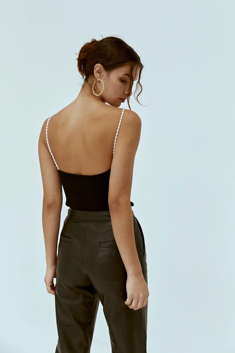 The Musier Paris Lena Top in Black. A Halter top in ribbed fabrication featuring a low back and finished with pearl straps.