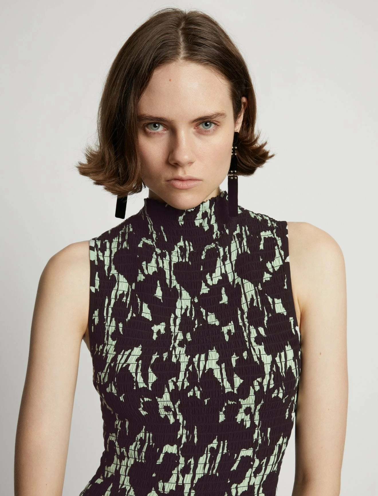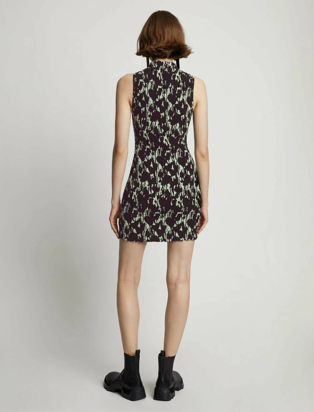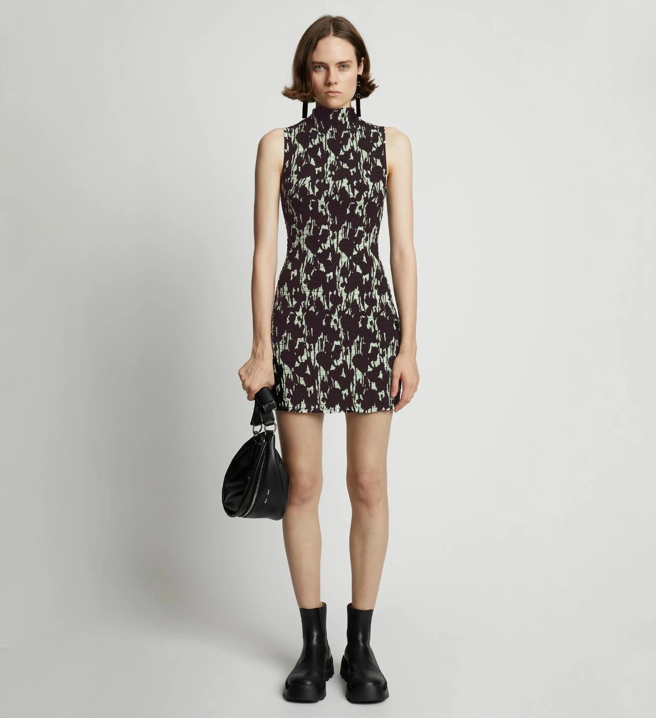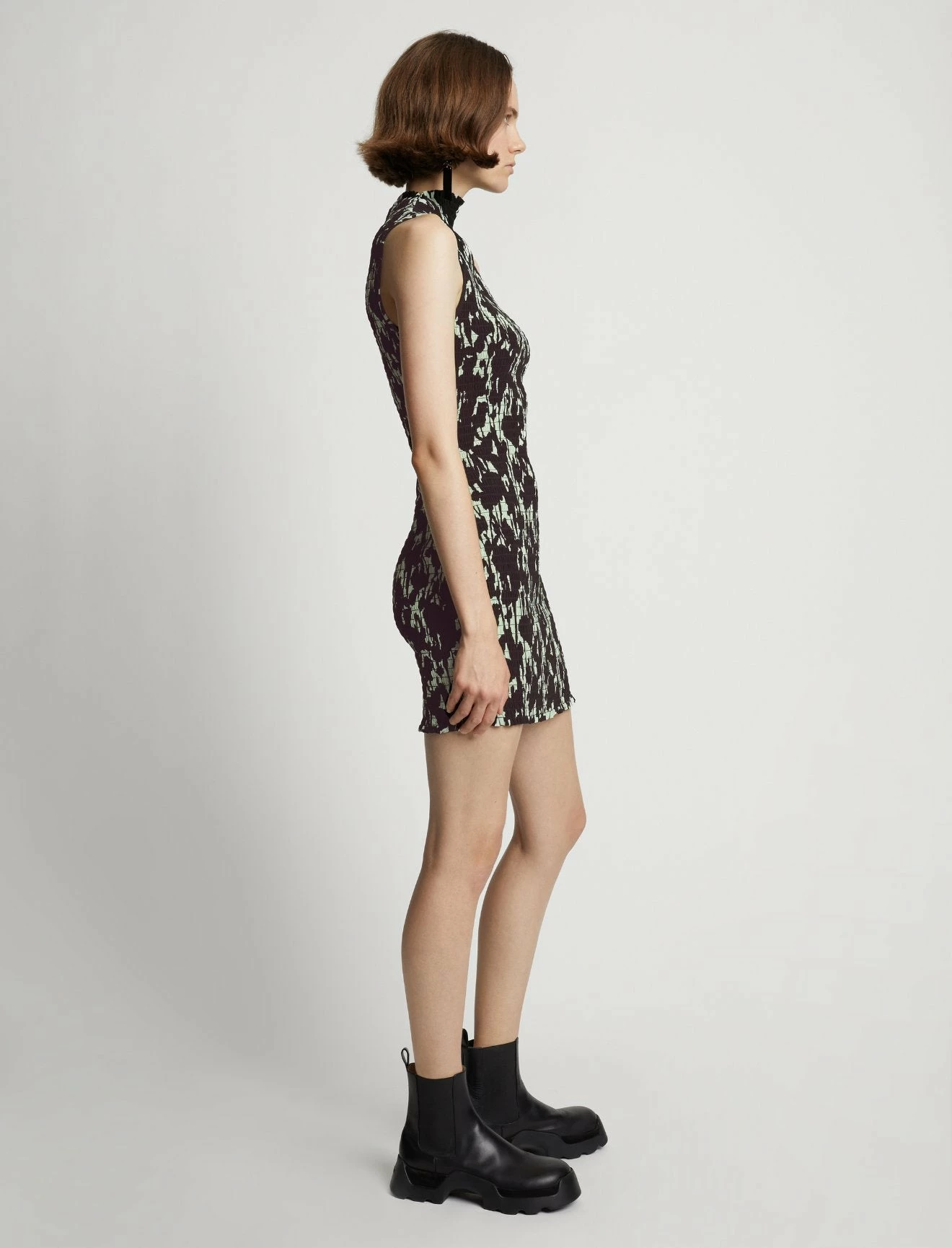 Chic, fun and playful, the Printed Smocked Mini Dress by Proenza Schouler White Label is cut to a close-fitting silhouette and features a beautiful mint-green and black floral print. Completely smocked through the body, this high-neck mini is elegant enough to pair with a nighttime strappy sandal or to dress down with a simple denim jacket.