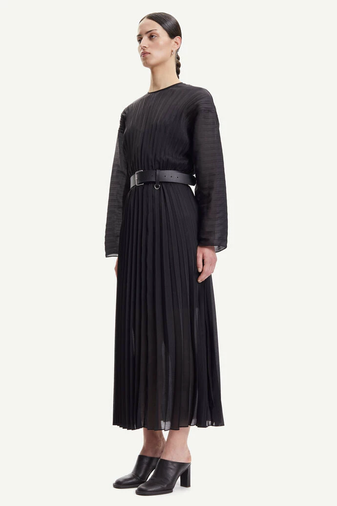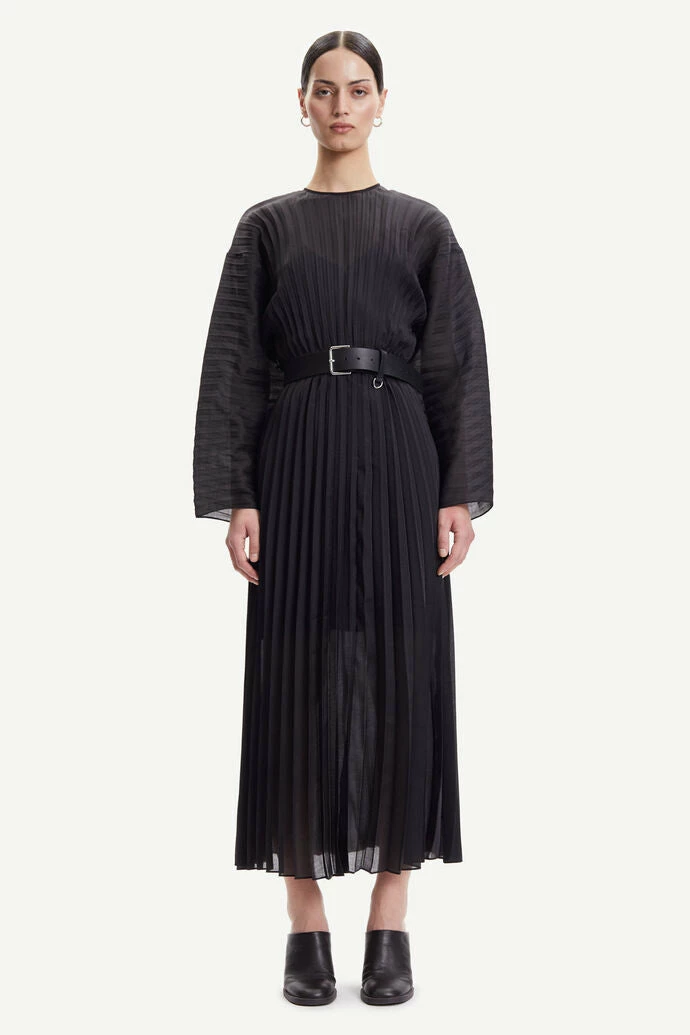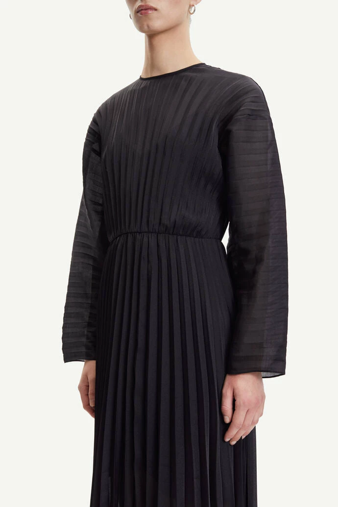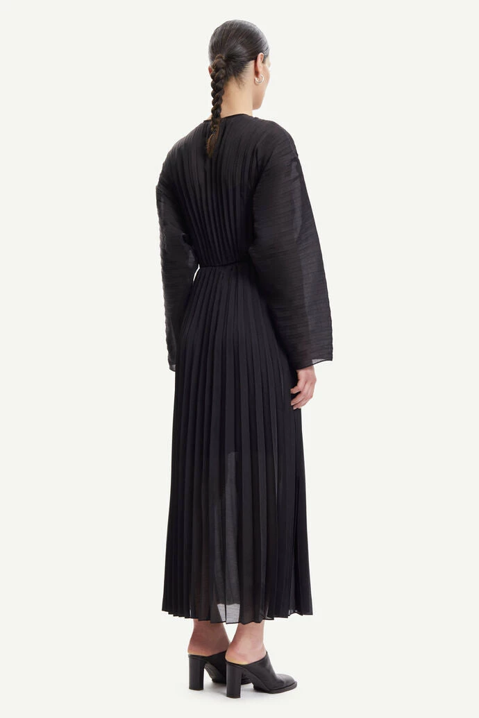 The Annica Long Dress by Samsoe Samsoe features the most elegant pleat details. Relaxed fitting pleated maxi dress with voluminous long sleeves. Back neck keyhole detail. Slip dress lining. Recycled polyester blend fabric.
