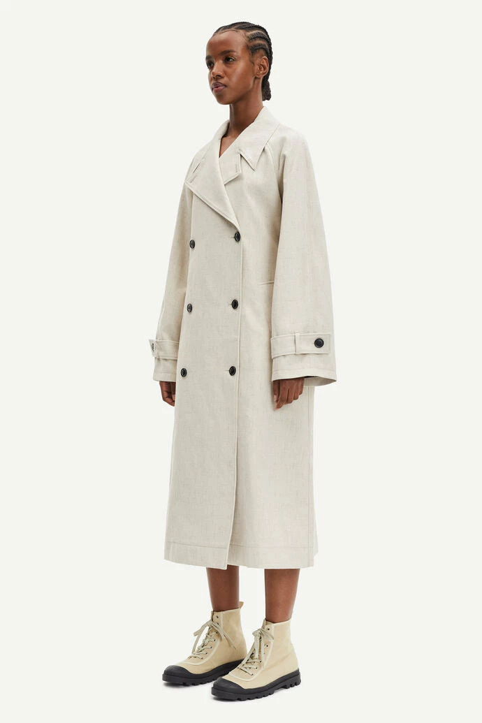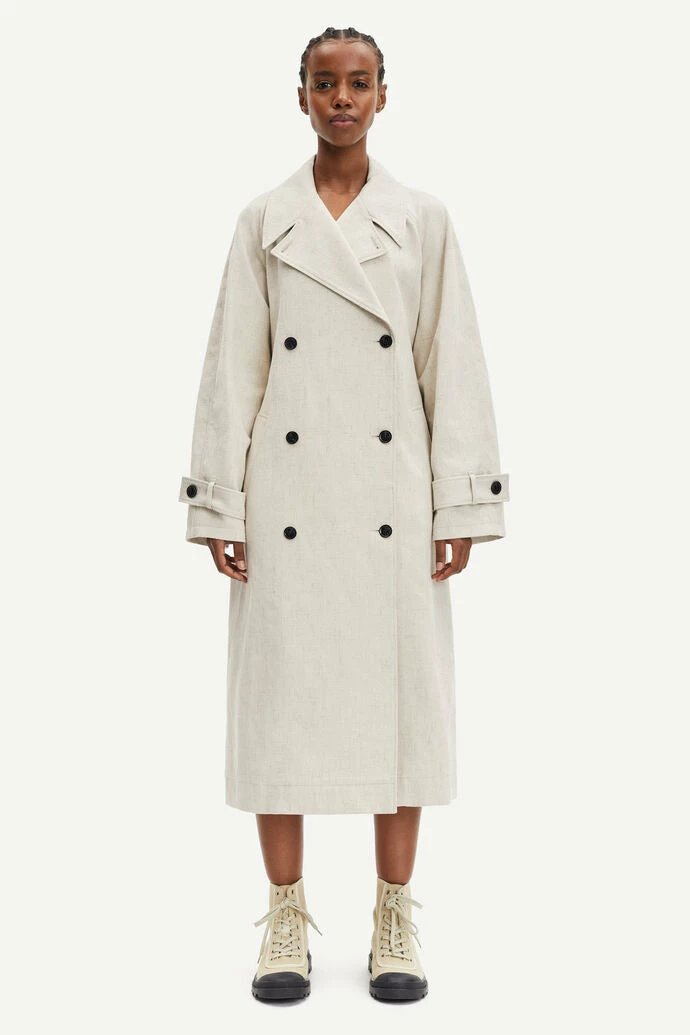 The Samsoe Samsoe Belle Trench features a double breasted trench coat with notched lapel collar. Cuff straps, belted waist, front pockets. Bound seams. Double-faced fabric, cotton, polyester and linen blend with textured slubbed surface.