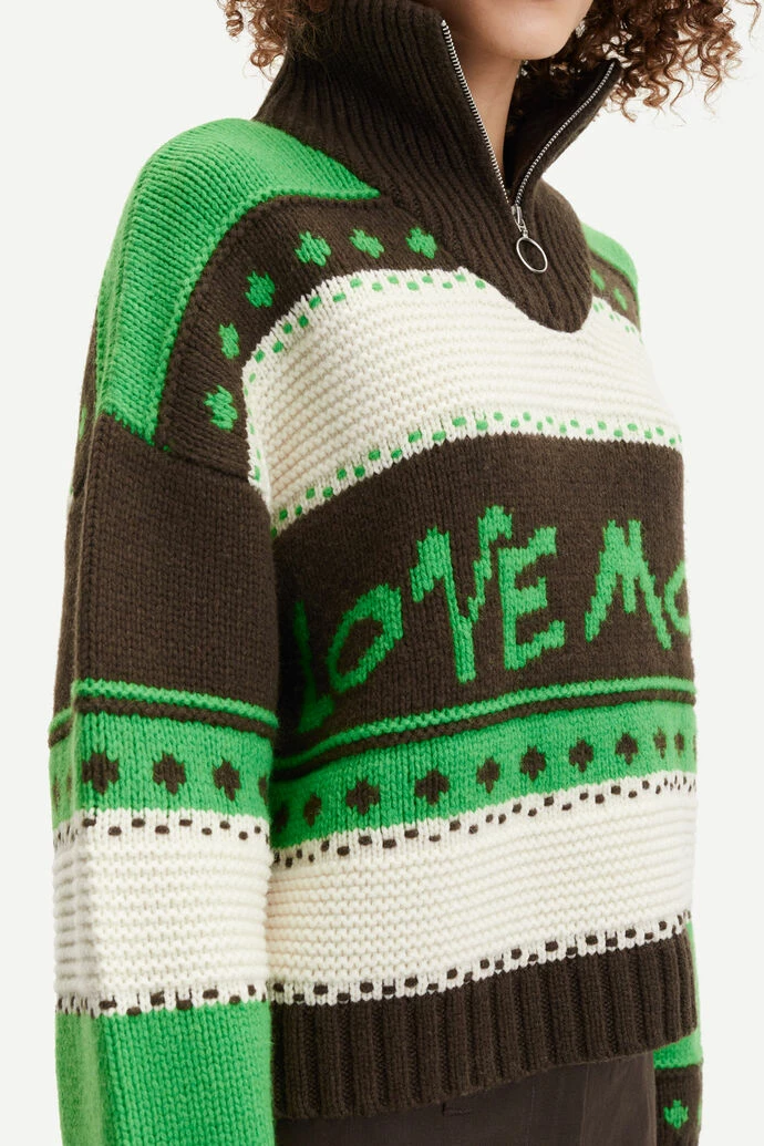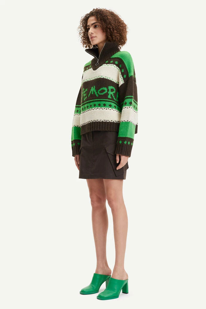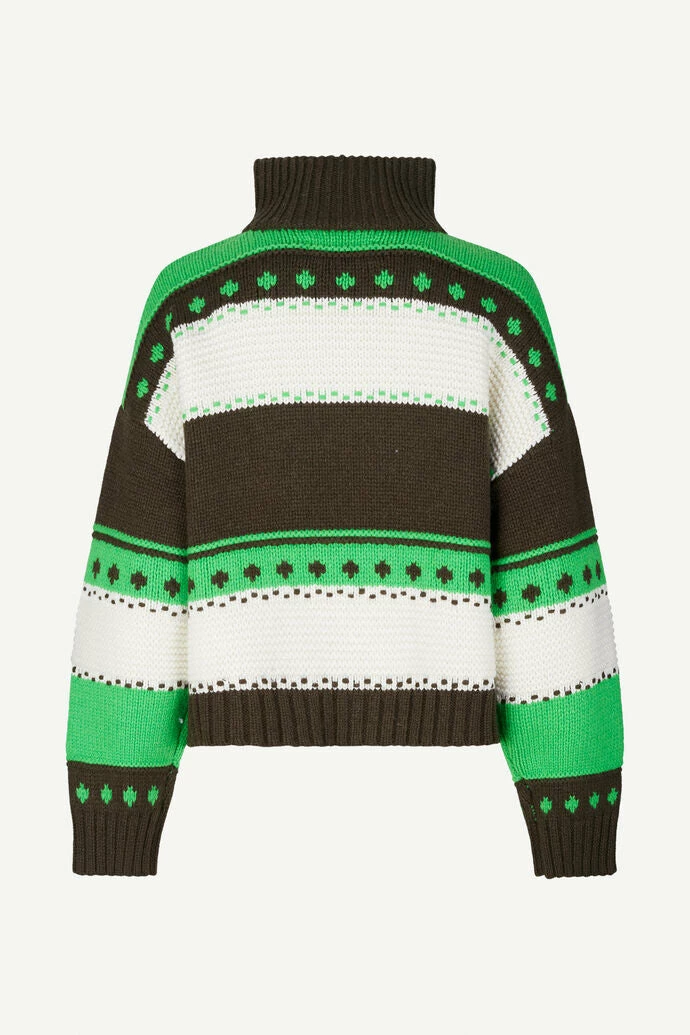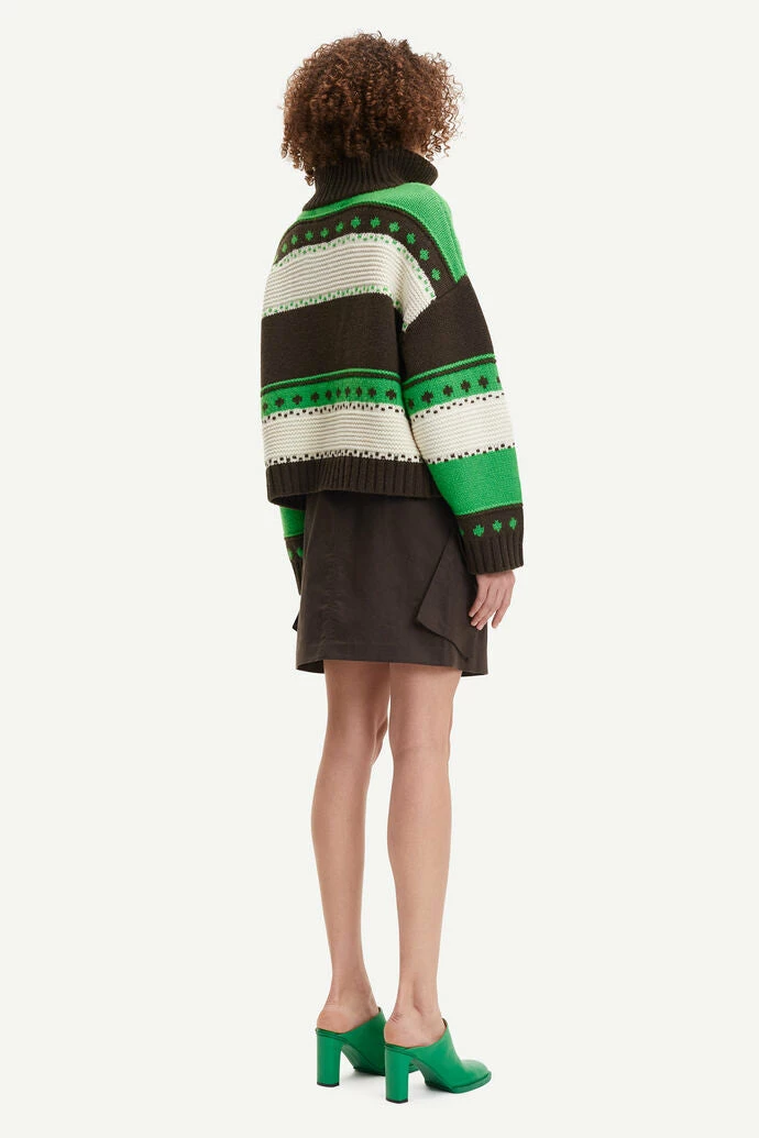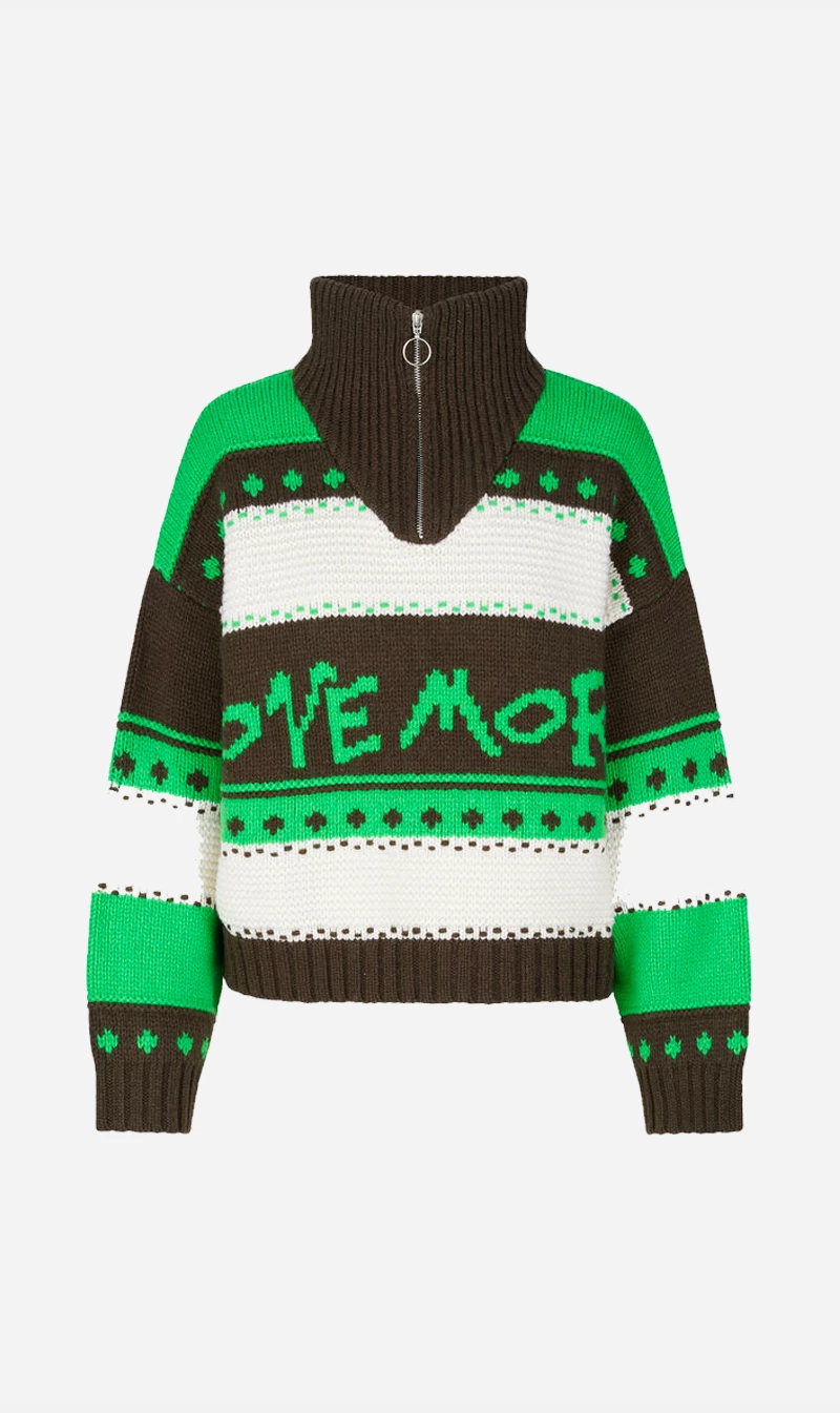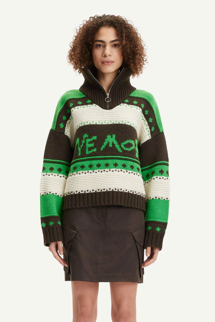 Perfect for ski season, perfect for any season. The Samsoe Samsoe Ekei Turtleneck Zip is a boxy fitting jumper with dropped shoulders and a zip-neck ribbed collar. Crafted in heritage knit, this jumper has long sleeves, rib trims and a graphic jacquard pattern. Chunky gauge wool and polyamide blend yarn make for a cosy throw on to pair with denim or over a summer dress.