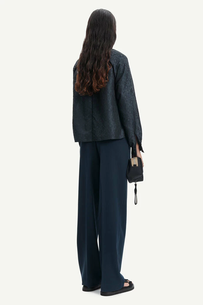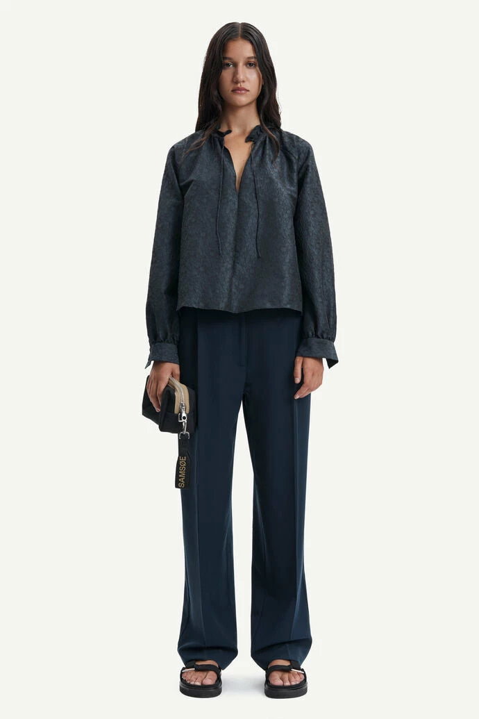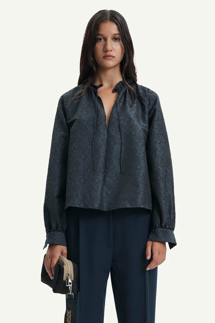 The Samsoe Samsoe Karookhi Blouse in Salute is a relaxed-fitting blouse that will elevate your look. Tie-fastening front neck opening with a gathered neckline and a frilled collar. Recycled polyester blend fabric with a tonal textured jacquard pattern. This product is GRS certified. Each stage of Samsoe Samsoe’s supply chain has met strict social, environmental, and chemical requirements.