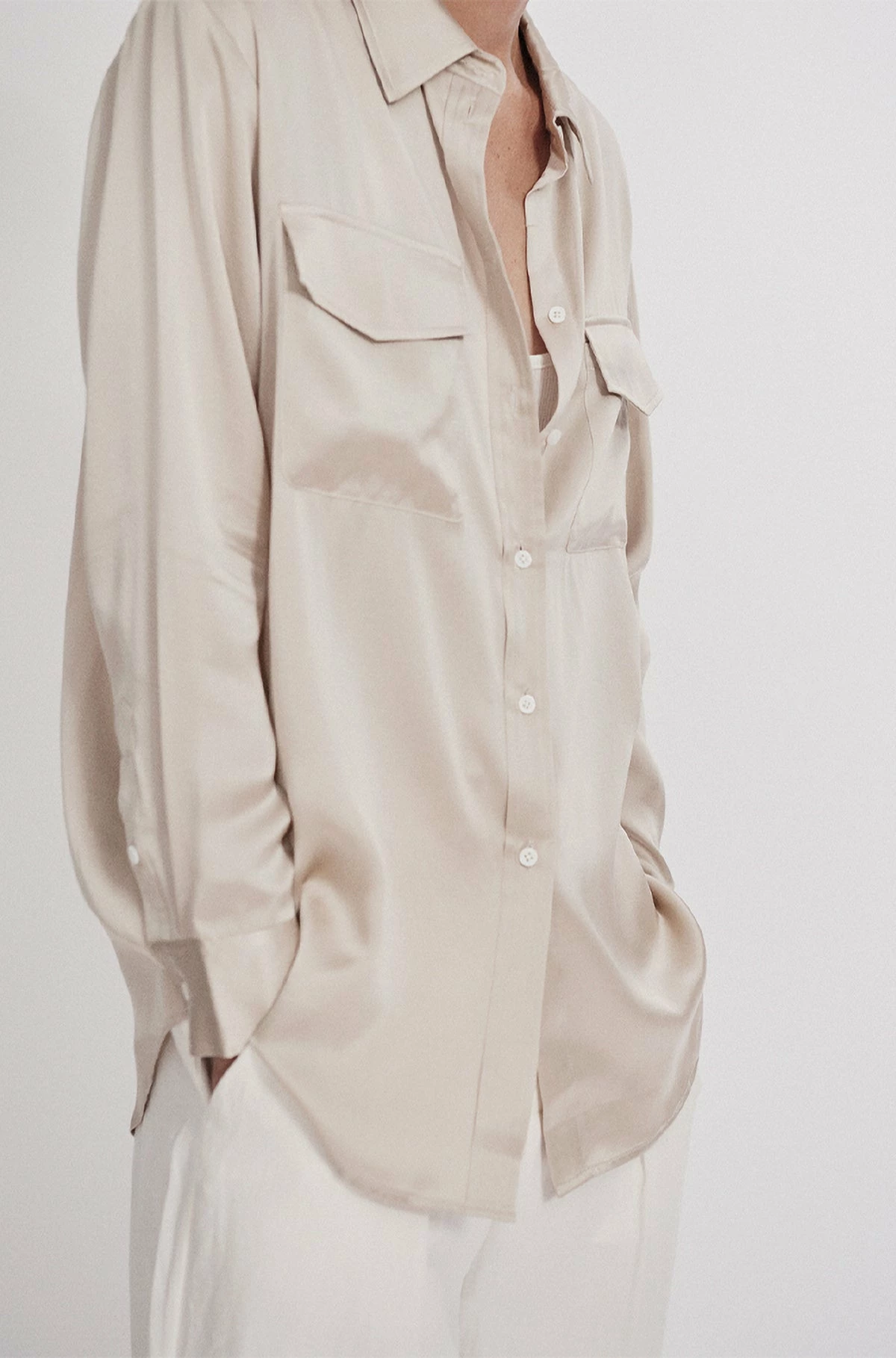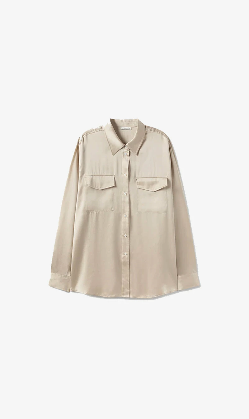 The Silk Laundry Boyfriend Shirt in Hazelnut. Designed to echo an original menswear style, cut from a glossy sandwashed silk, this everyday shirt looks great half-tucked into a tailored pant or left loose over our Bias Cut Pant. The relaxed fit is paired with a button-down front and utility pockets to create the versatility needed in everyday life.