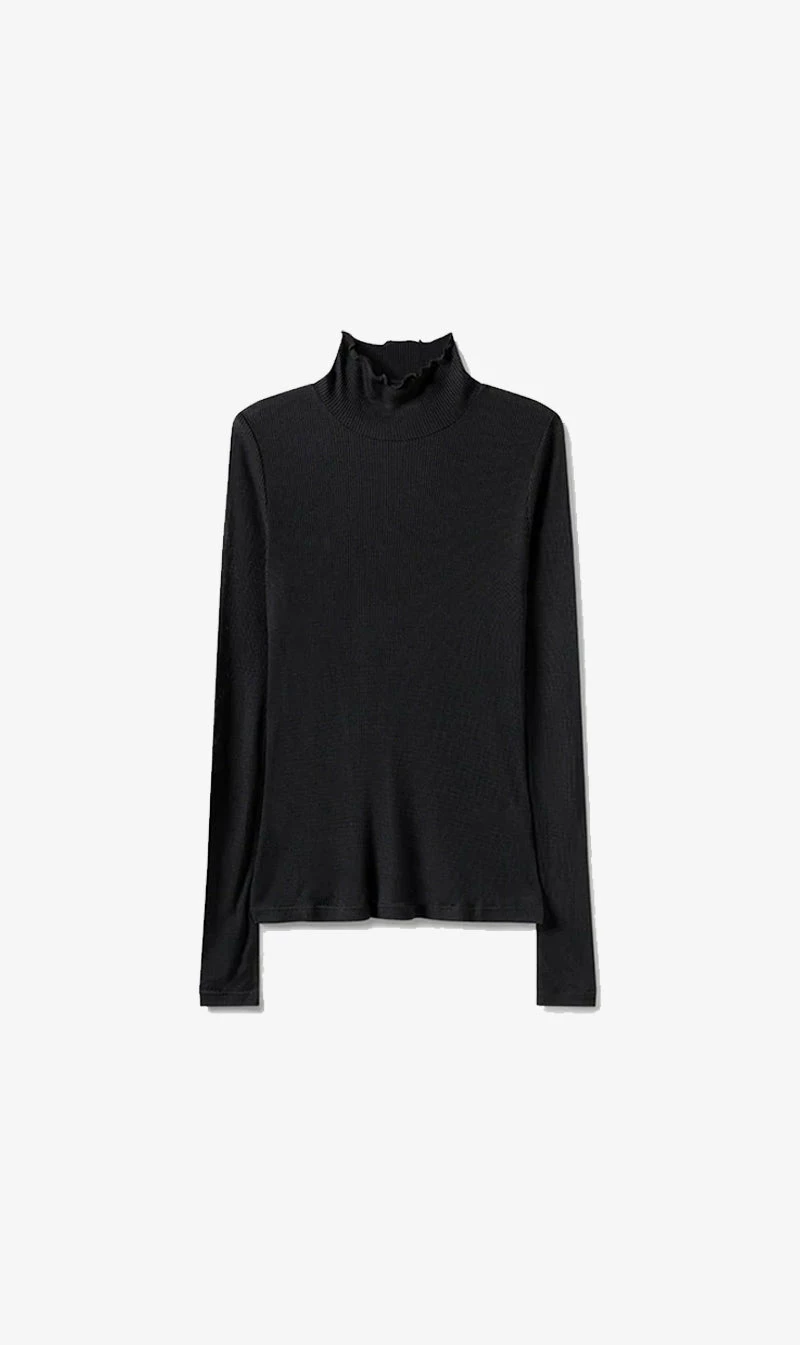 The Silk Laundry Ribbed Turtleneck in Black. An essential Silk Laundry style with a soft neckline that is impossibly comfortable and especially soft. Made from a ribbed silk that has been finely woven to create the perfect, barely-there texture.
