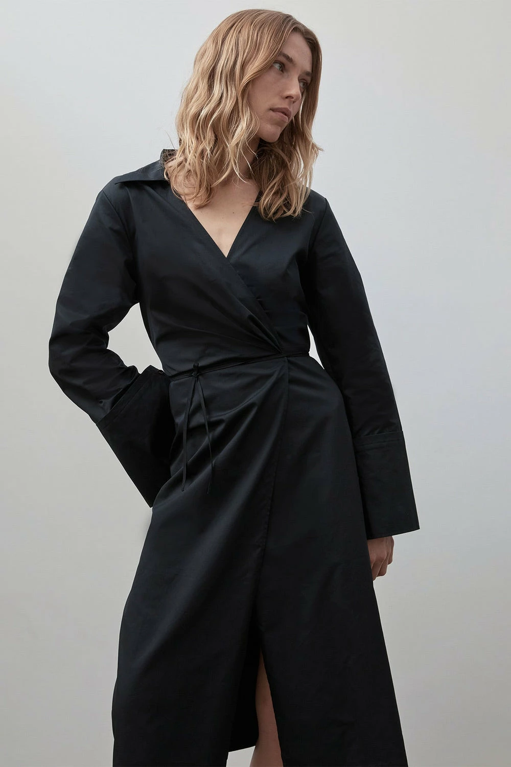 Designed around the elegance of wrap detailing, the Wrap Dress combines the sophistication of vintage corporate styling with the ingenuity of a modern approach. Boasting a v-neckline, wide, split-cuff detail and midi hem, the Wrap Dress is a demure option for both everyday and occasional dressing. The Wrap Dress� tie-up waist, cinches the figure for a universally flattering fit.�