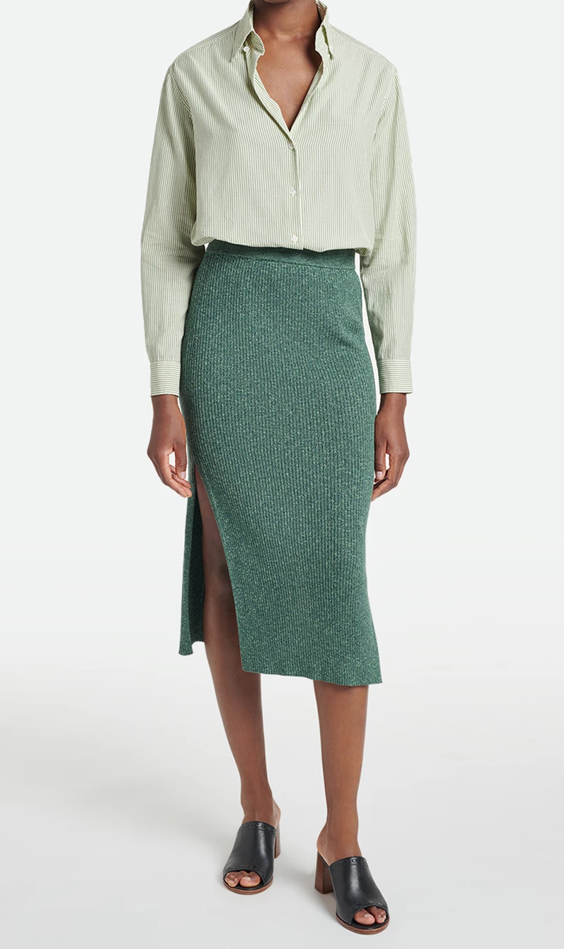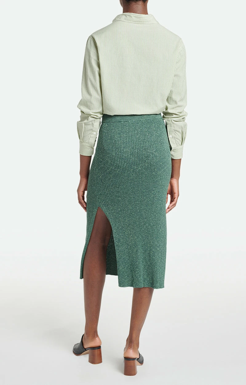The Vanessa Bruno Agnes skirt in Vert is a versatile midi-length skirt that is perfect for all occasions. Designed with a speckled ribbed fabric, this skirt is perfect for both business and casual. Pair with a white singlet for a relaxed summer look.Â