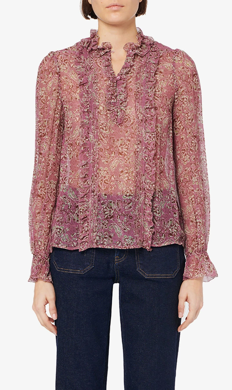 The Vanessa Bruno Shadey blouse in Crocus. The most charming of blouses, in watercolour flower print. Feautring a slit neckline, fastened with button and loop, Long sleeves and Cuffs with buttons and ruffles.