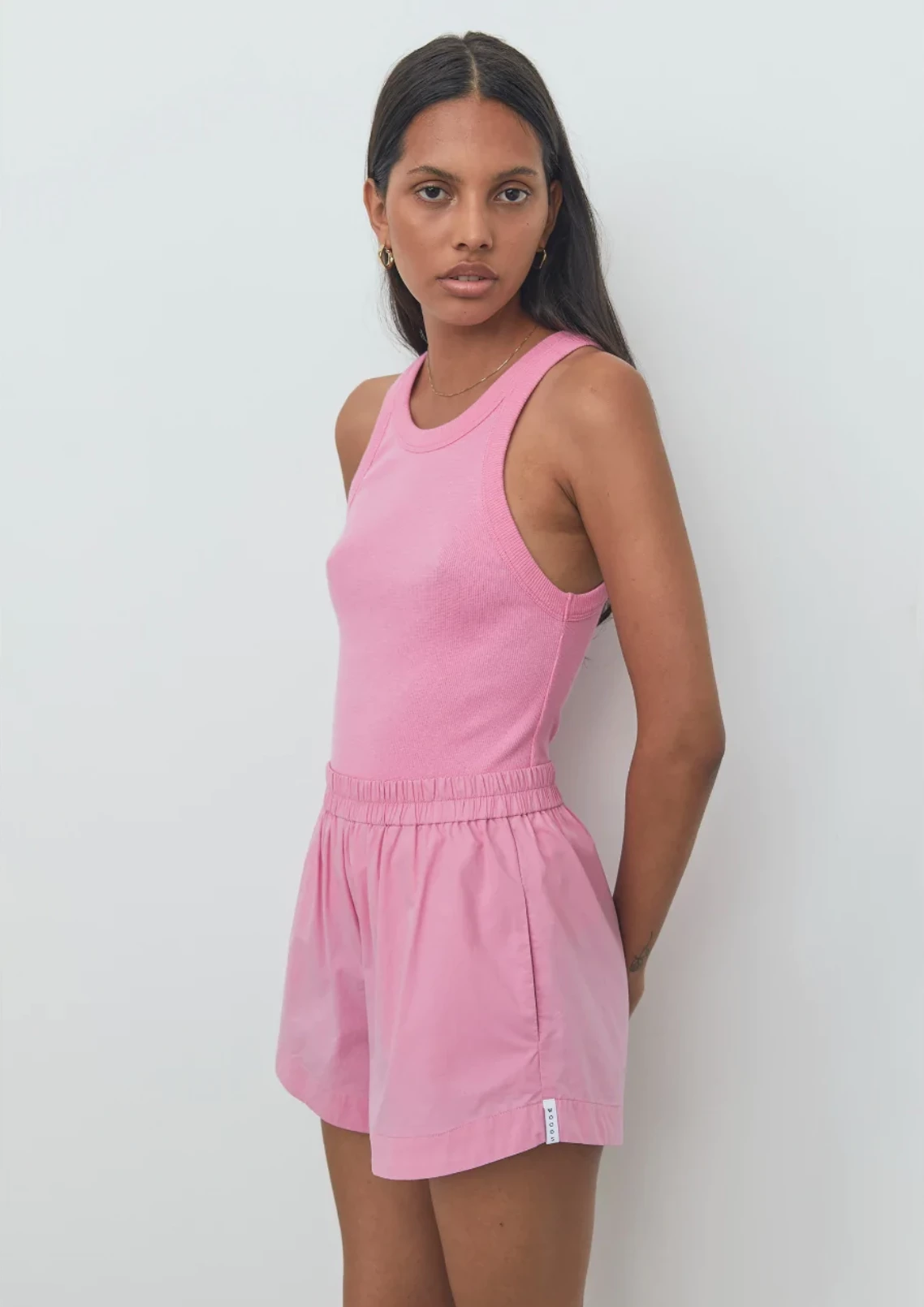 The Lorne Tank from Viktoria And Woods is rendered from their signature 2×2 organic cotton rib knitted in Melbourne and showcasing a rich chocolate brown. This high neck fitted style is designed with a wide binding trim with a flattering scooped neck and arms. This piece can be worn on its own in the warmer months and is also perfect as a base layer on cooler days.