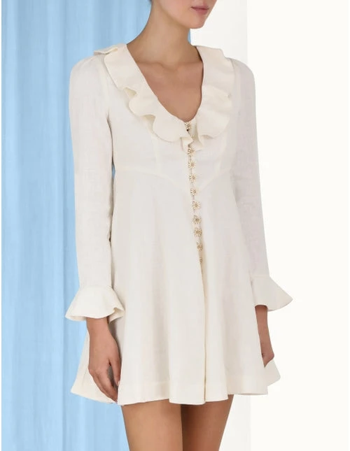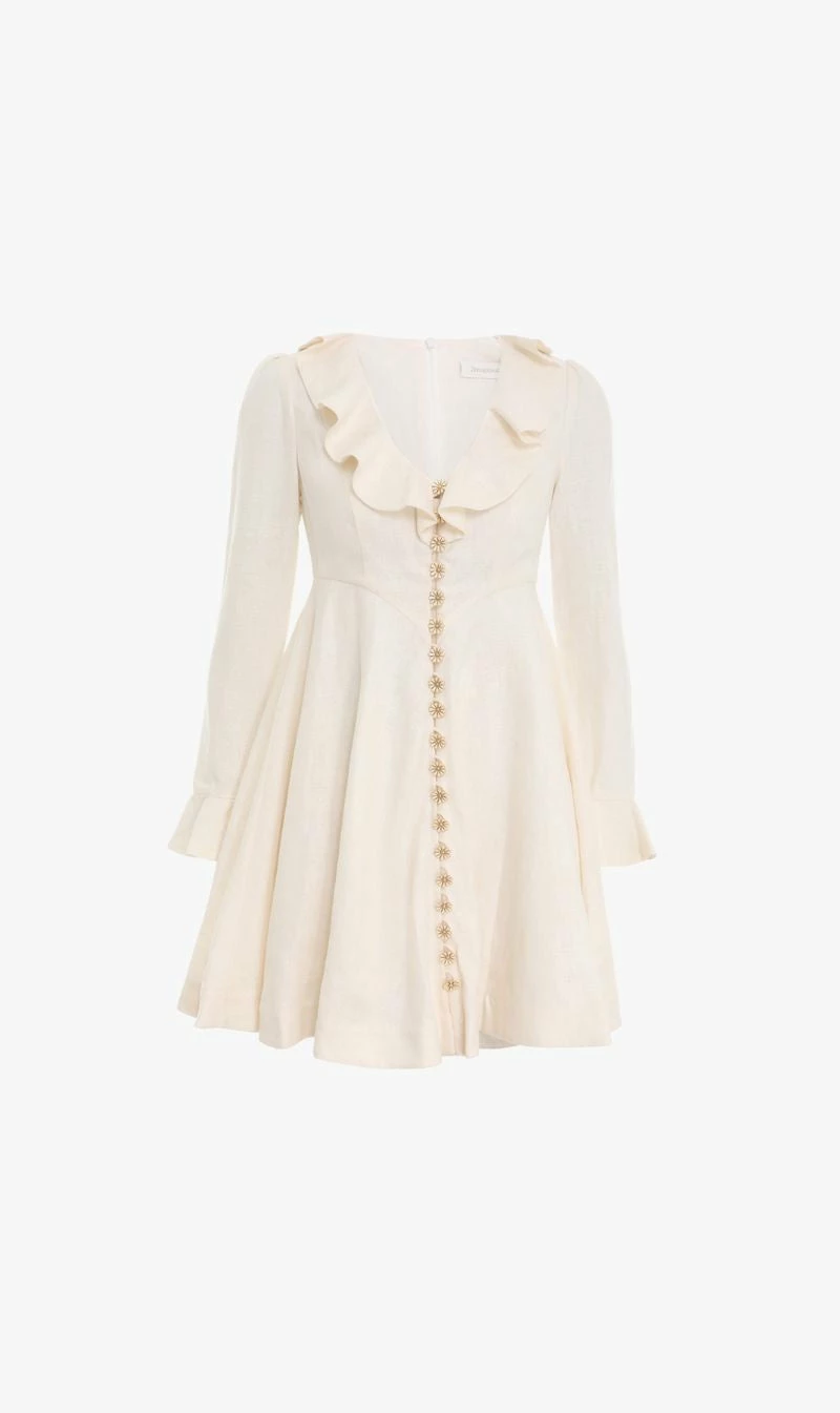 Zimmermanns’ Daisy Mini Dress in Cream features mini daisy hardware buttons down the middle formulated from 100% linen.