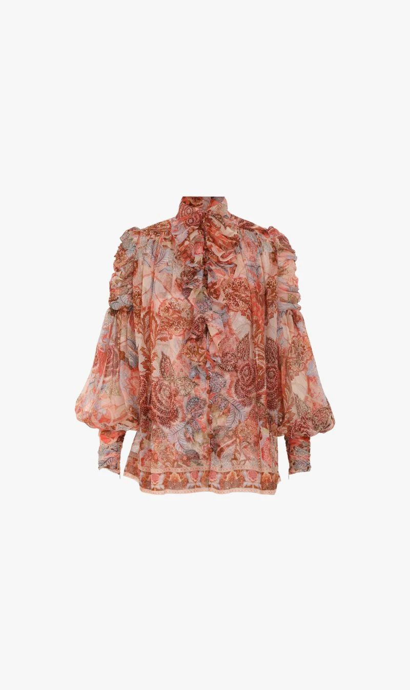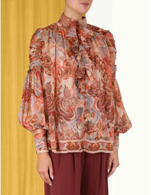 The Kaleidoscope Lantern Blouse in Terracotta by Zimmermann is a silk top starring a gathered high neck and orange statement buttons down the centre.