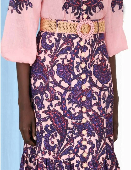 The Tiggy Frill Hem Midi Skirt by Zimmermann captures the true summer spirit. Crafted in the brand’s fabulous Lilac/Pink Paisley from their Resort Swim 2023 Collection, this beautiful linen midi skirt features a fit-and-flare silhouette and removable belt, finished with buttons down the centre front and crochet beaded trims. Pair with a simple white tank for polished summer style.Â
